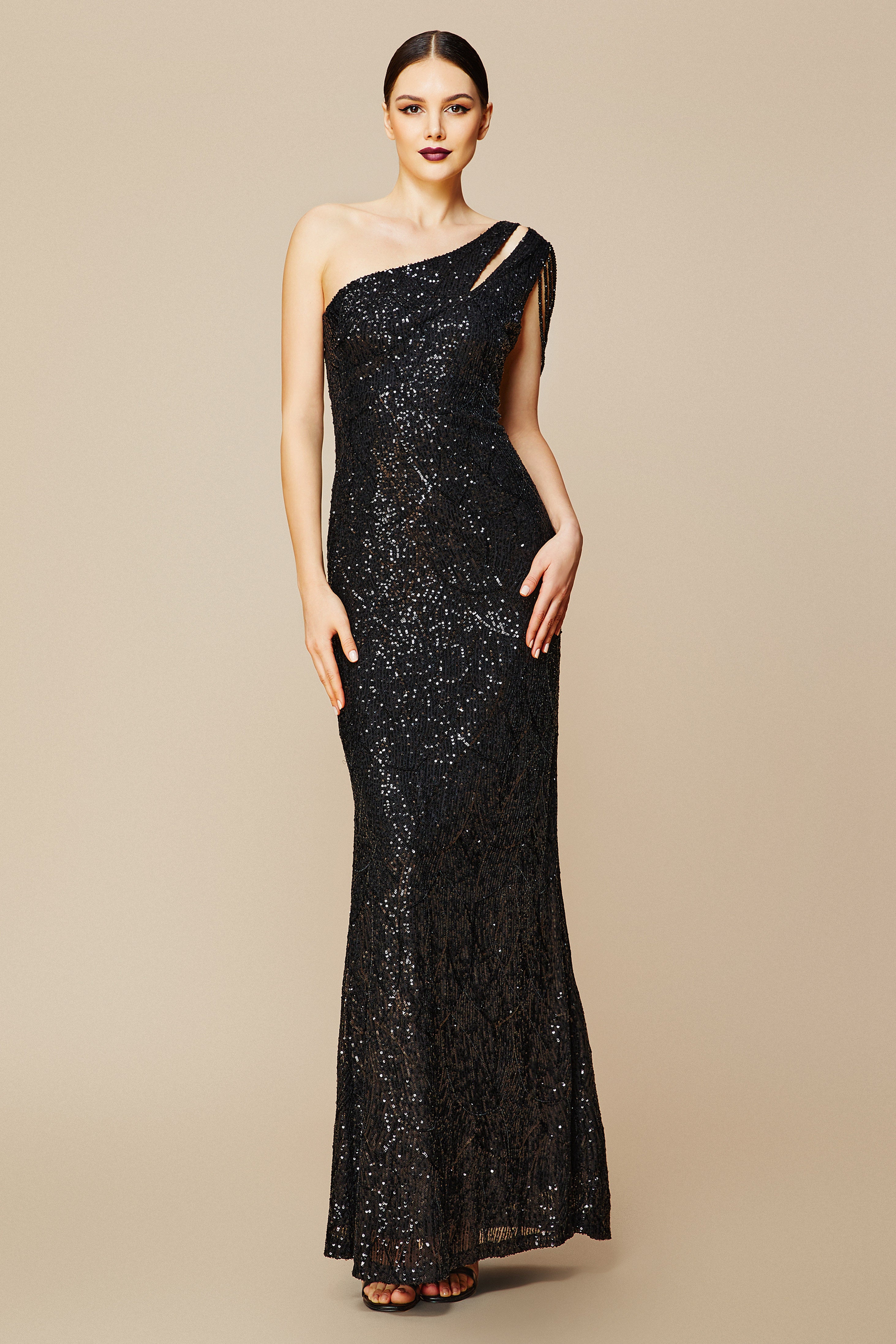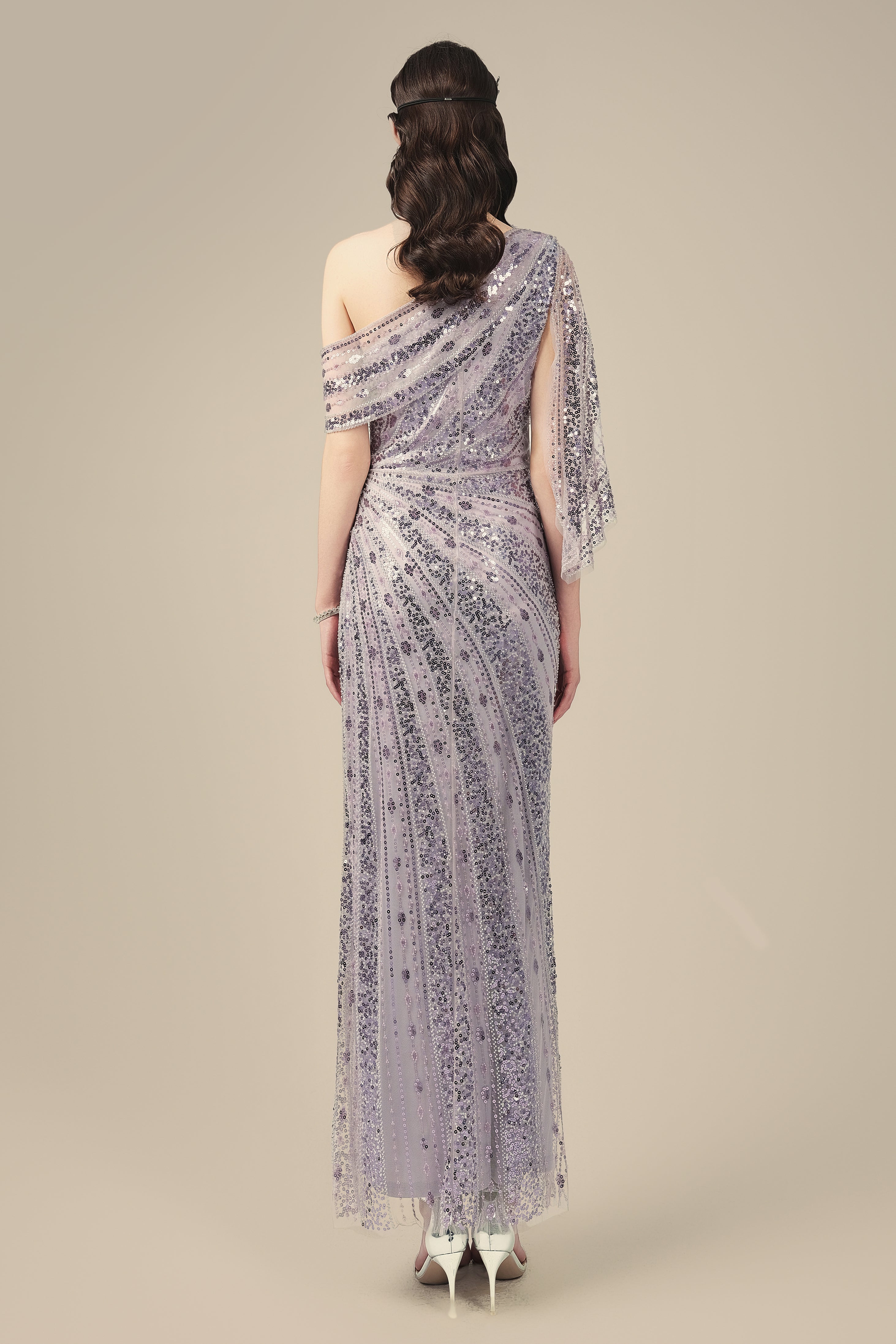 Glittering Sheer-Sleeve Sequined Evening Gown
