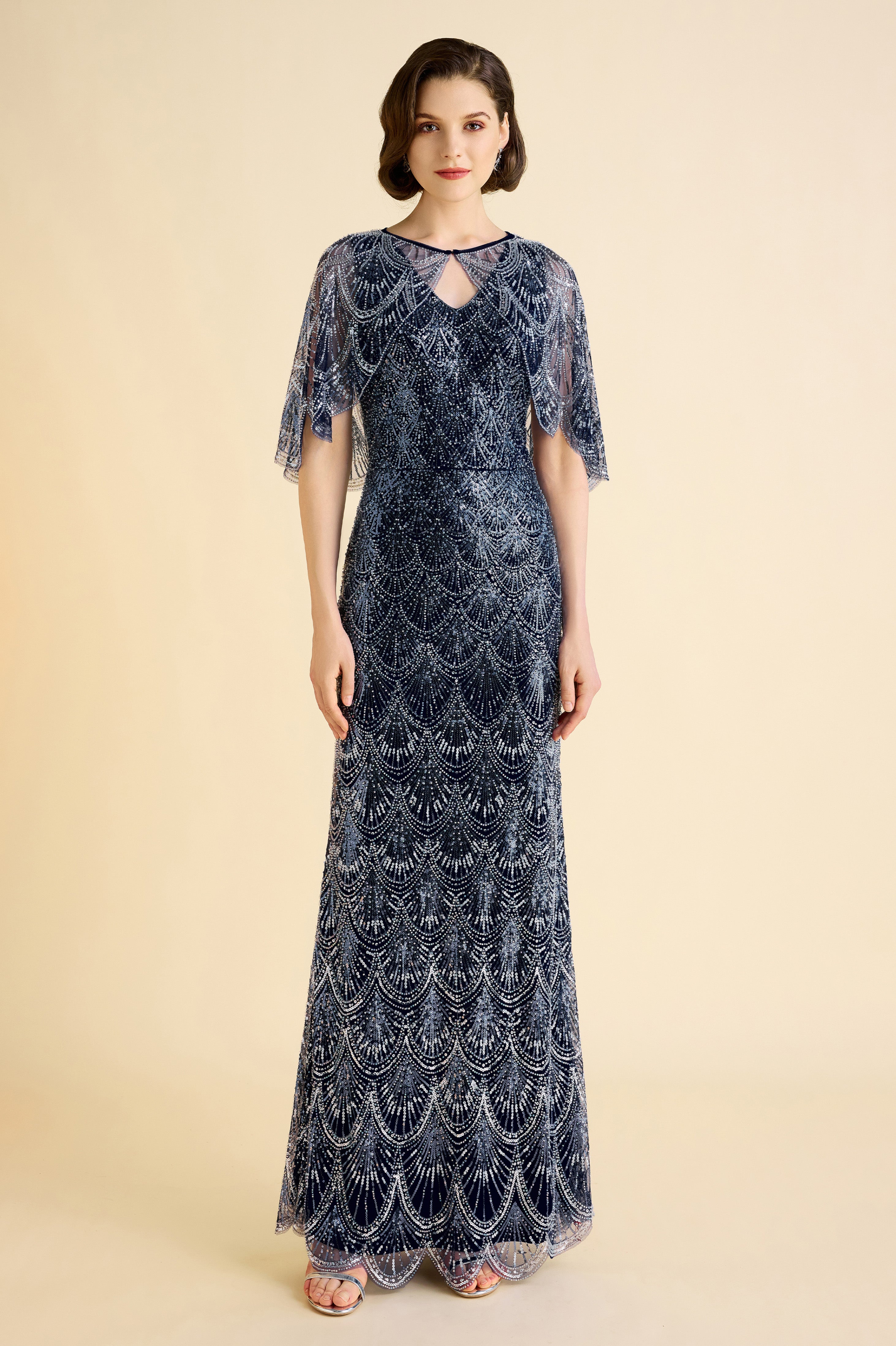 Sapphire Symphony Cape-Sleeve Evening Gown