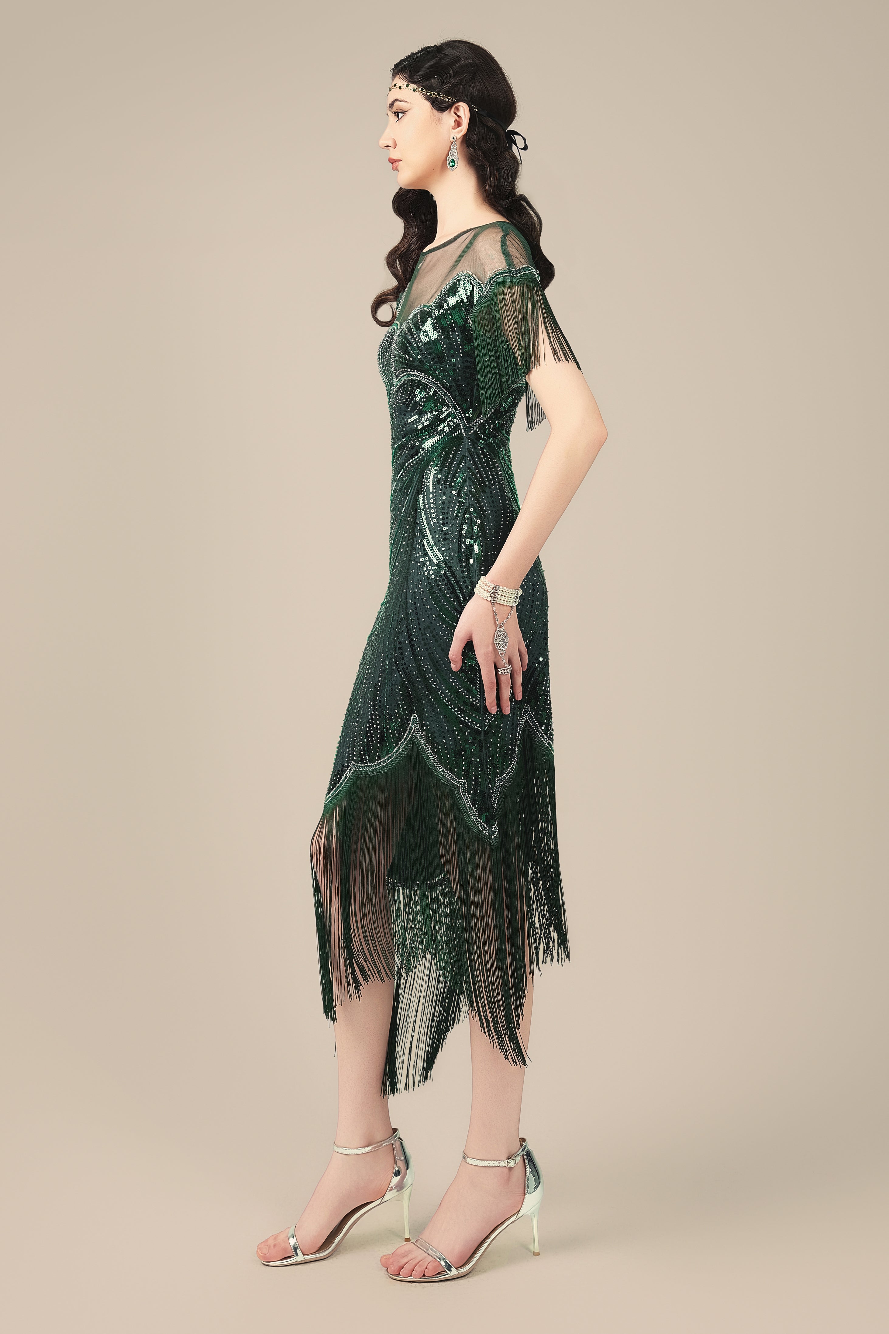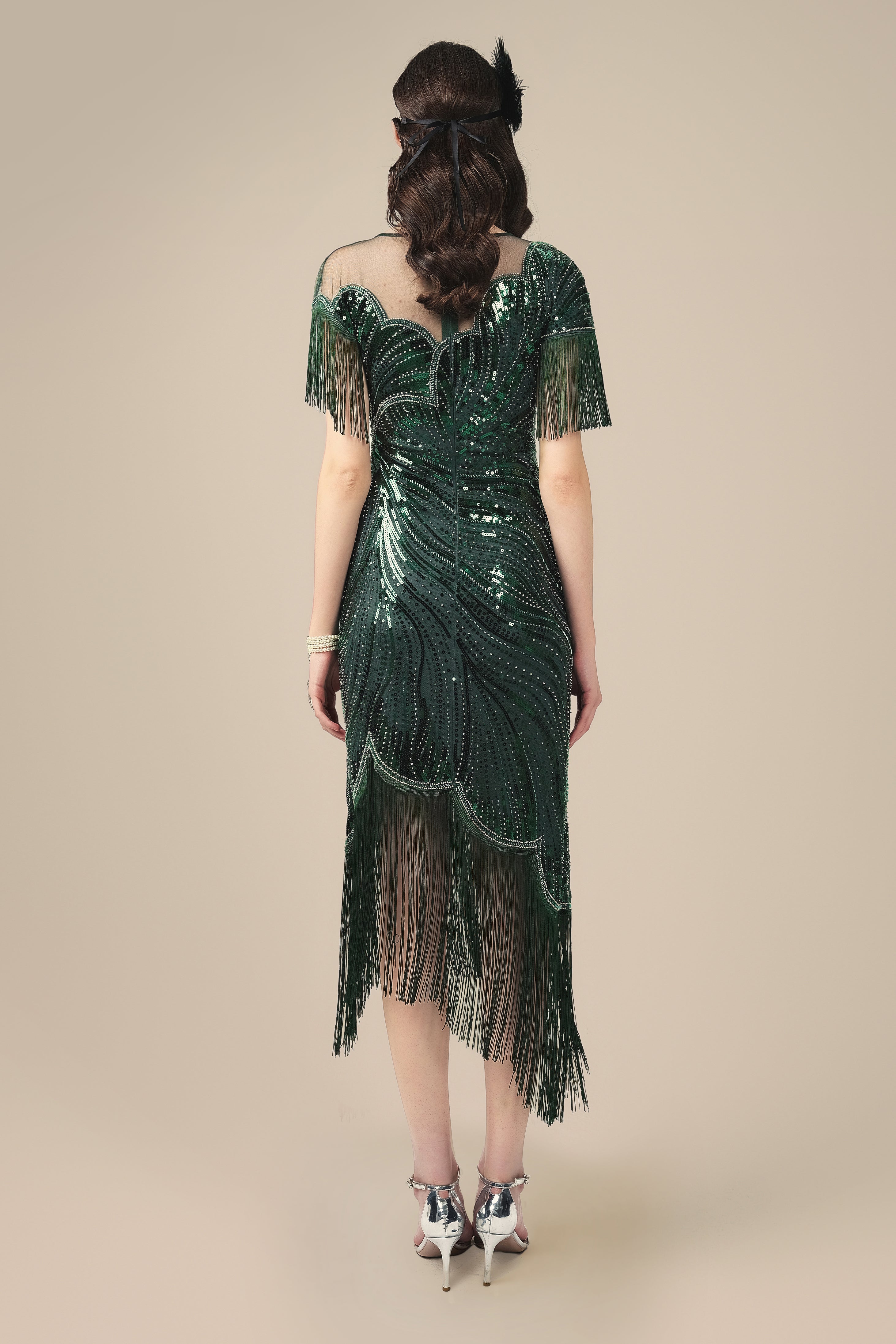 Bold yet graceful, this flapper dress reimagines 1920s glamour with a unique floral twist. The neckline and hemline are sculpted into soft, petal-like curves, creating a blooming silhouette against a backdrop of shimmering sequins. Layered fringe sways with every step, adding movement and mystery. Finished with sheer mesh and tailored shaping, it's a showstopping piece made for moonlit dancing and vintage elegance.