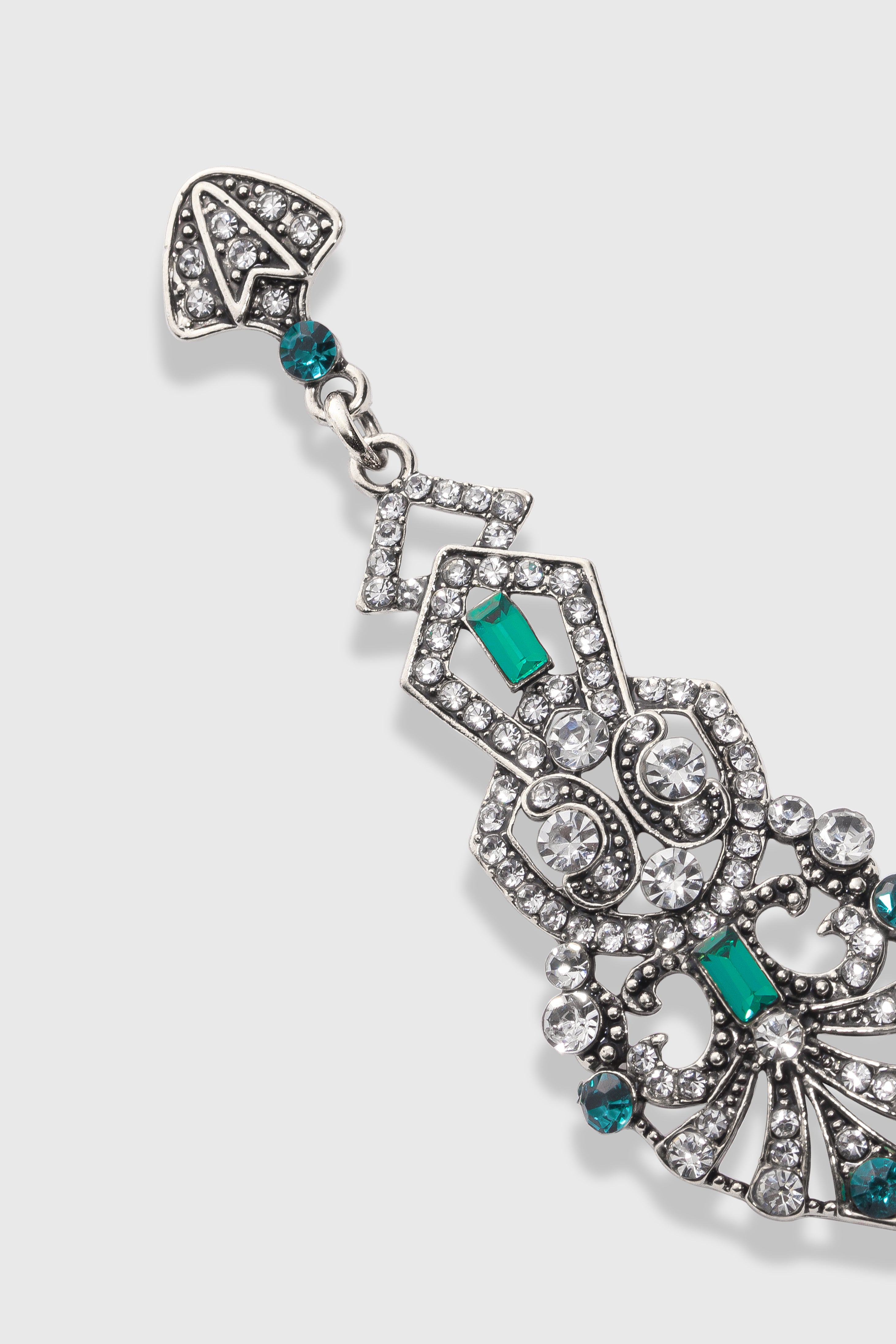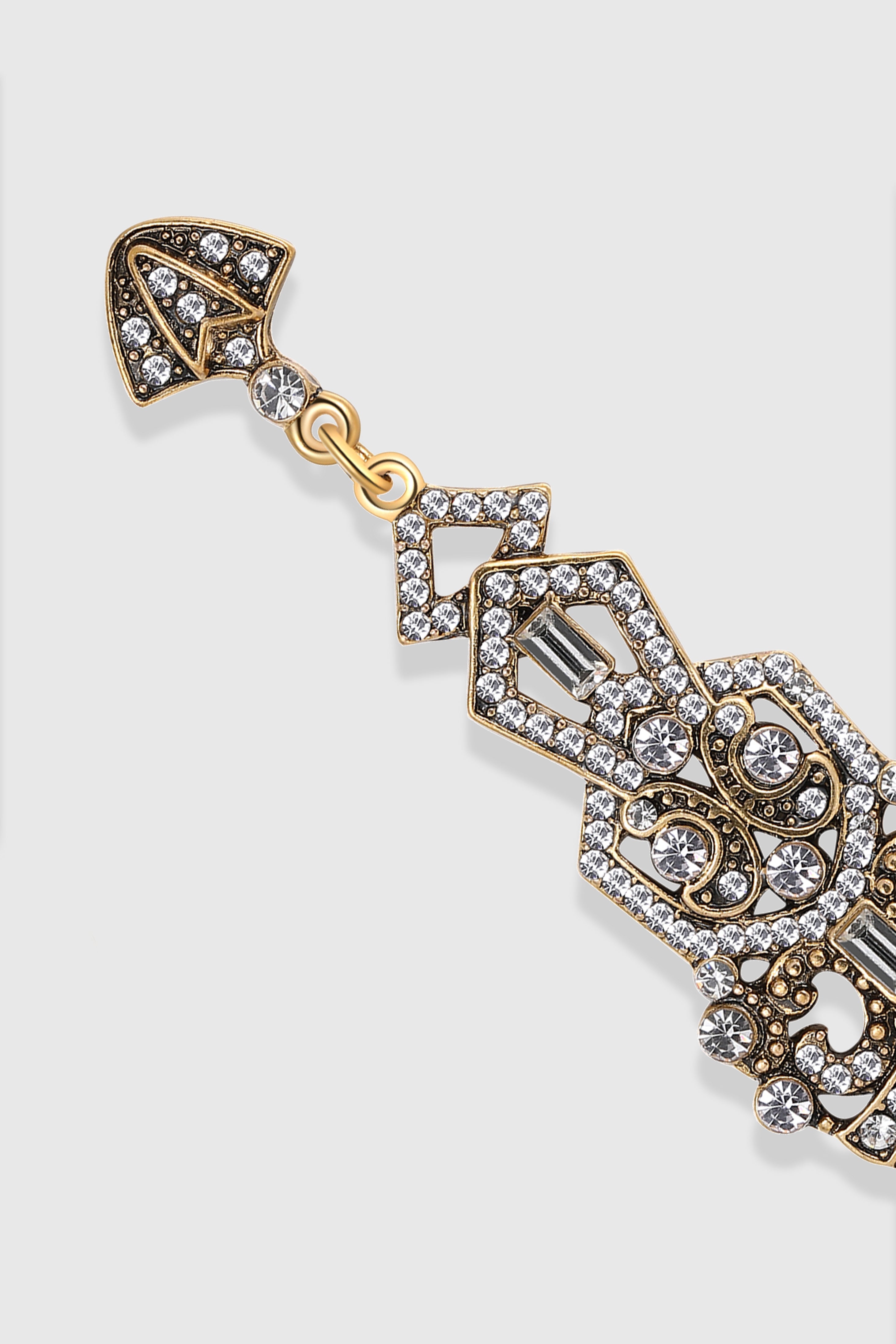This sumptuous piece of jewelry features a retro-elegant yet slightly modern style that complements the lavish garments, reminiscent of the roaring 1920s.