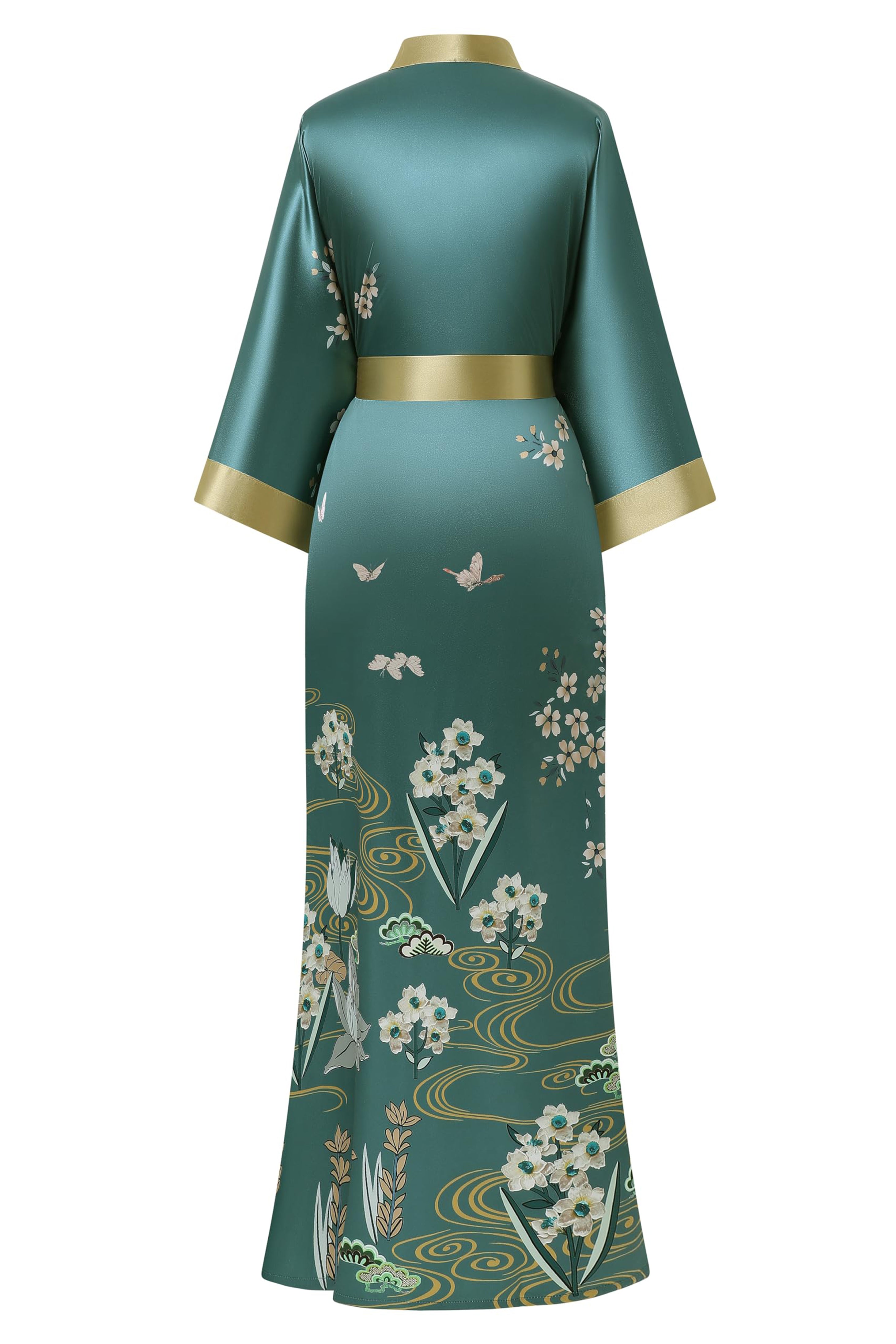 Wrap yourself in this sumptuous teal satin kimono adorned with hand-embroidered golden botanicals and fluttering butterflies, blending a flowing silhouette with self-tied sash elegance for moments of repose or grandeur.