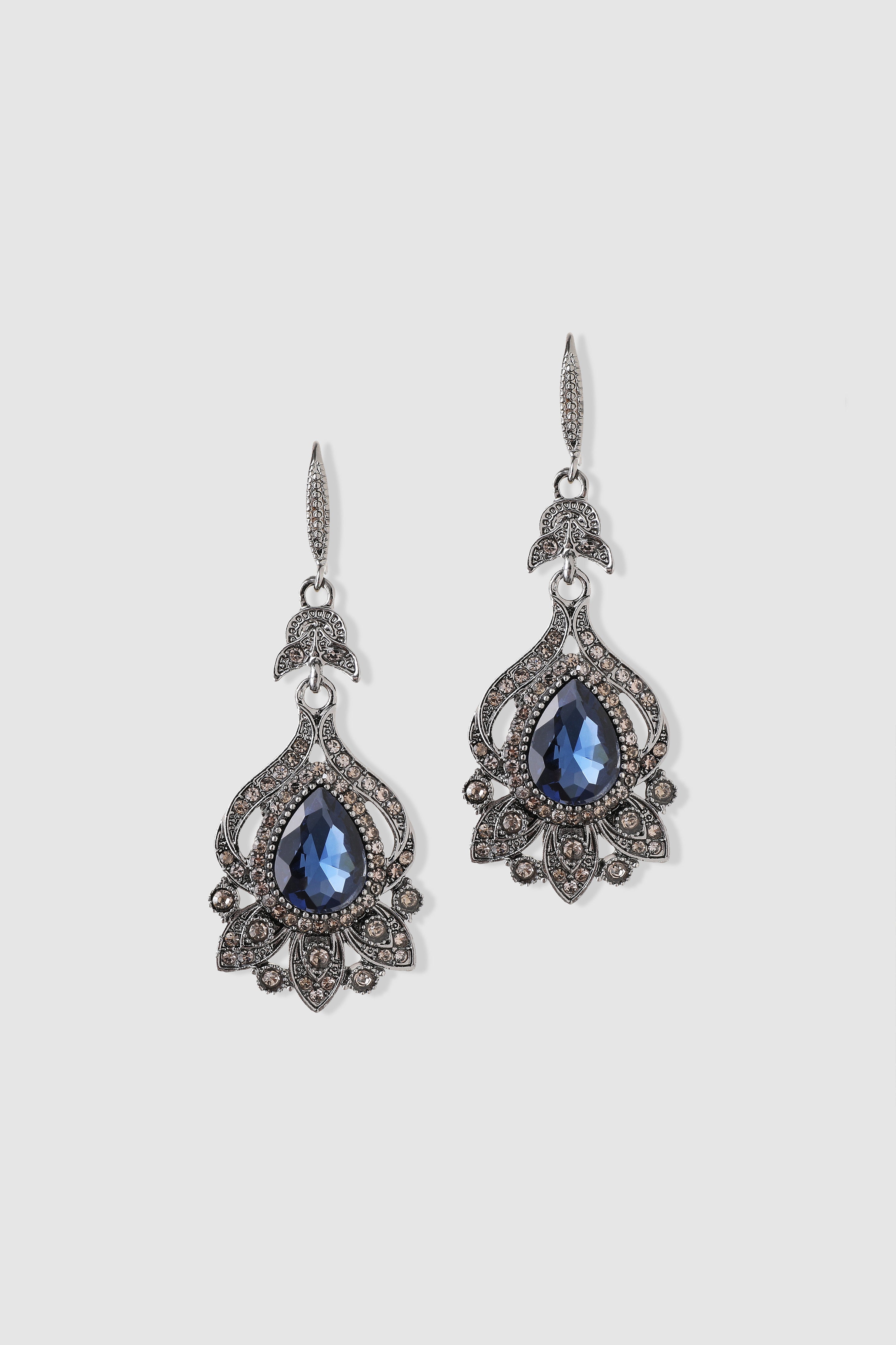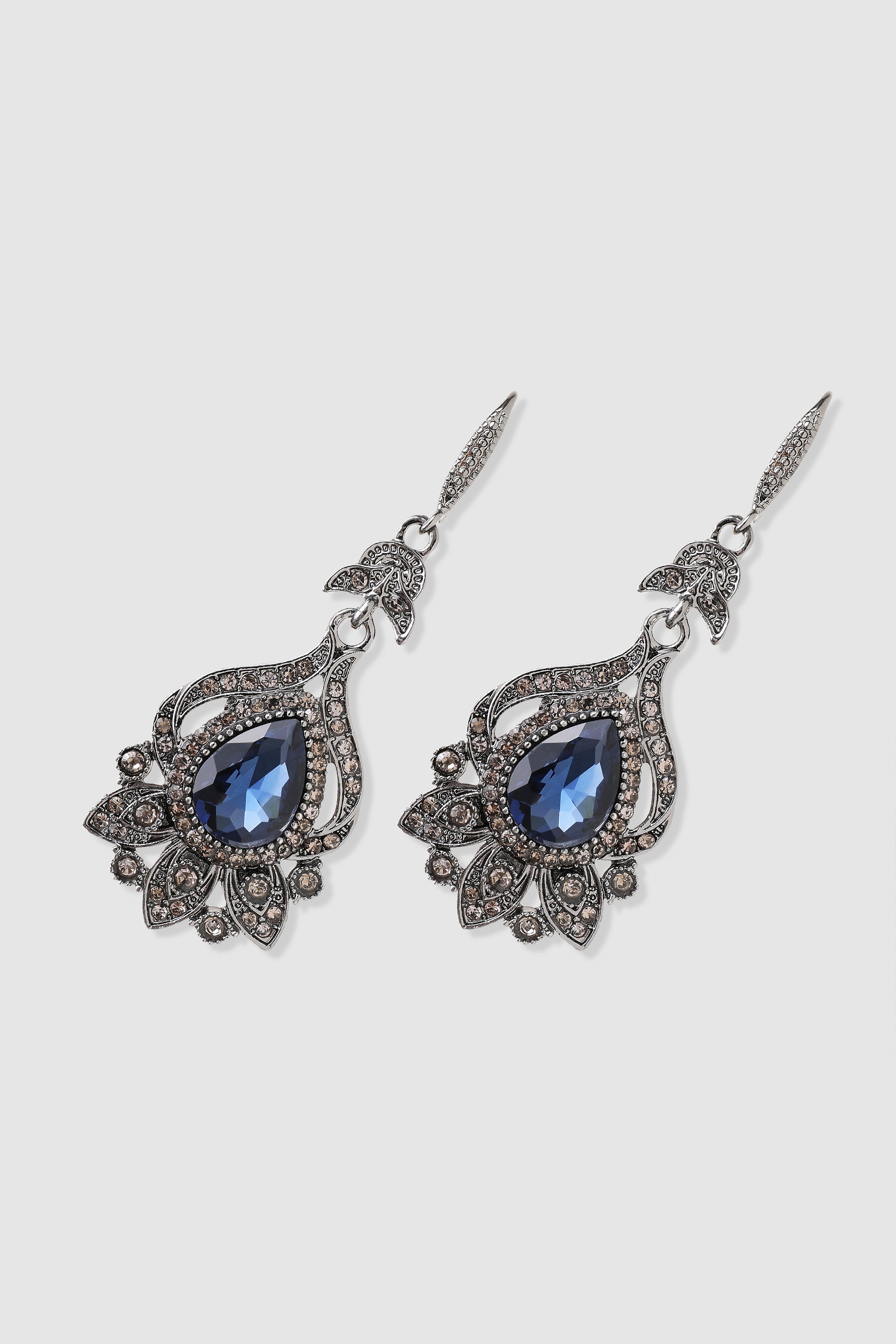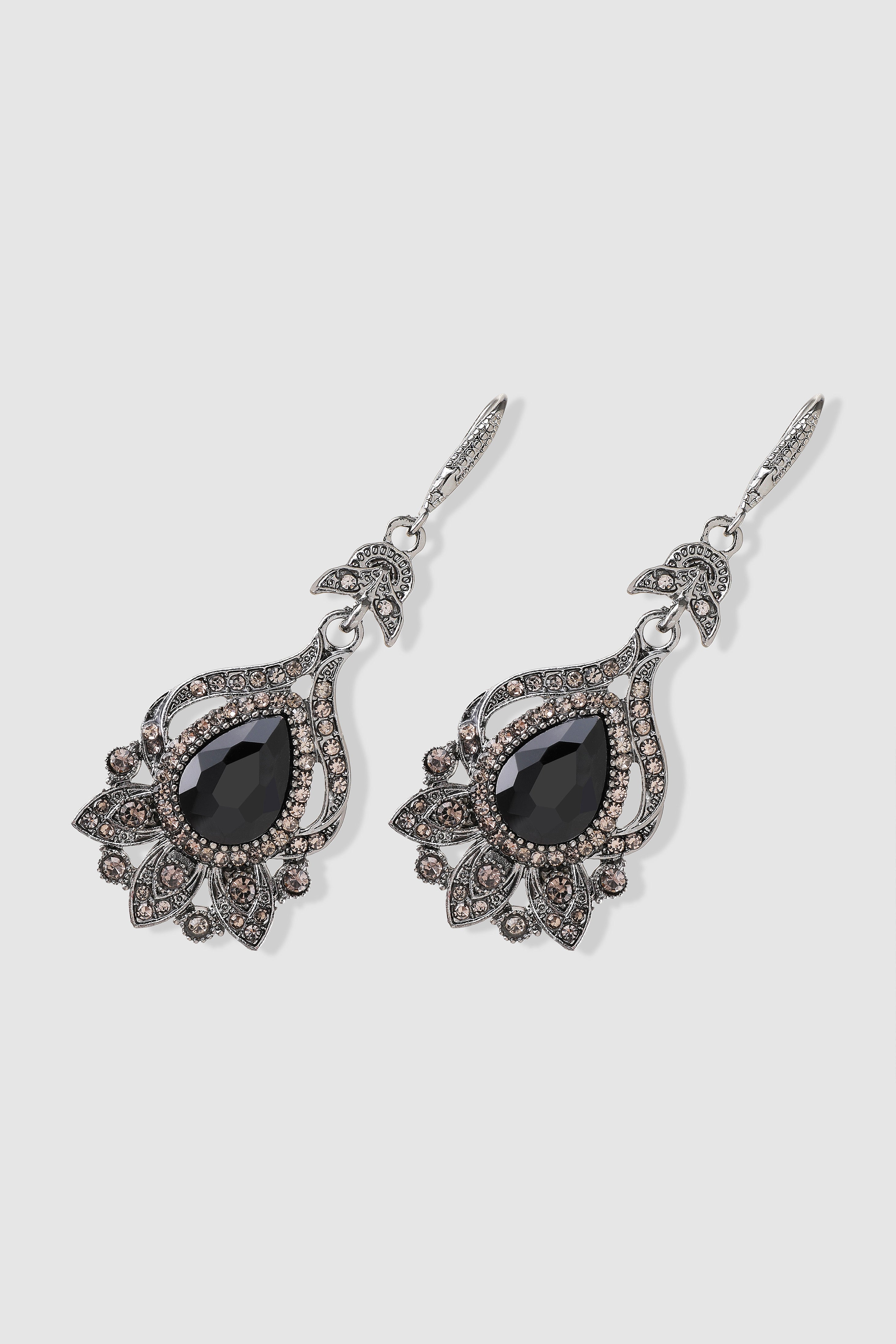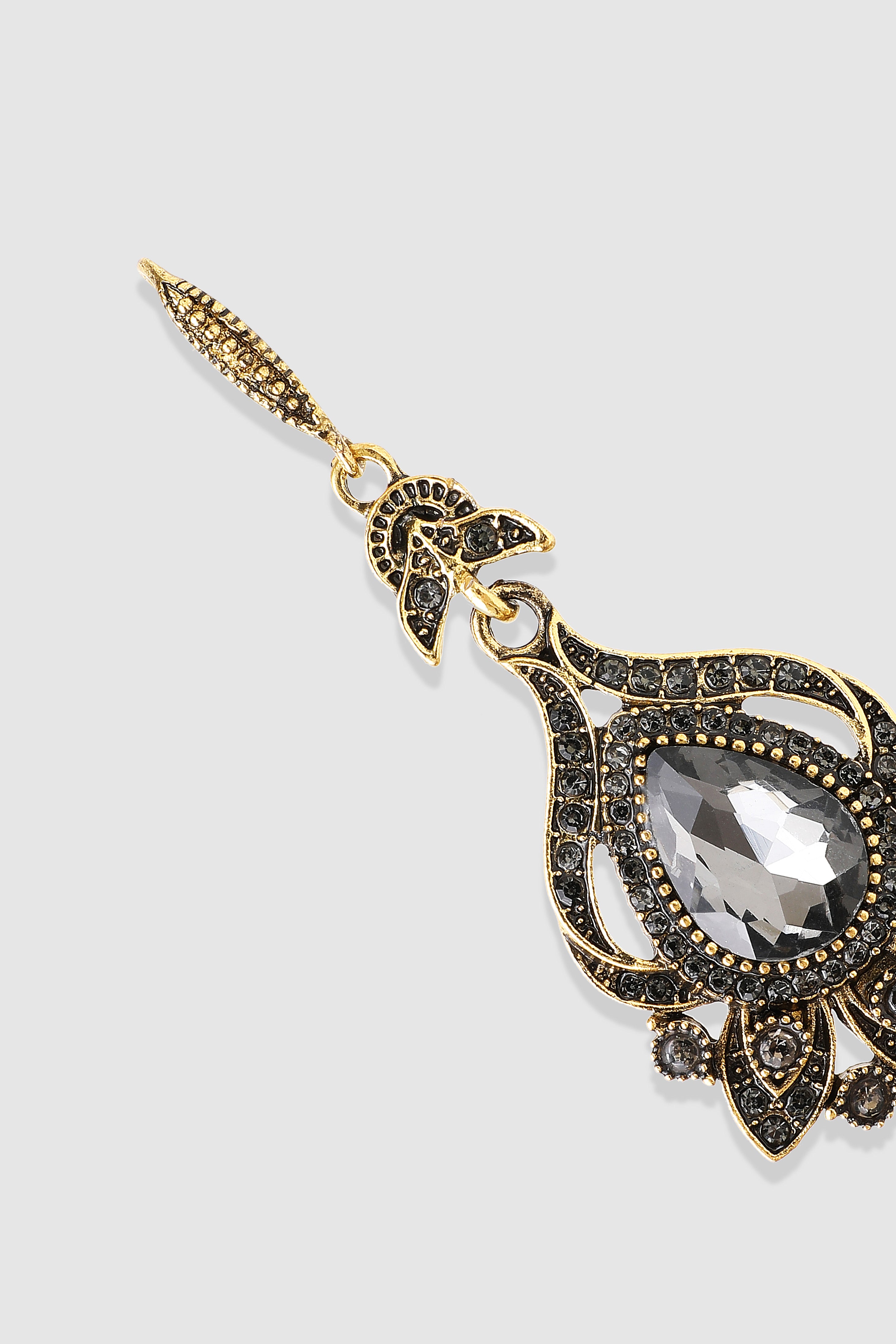 The vintage-inspired dangle earrings feature intricate filigree designs adorned with shimmering crystals. A bold teardrop crystal takes center stage, surrounded by delicate accents that enhance their elegance.