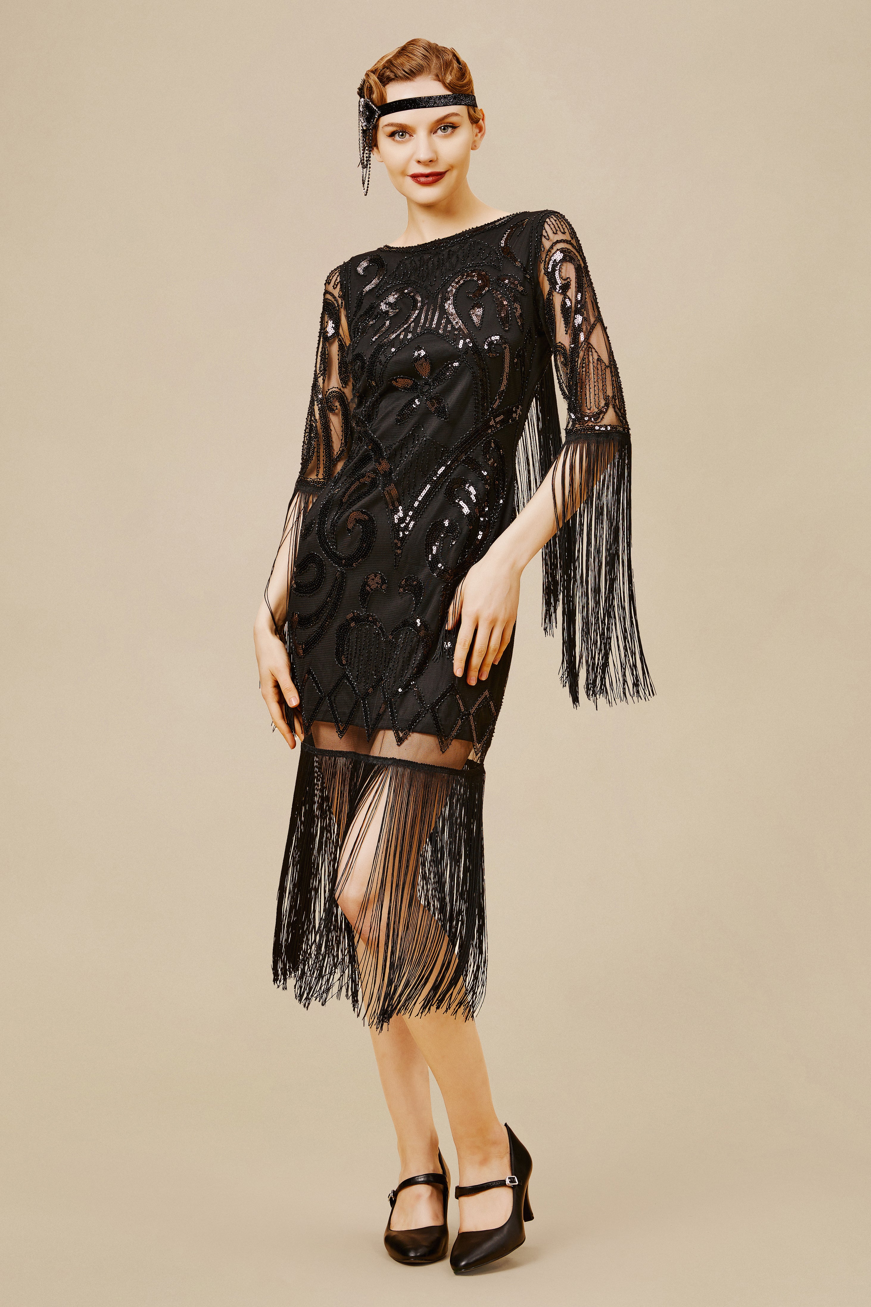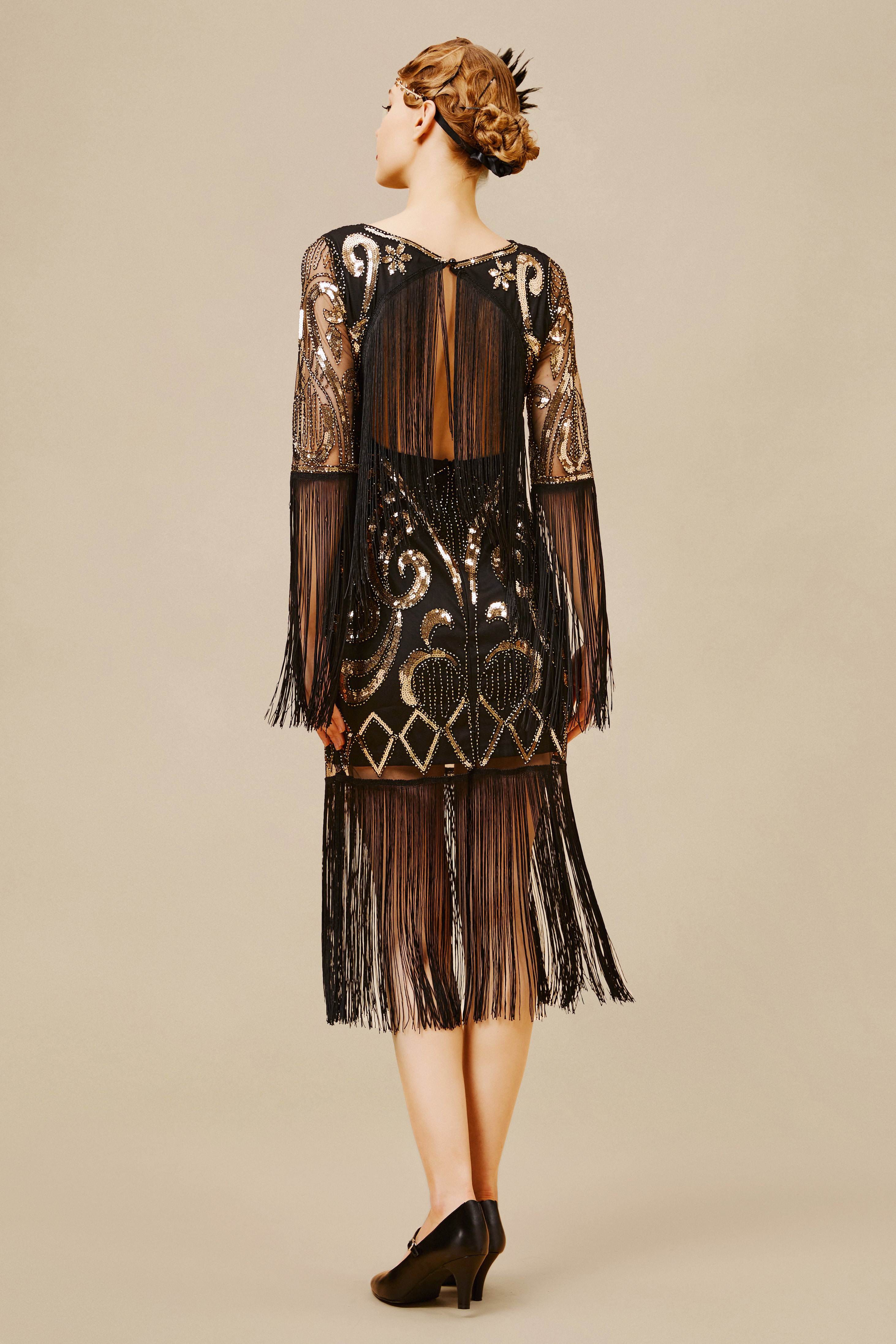 This elegant dress is classic vintage look for a modern woman. The eyecatching design features art deco print and unique vintage style which bring you back to the roaring twenties.