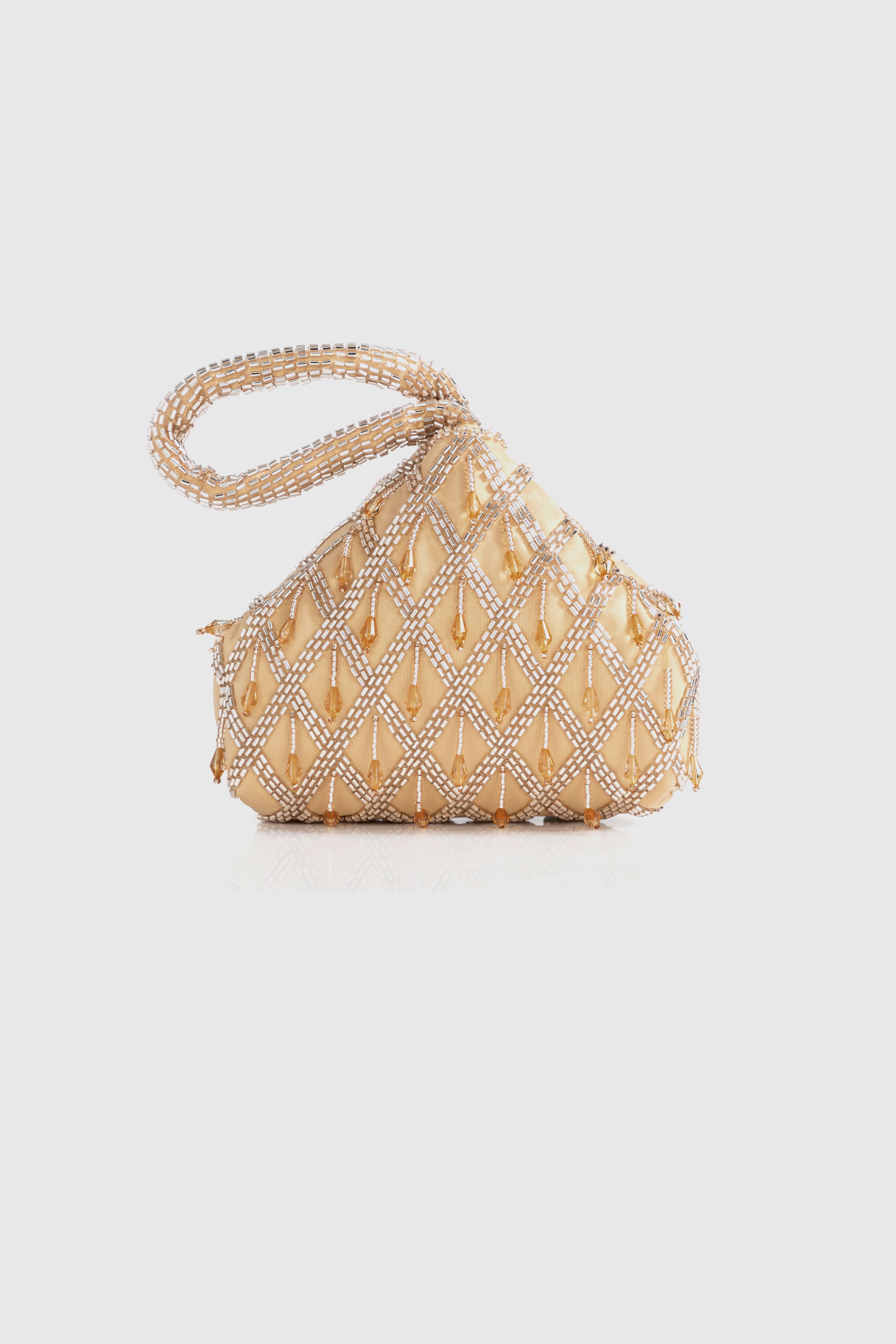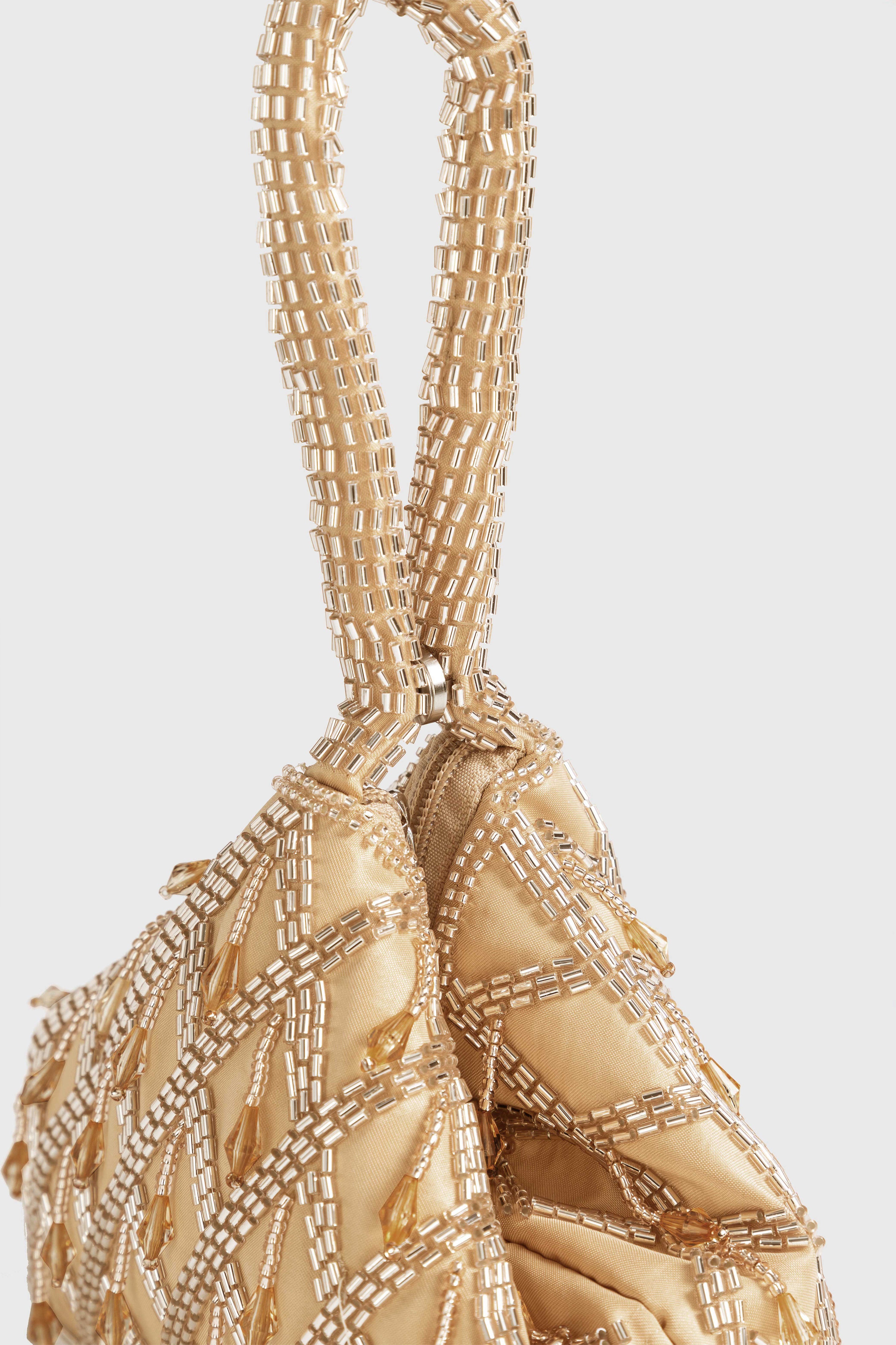 This evening clutch purse is a statement piece of Art Deco glamour, featuring a champagne satin base wrapped in intricate beadwork and cascading pendant triangle beads that add graceful movement and shimmer.