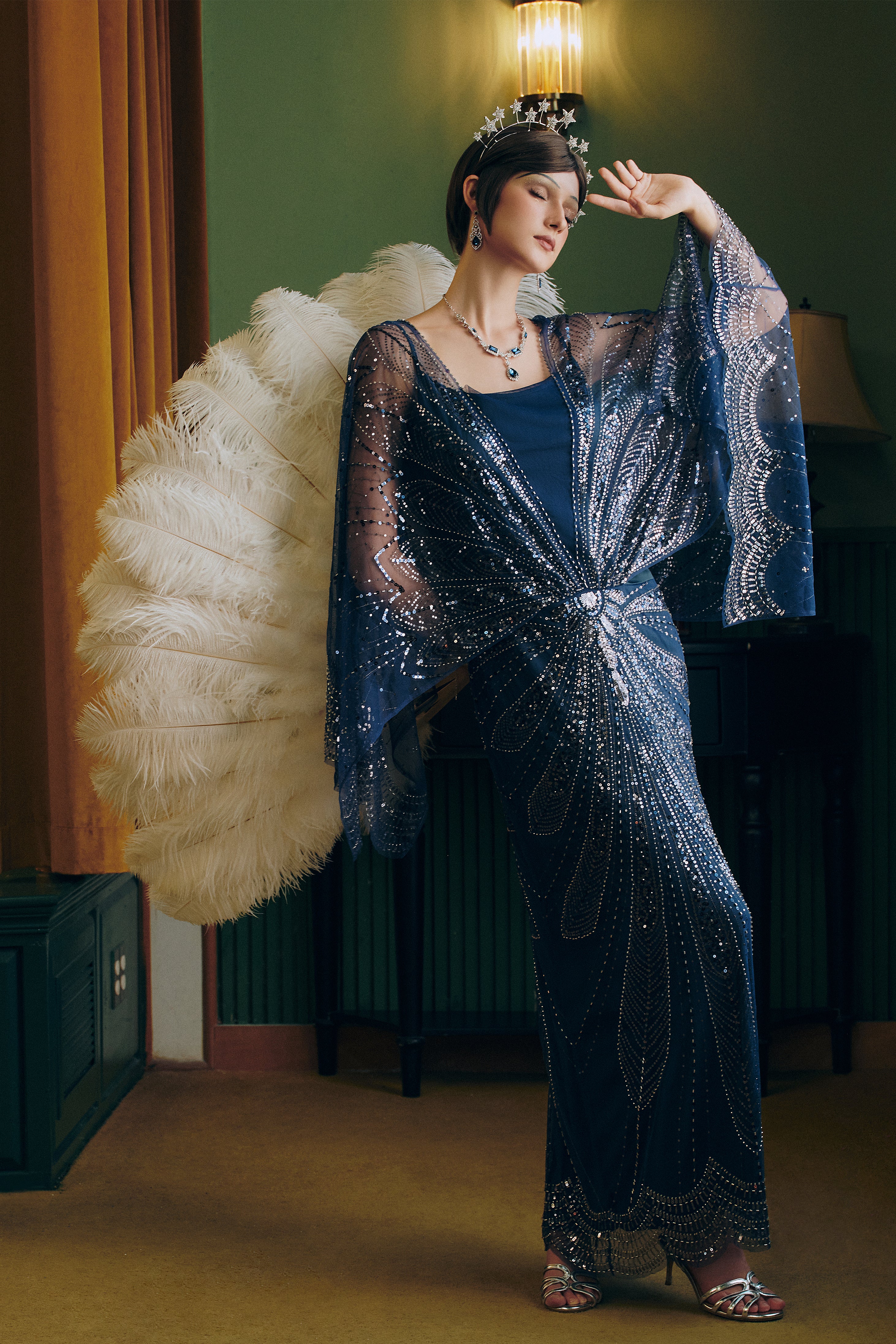 From our Ethereal Feather Collection, this evening gown takes its cues from the elegance of feather motifs. The sheer beaded cape sleeves drift with a soft, wing-like grace, creating movement that feels almost cinematic. Shimmering sequins sweep across the bodice in feathered patterns, drawing the eye toward the waist and elongating the silhouette against the depth of sapphire blue. Finished with scalloped hems that glimmer in motion.