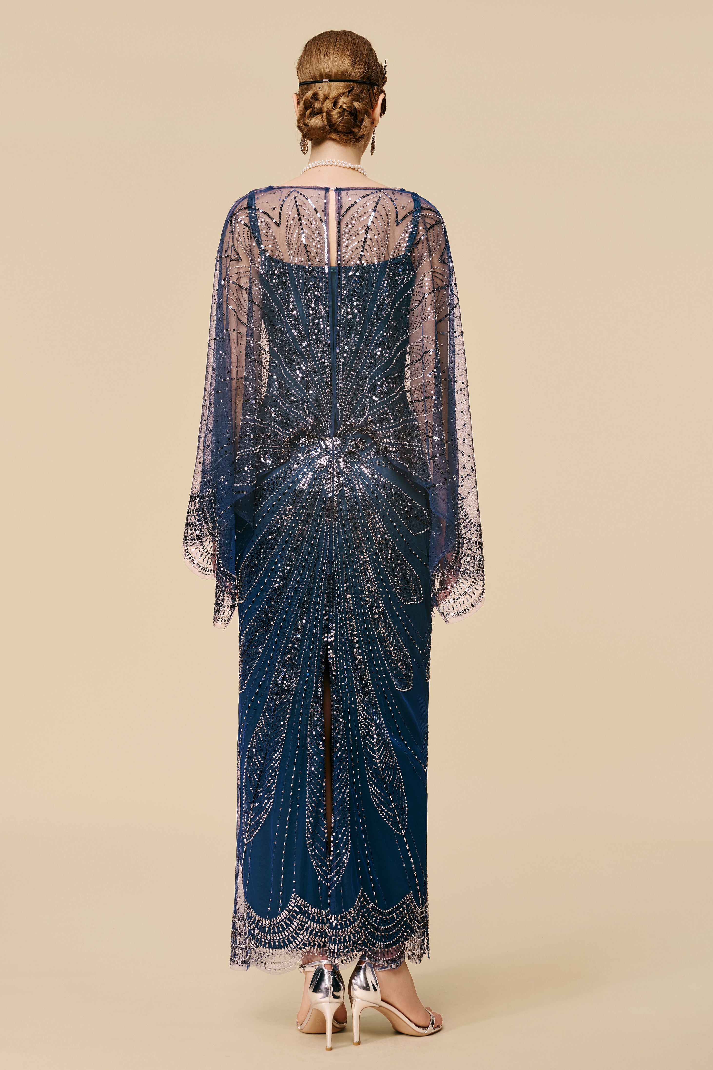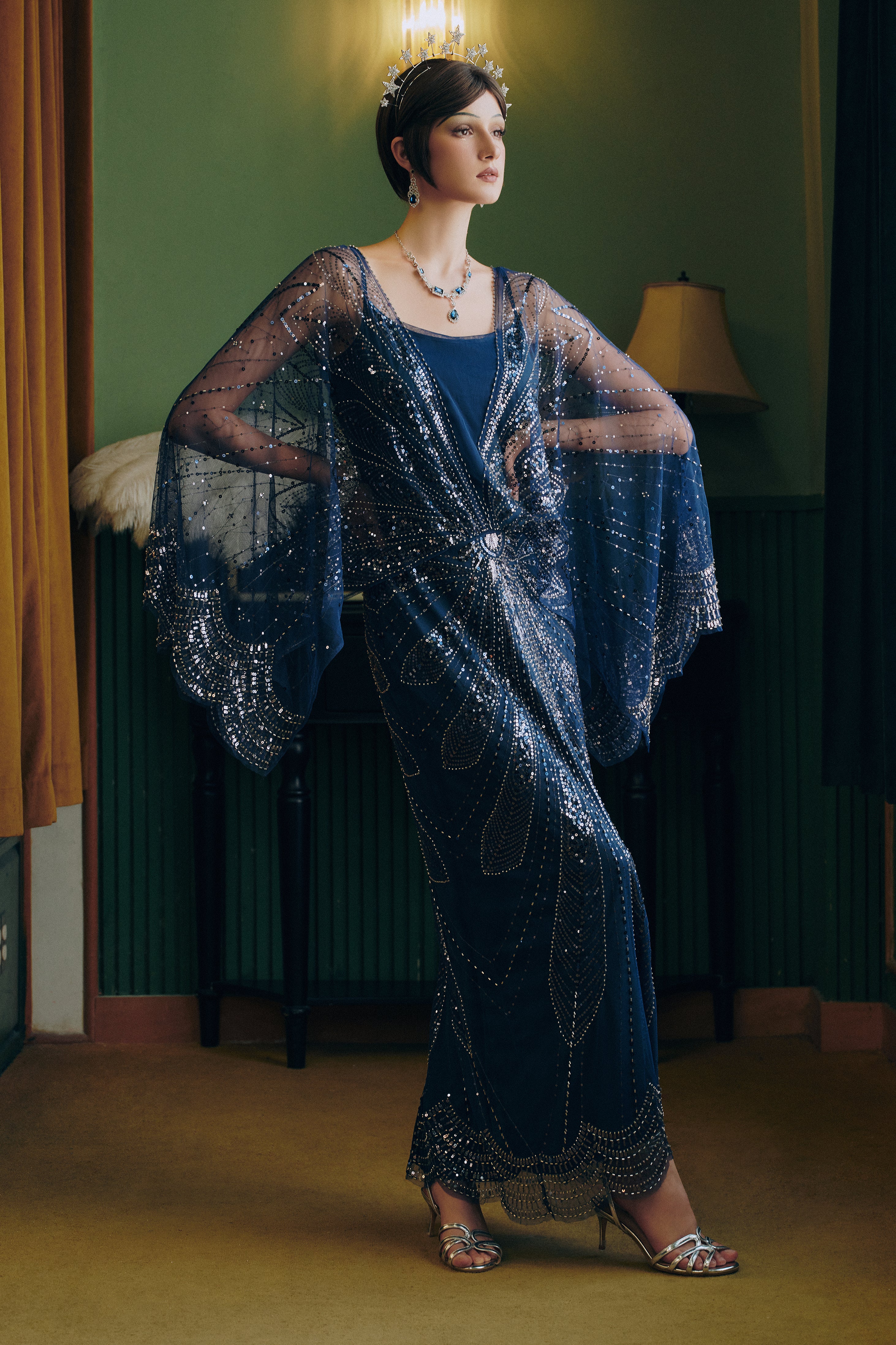 Sapphire Symphony Cape-Sleeve Evening Gown