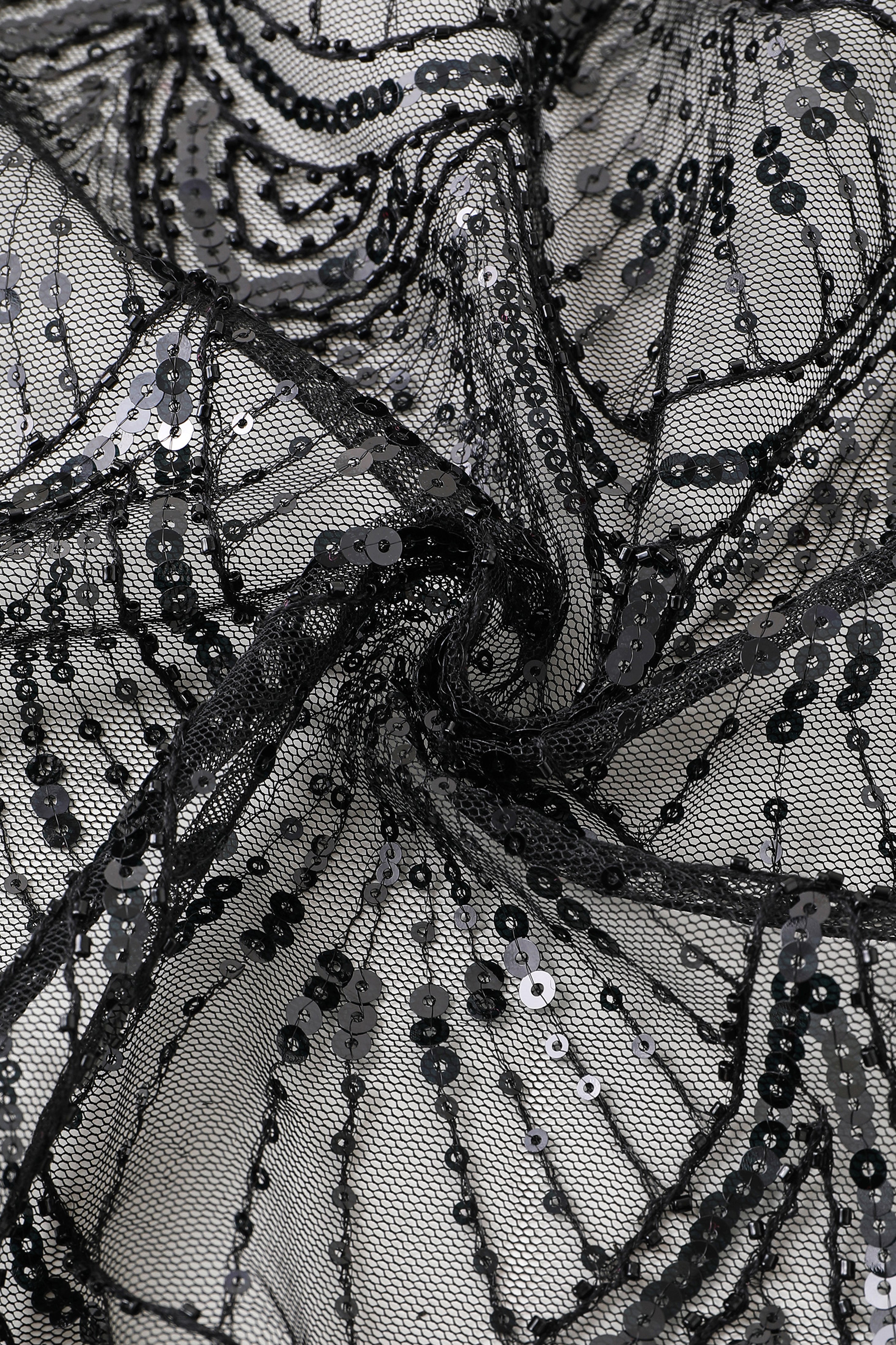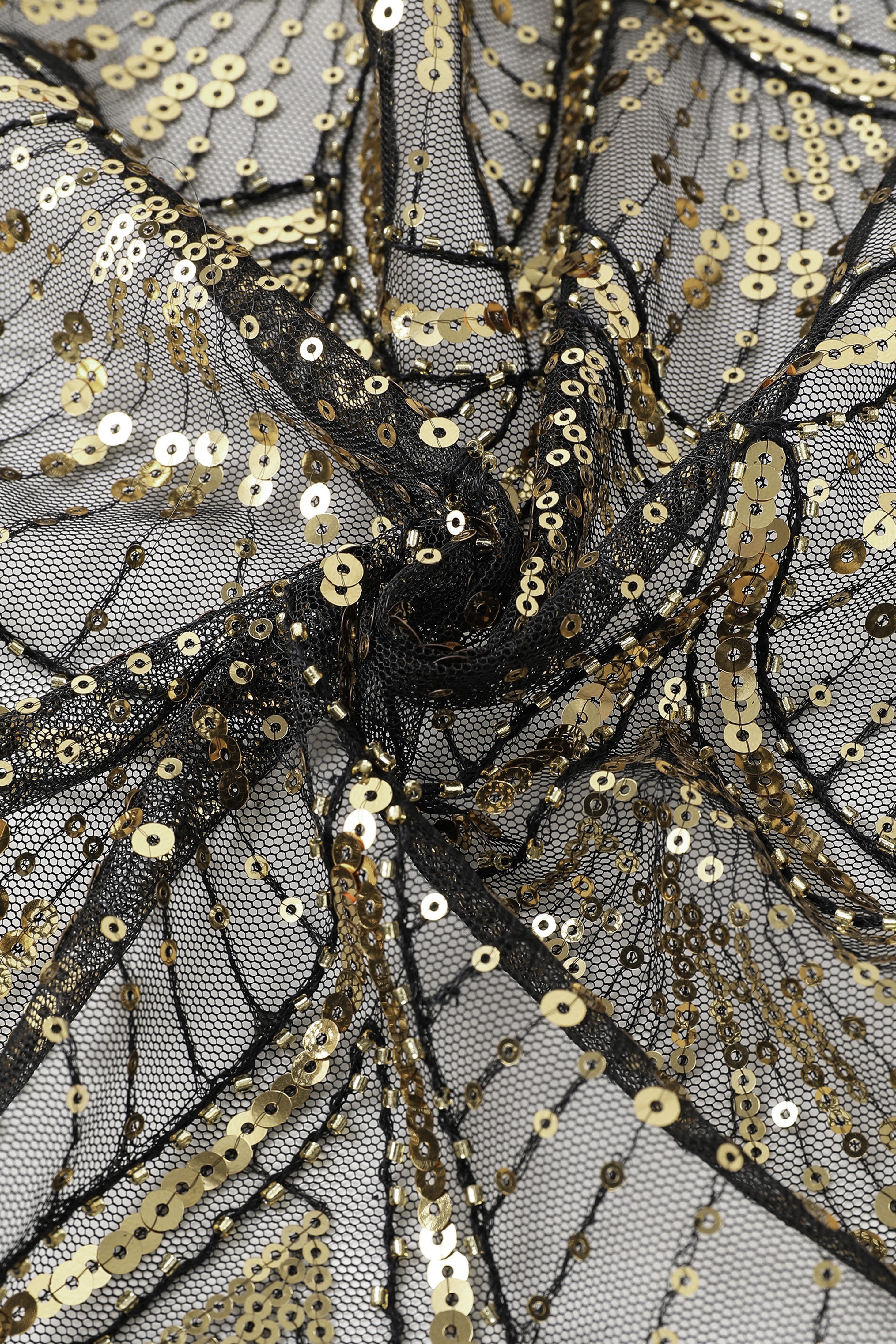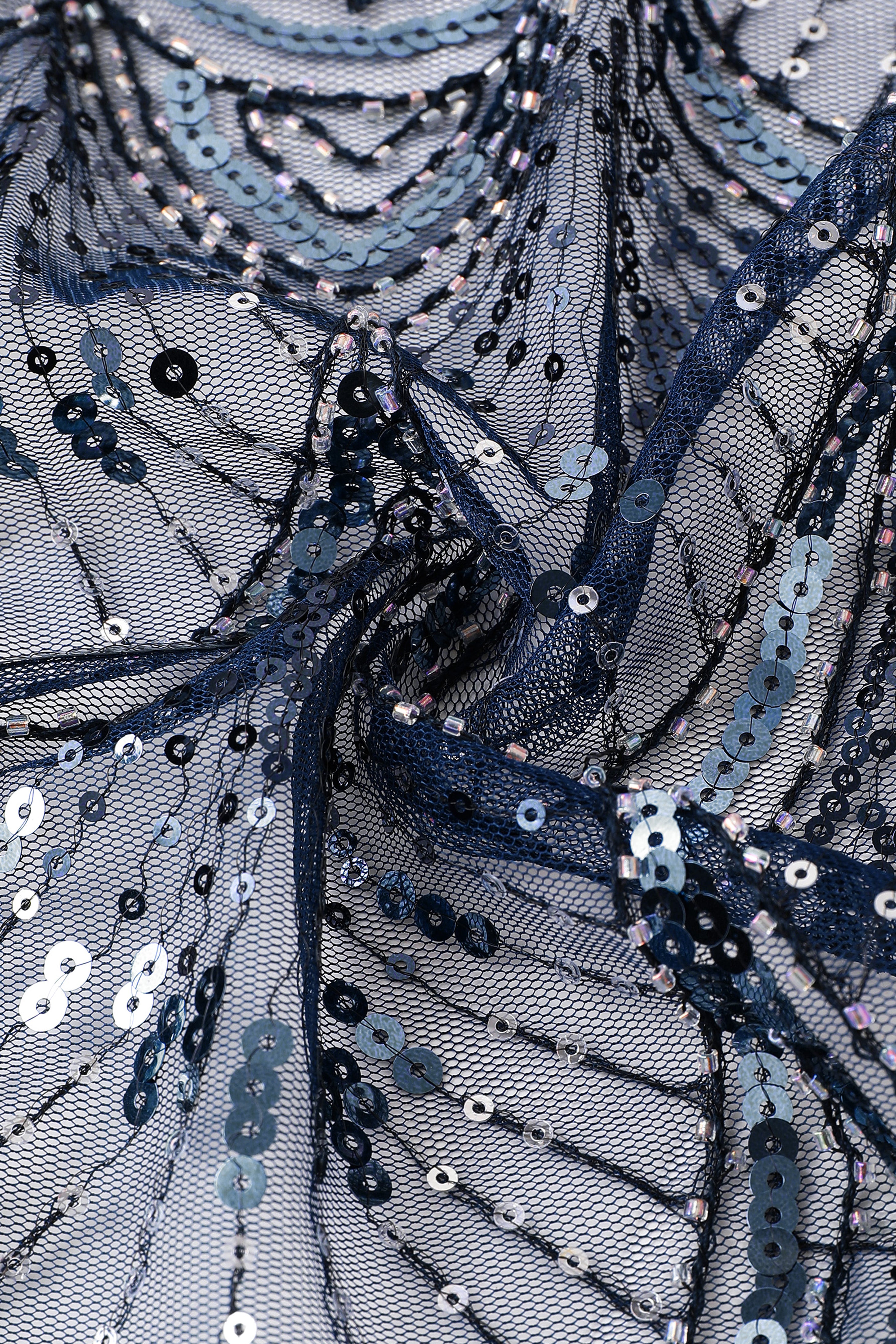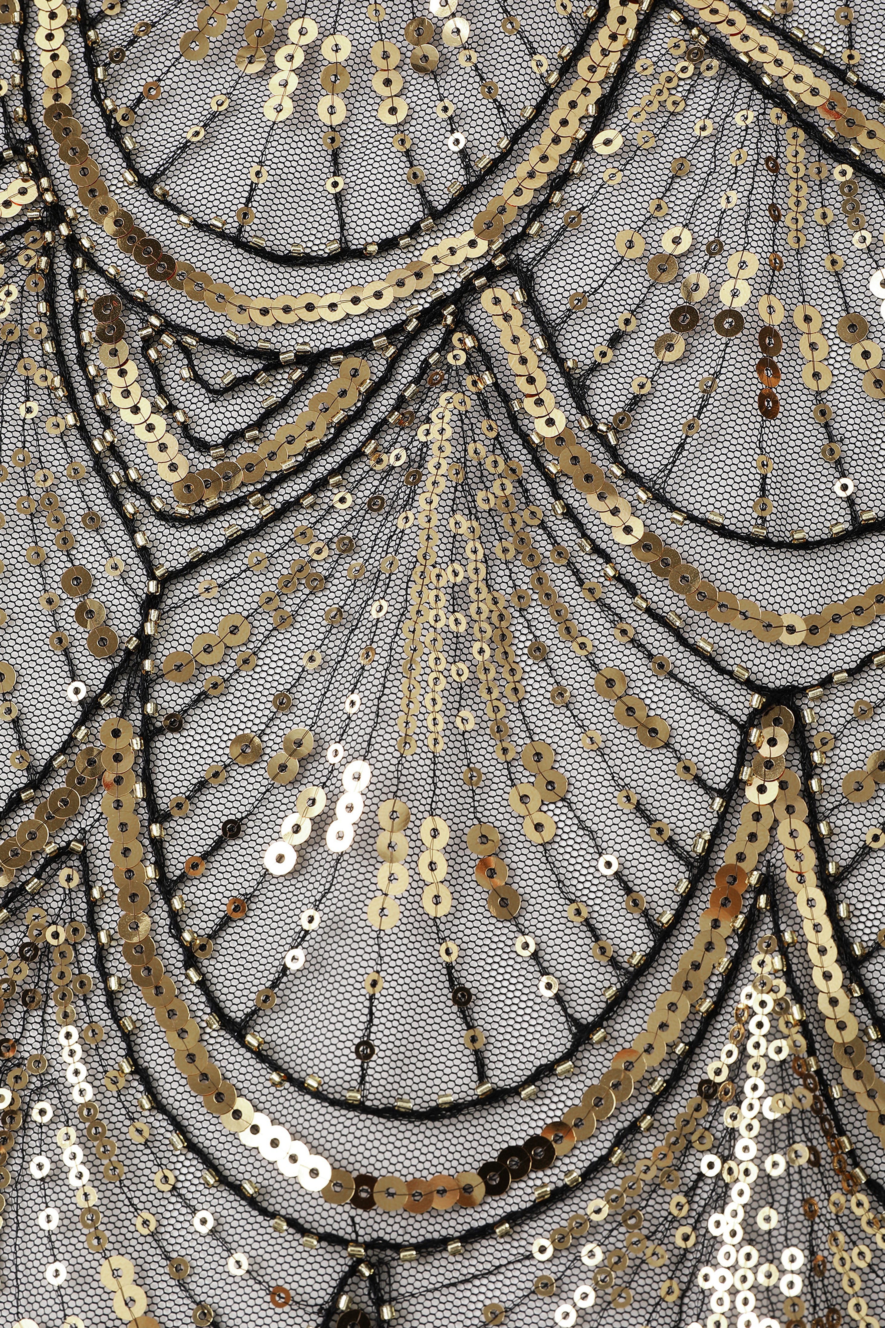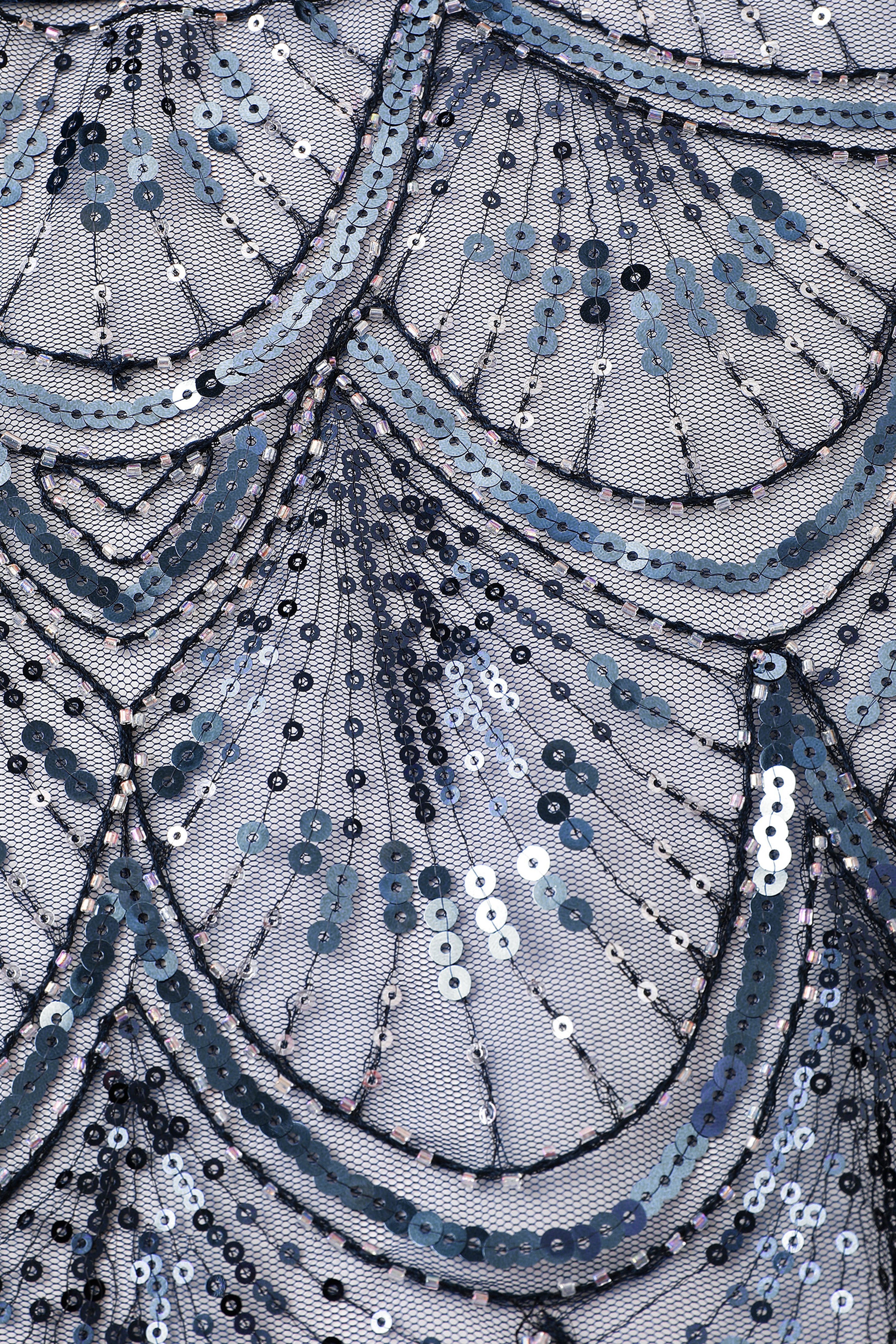A shimmering tribute to vintage glamour, this original design features bold Art Deco scallops, intricate sequin embroidery, and a sheer silhouette that drapes like a dream.
