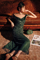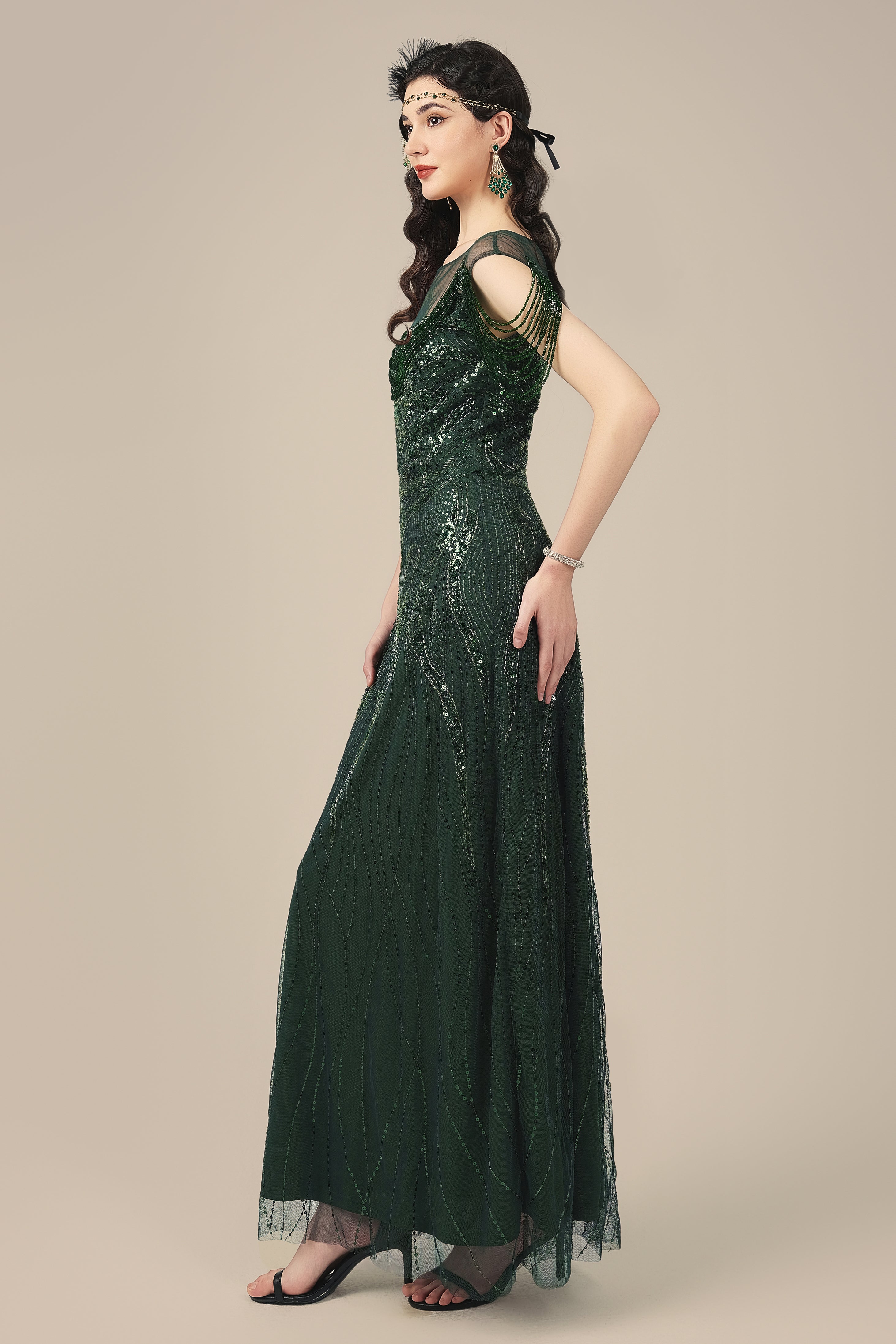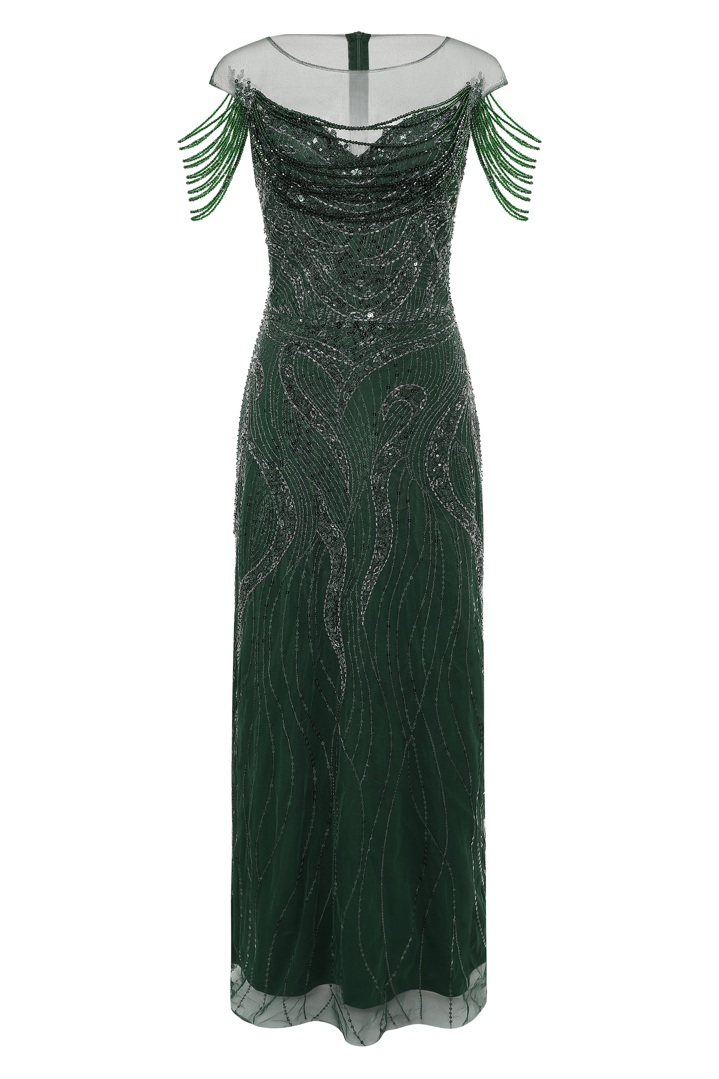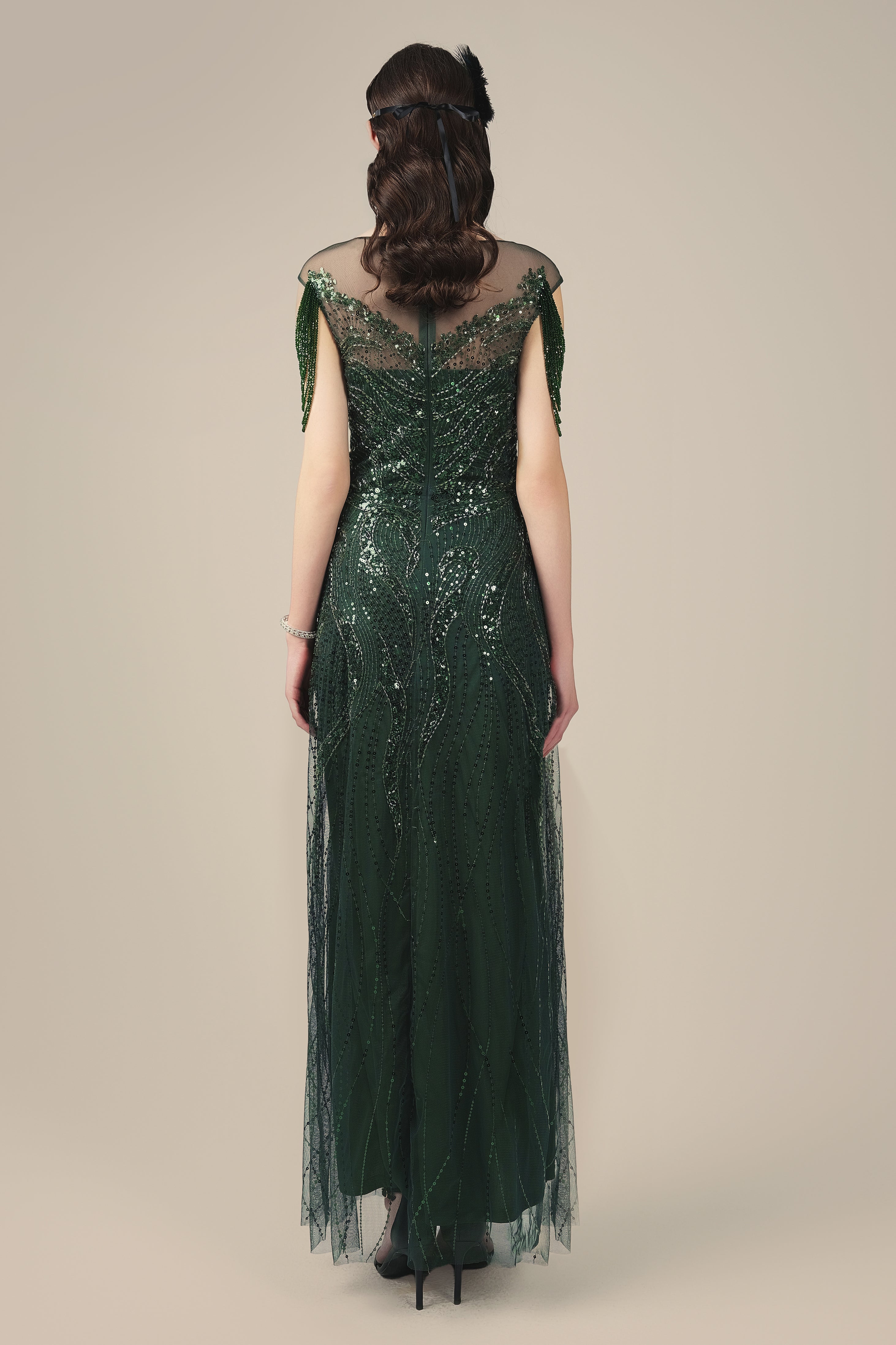 Inspired by the opulence of the Art Deco era, this evening gown features a draped mesh neckline that flows into cold-shoulder cutouts adorned with layered beaded chains, echoing the rhythm of jazz-age jewelry. The emerald sequined patterns are arranged in sweeping, architectural lines, creating a luminous texture that elongates the silhouette.