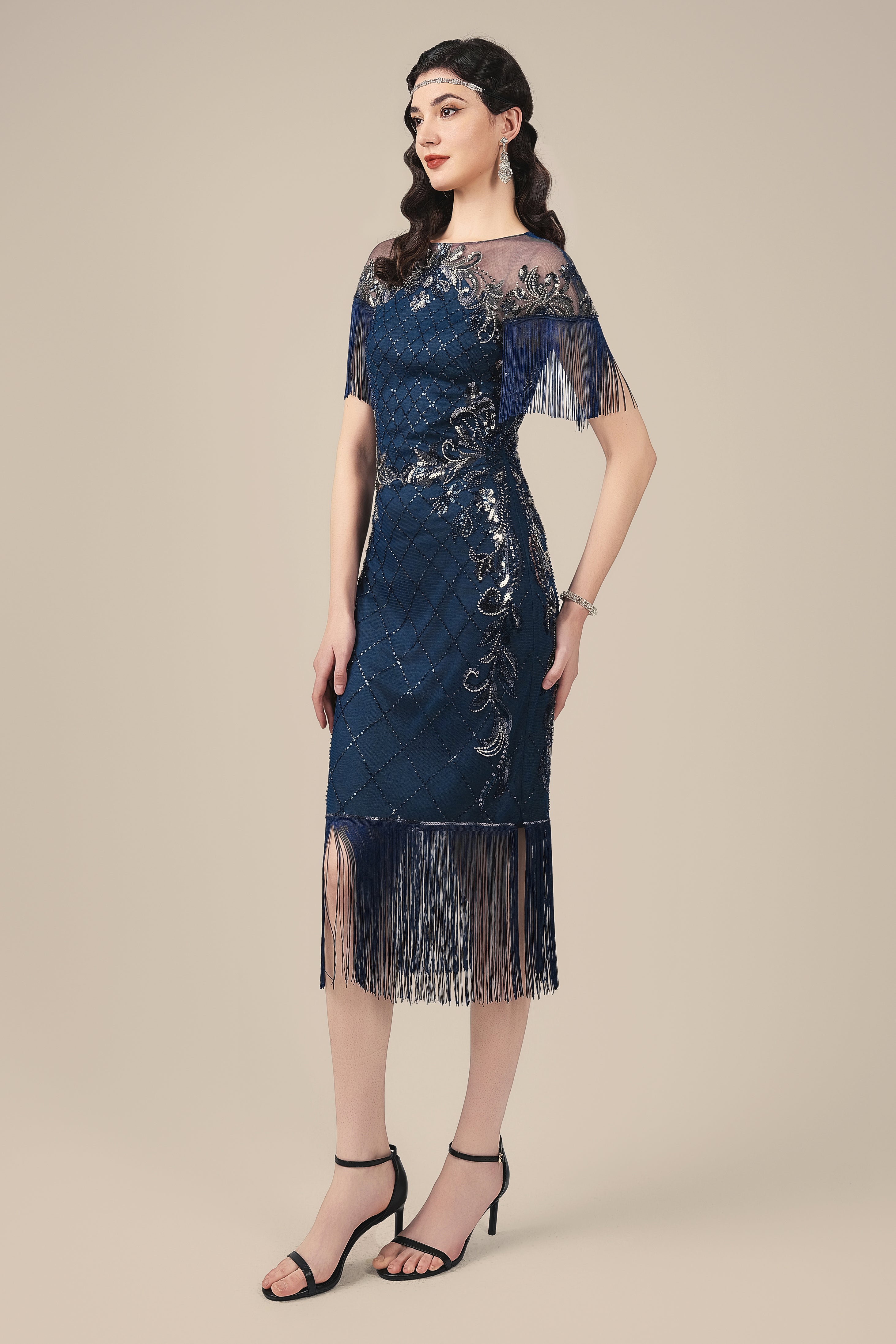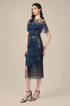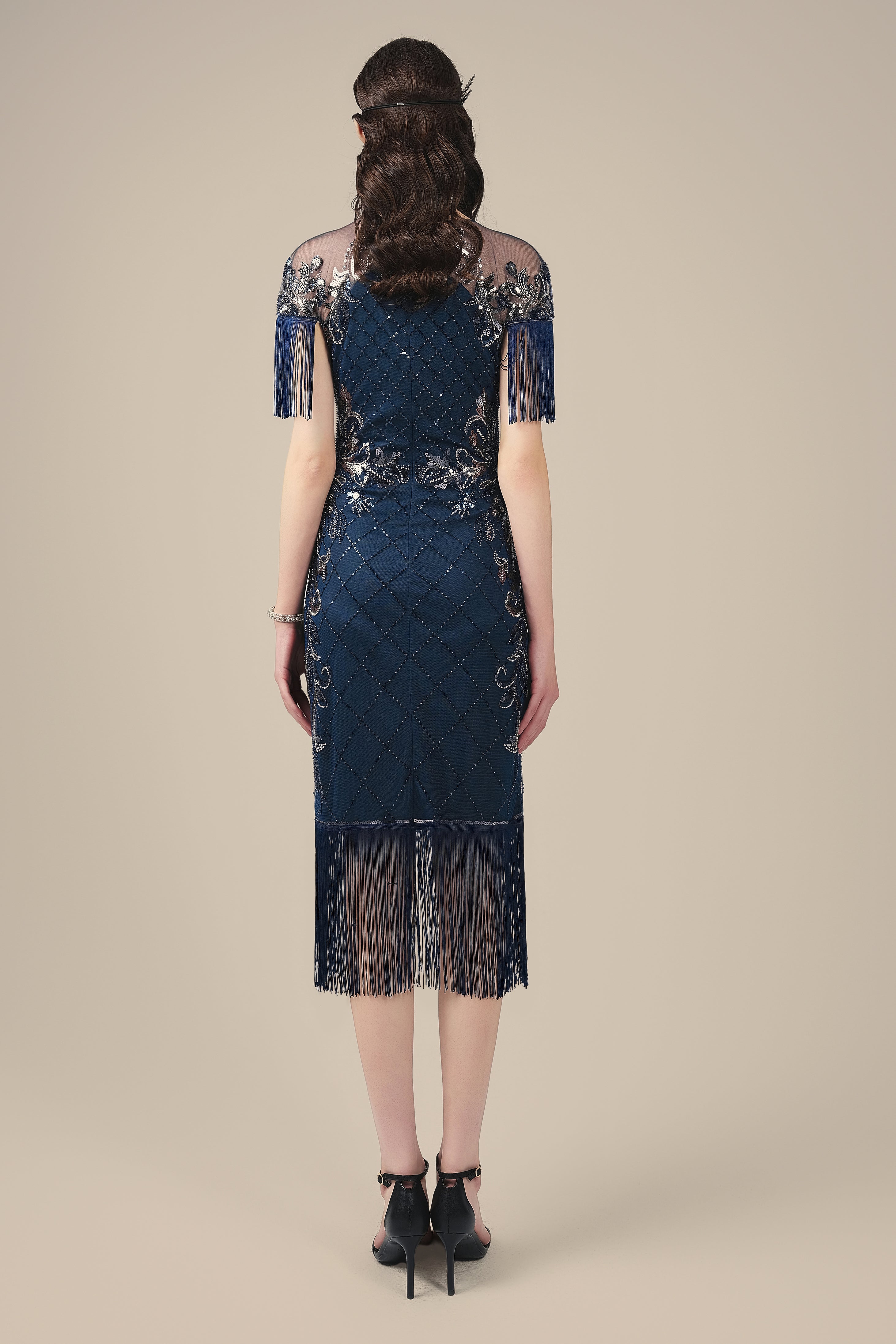 Navy Diamond Beaded Fringe Flapper Dress