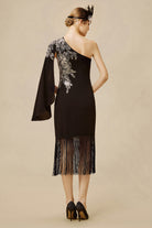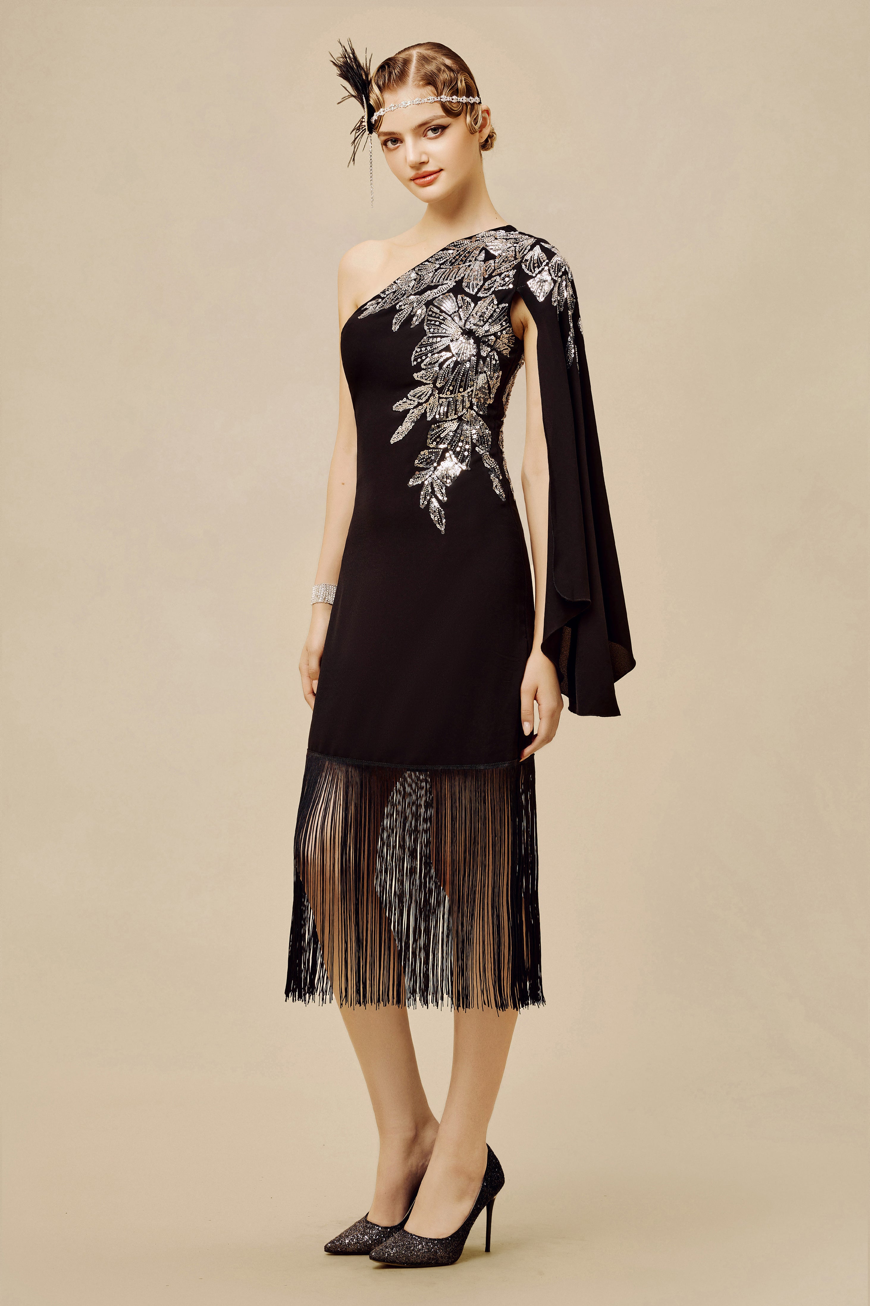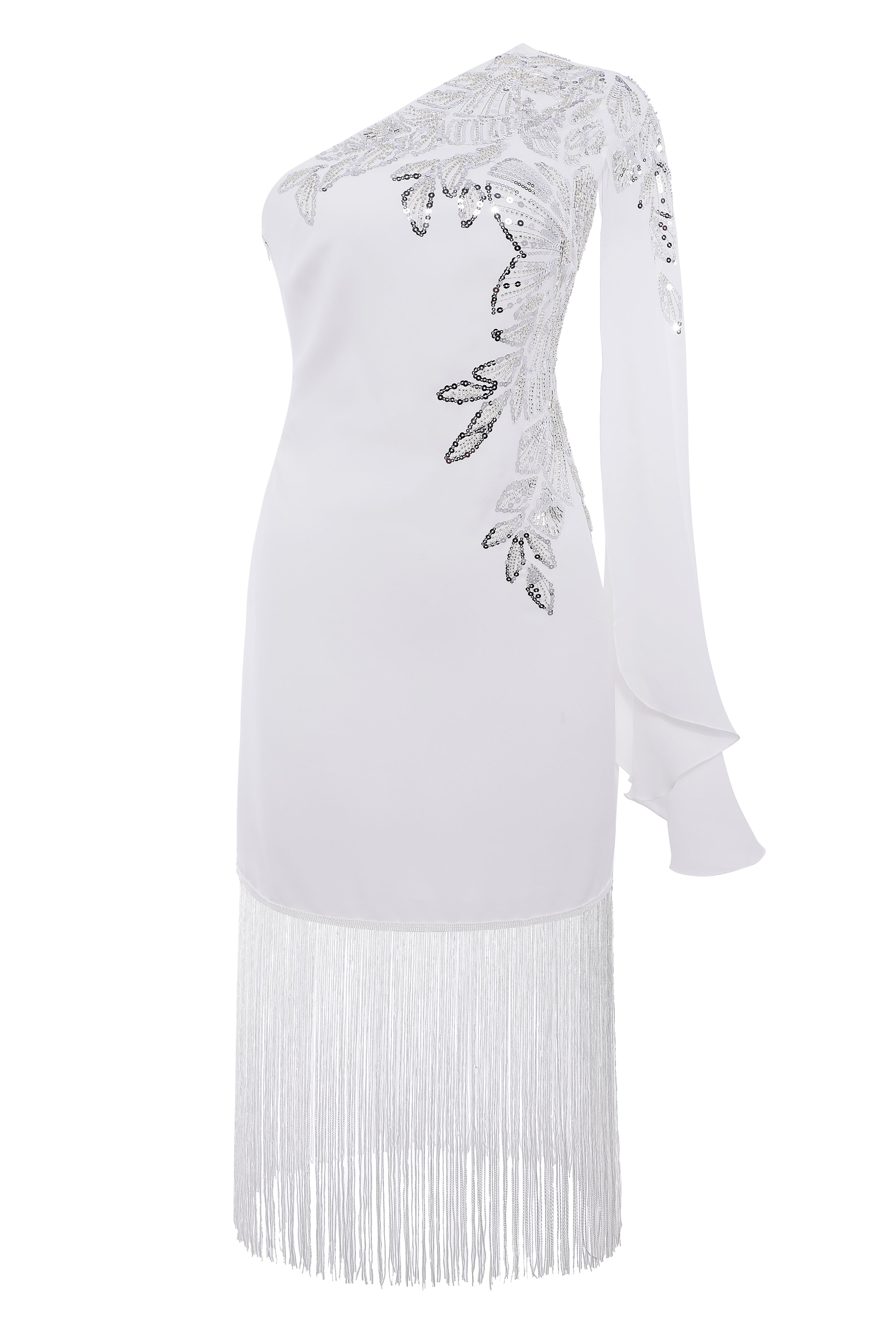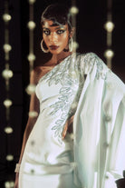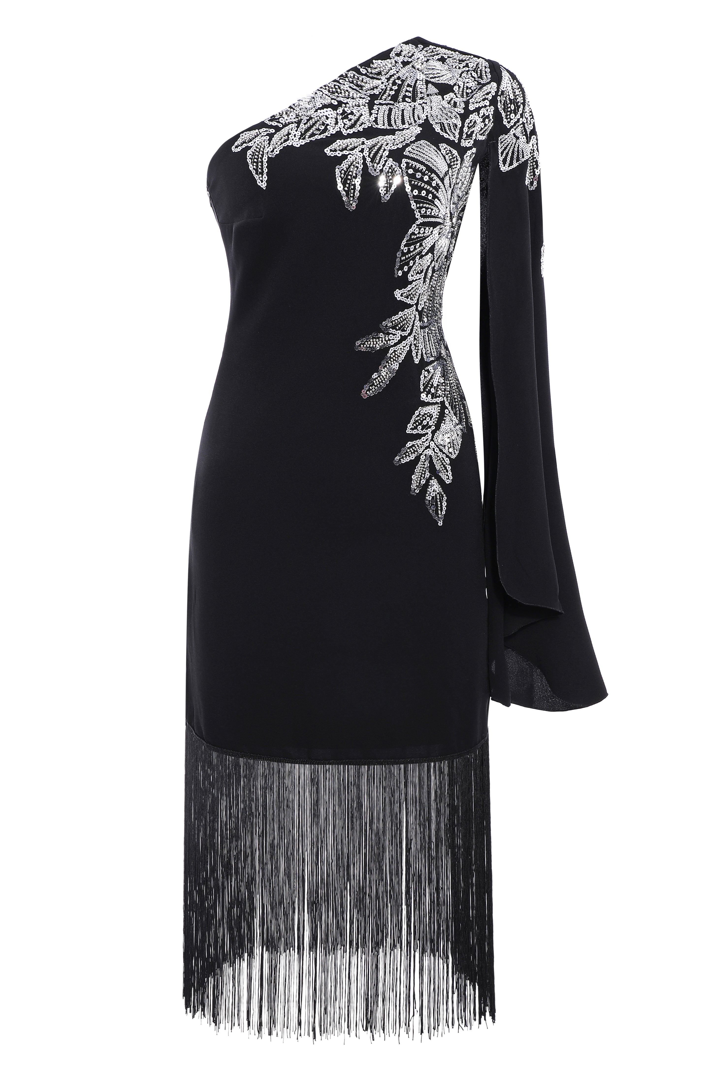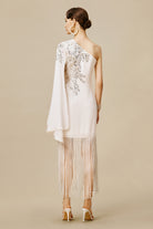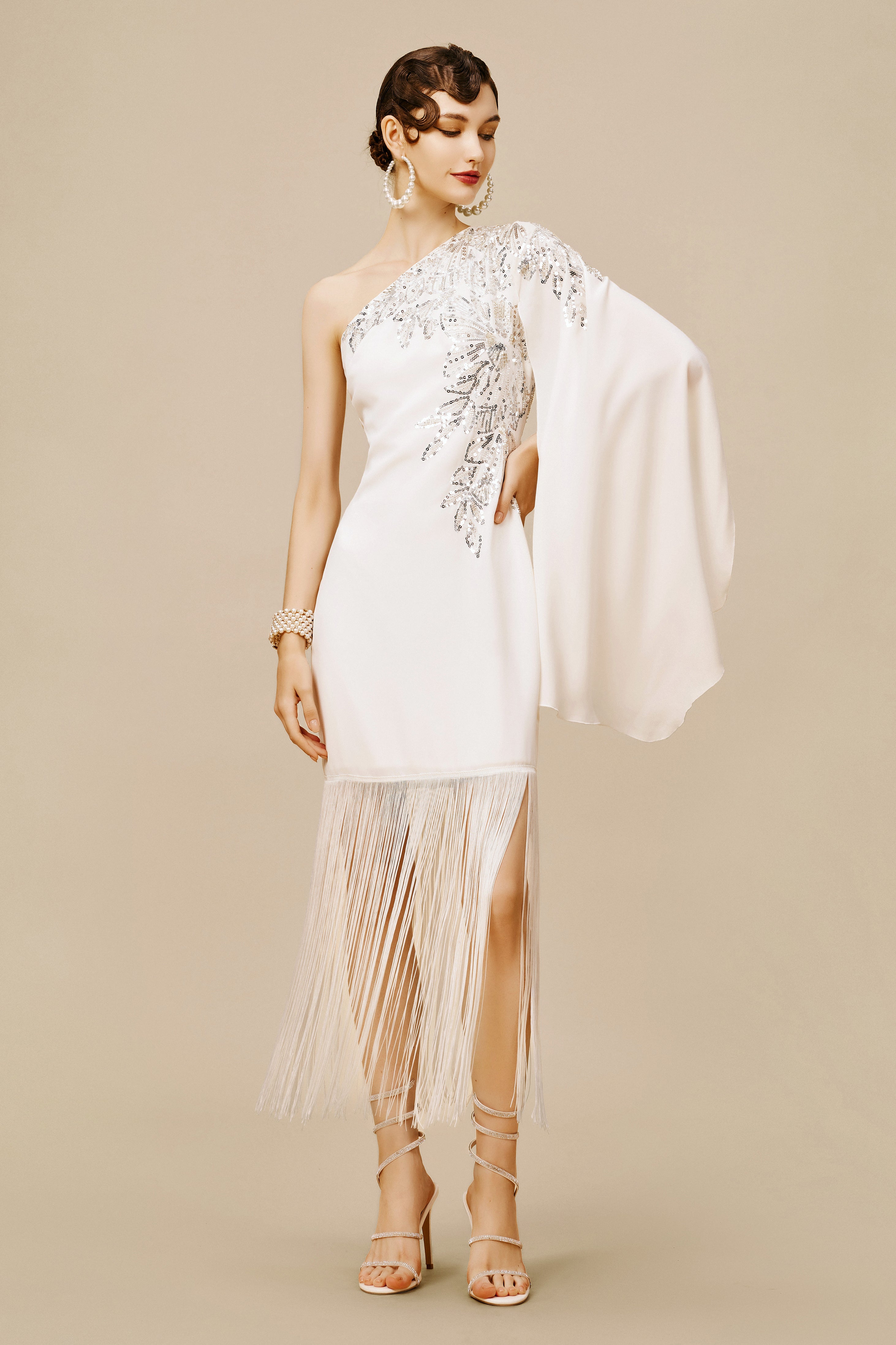 Inspired by Josephine's strength during WW II and 'The Story of an Awakening', our collection celebrates the belief that confidence is the pinnacle of beauty. Captivate in our one-shoulder crepe dress with intricate feather fringed cape sleeve.