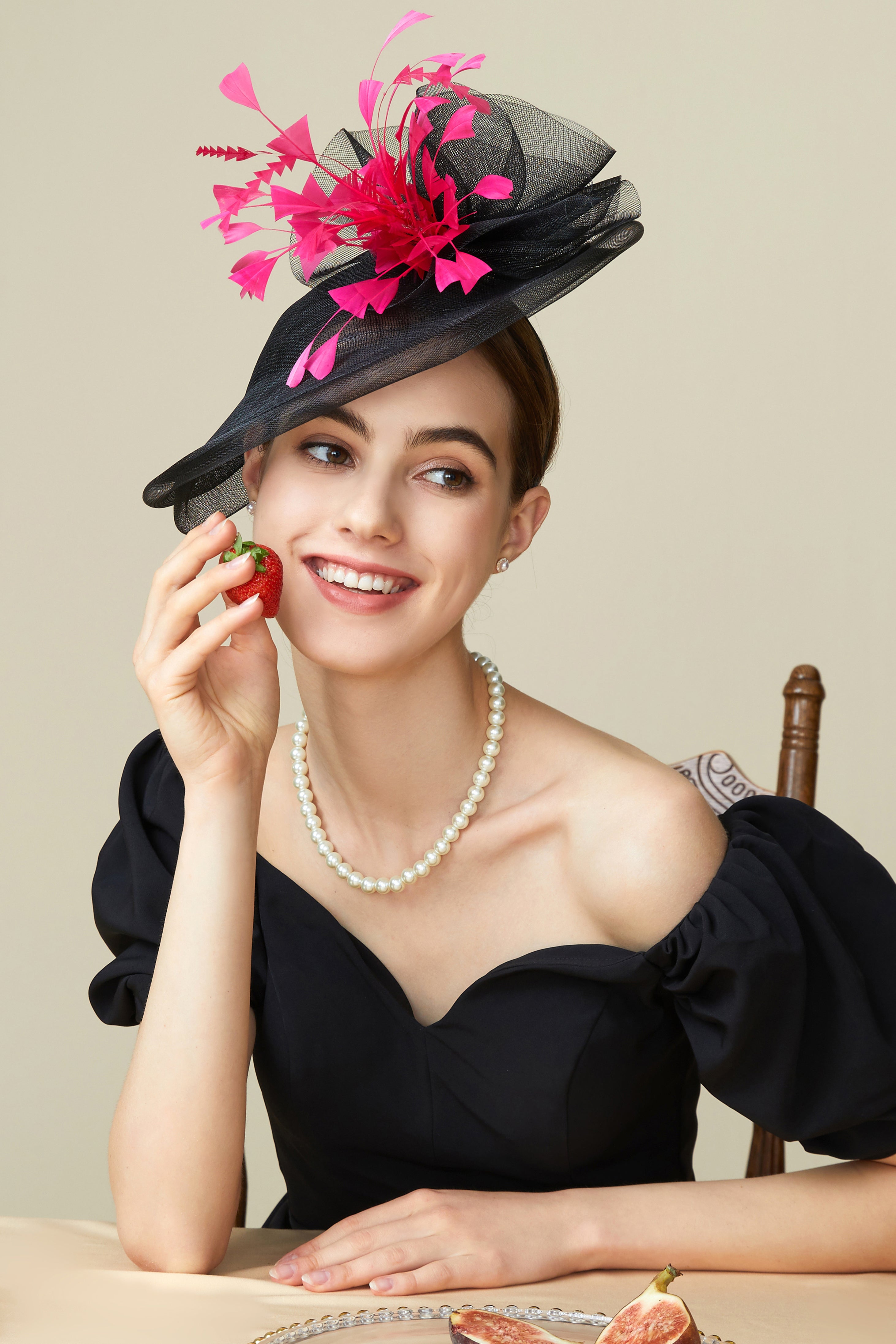 This Derby fascinator features a bold sculpted brim and vivid feather array, adorned with artful draped organza, exuding timeless sophistication and retro allure.