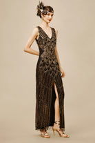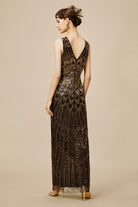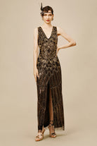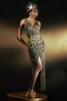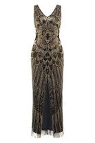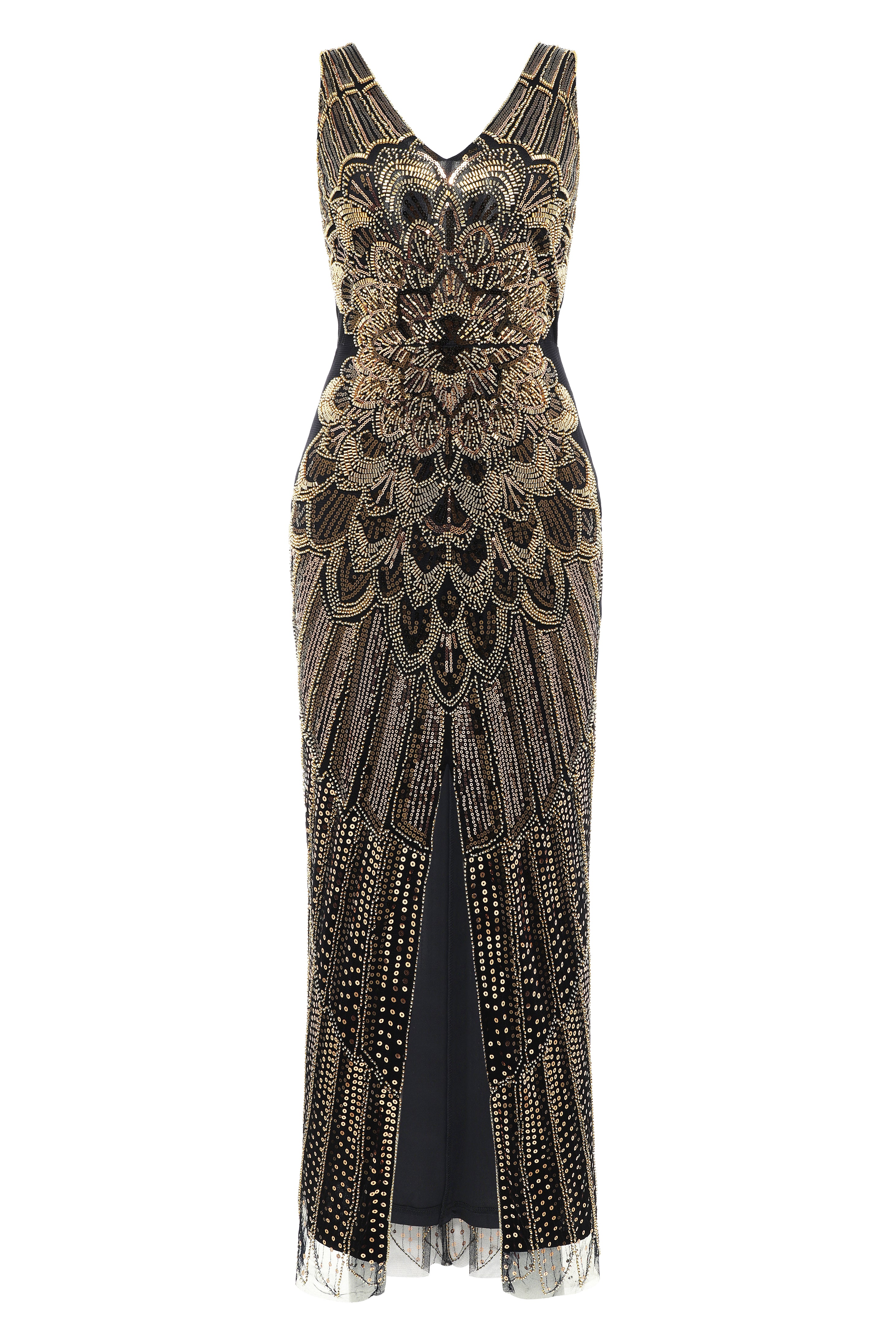 Evoking the Roaring Twenties' spirit, our collection, inspired by Josephine's 'La Revue Nègre', blends tradition with modern elegance through embroidered feather motifs. This dress dazzles with its slimming color contrast, sunburst sparkles, and beaded hem.
