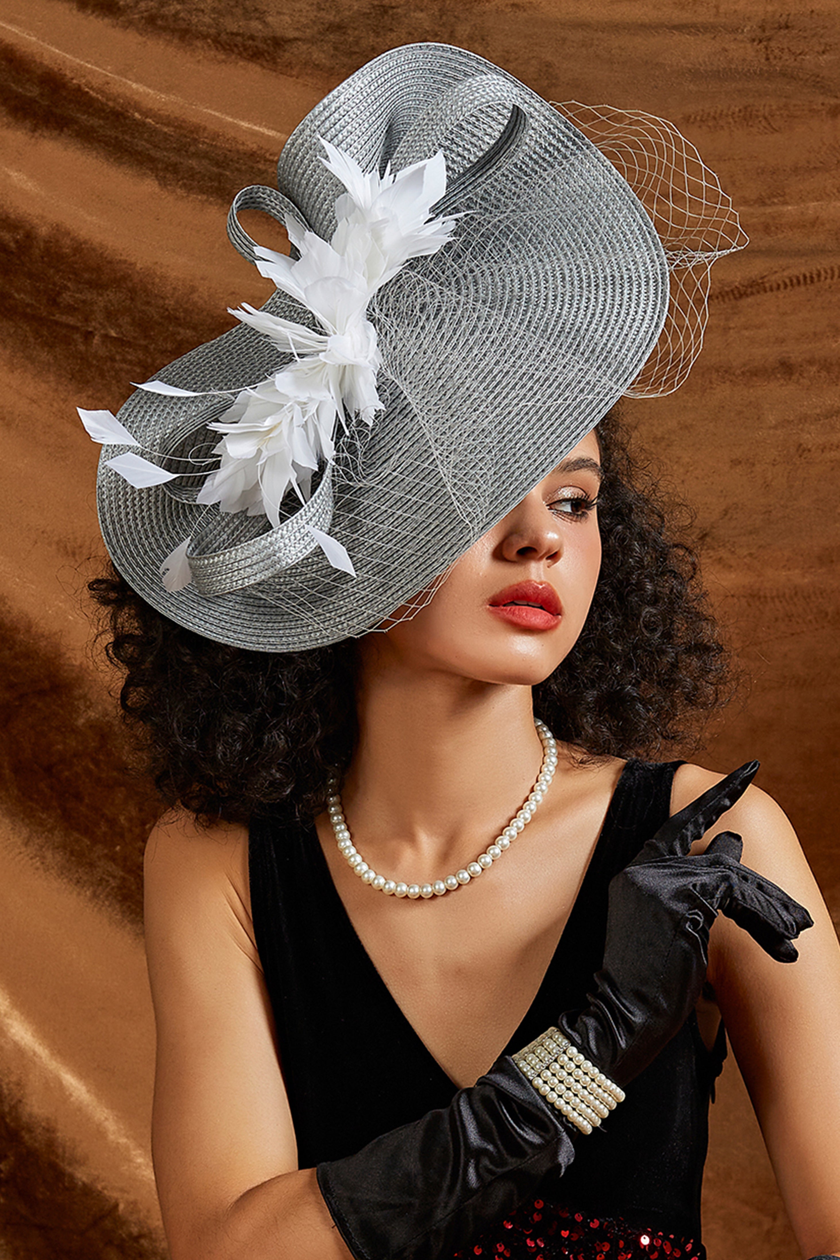 A stunning fascinator with a graceful curved design and elegant veil, perfect for making a statement at any race day event.