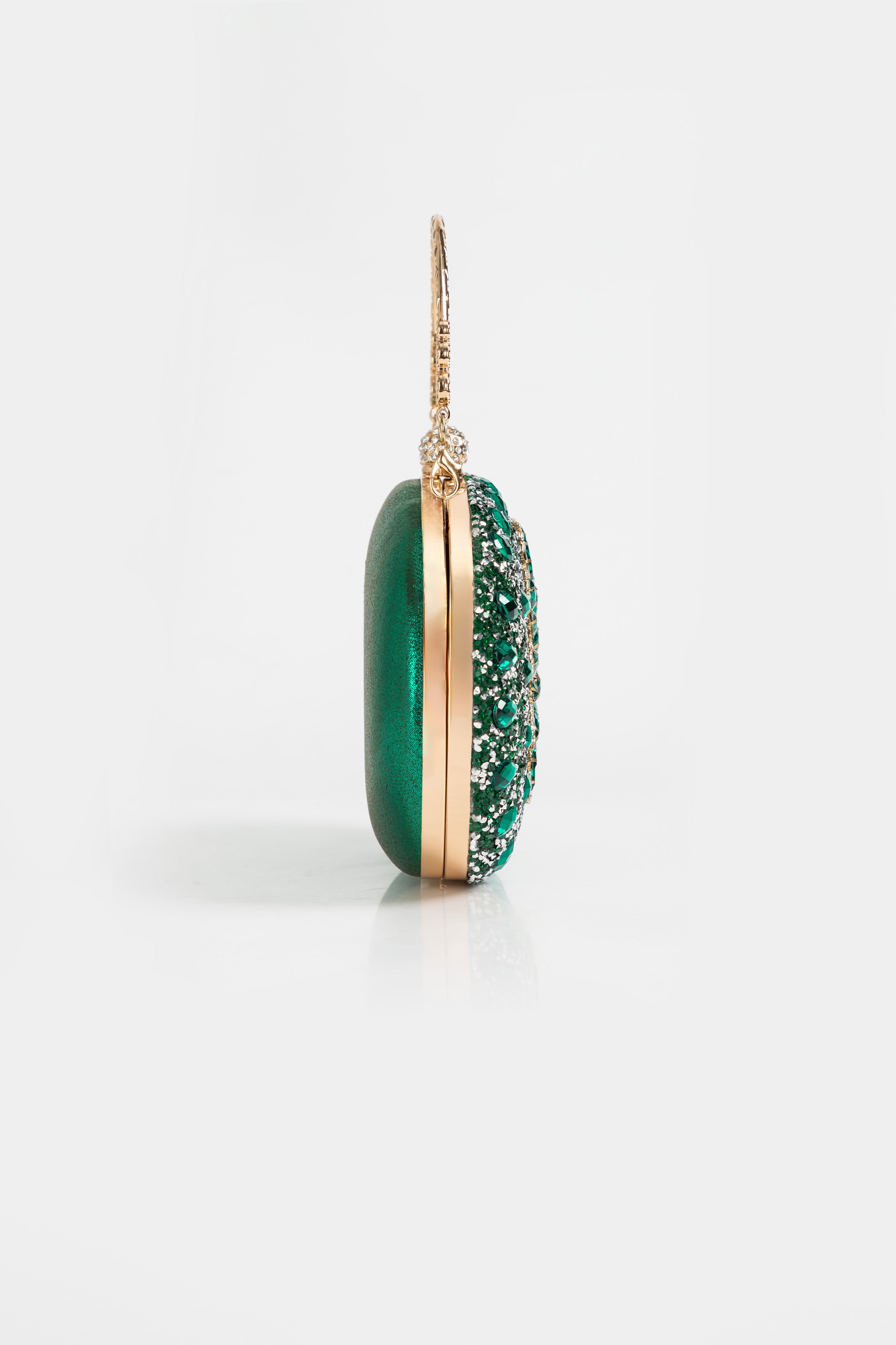 This clutch, with its oval shape adorned in shimmering rhinestones and intricate gold-tone detailing, exudes luxury and sophistication. The dazzling gemstones beautifully catch the light, while the secure top clasp closure ensures your essentials are safely stored.