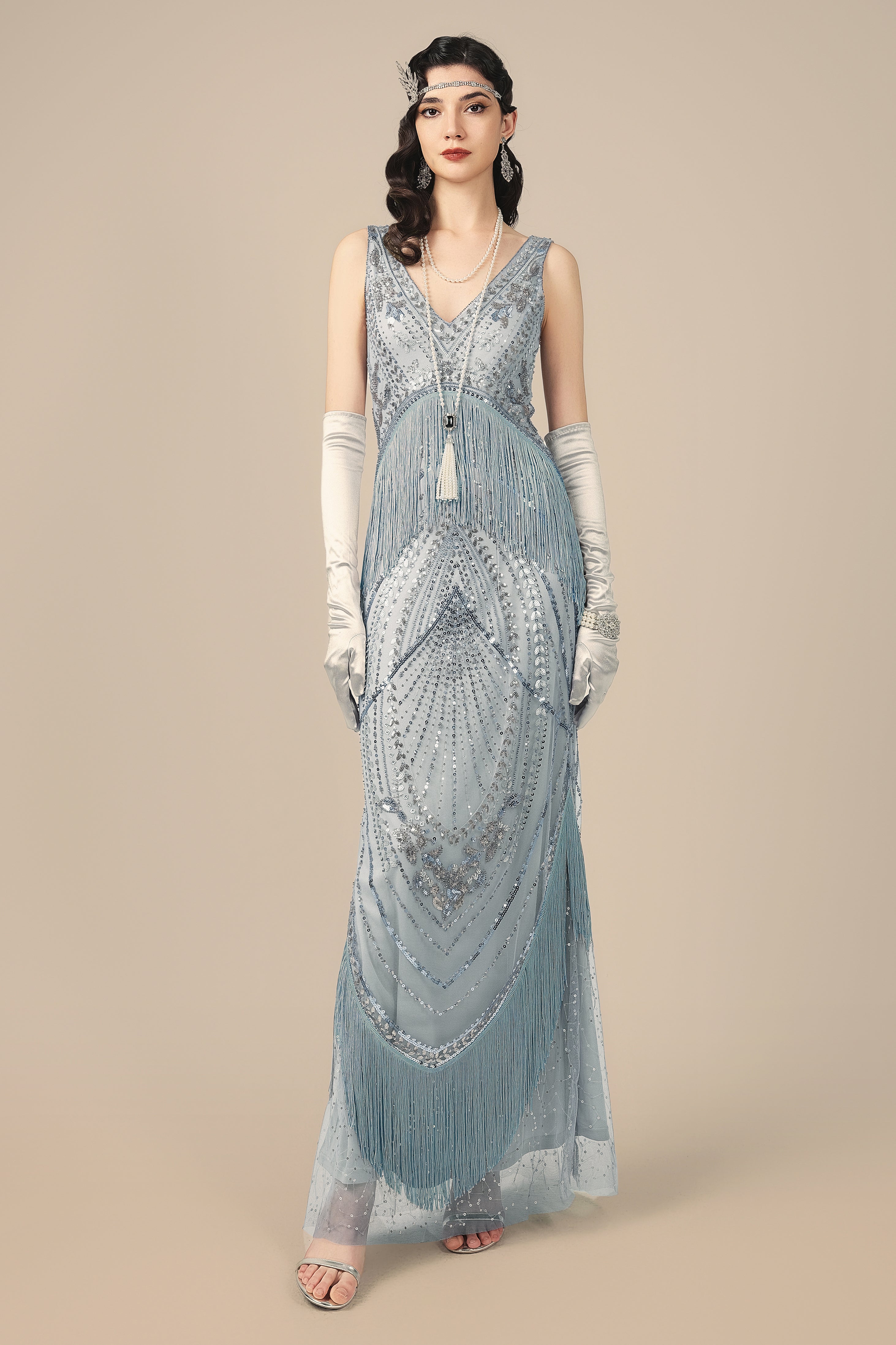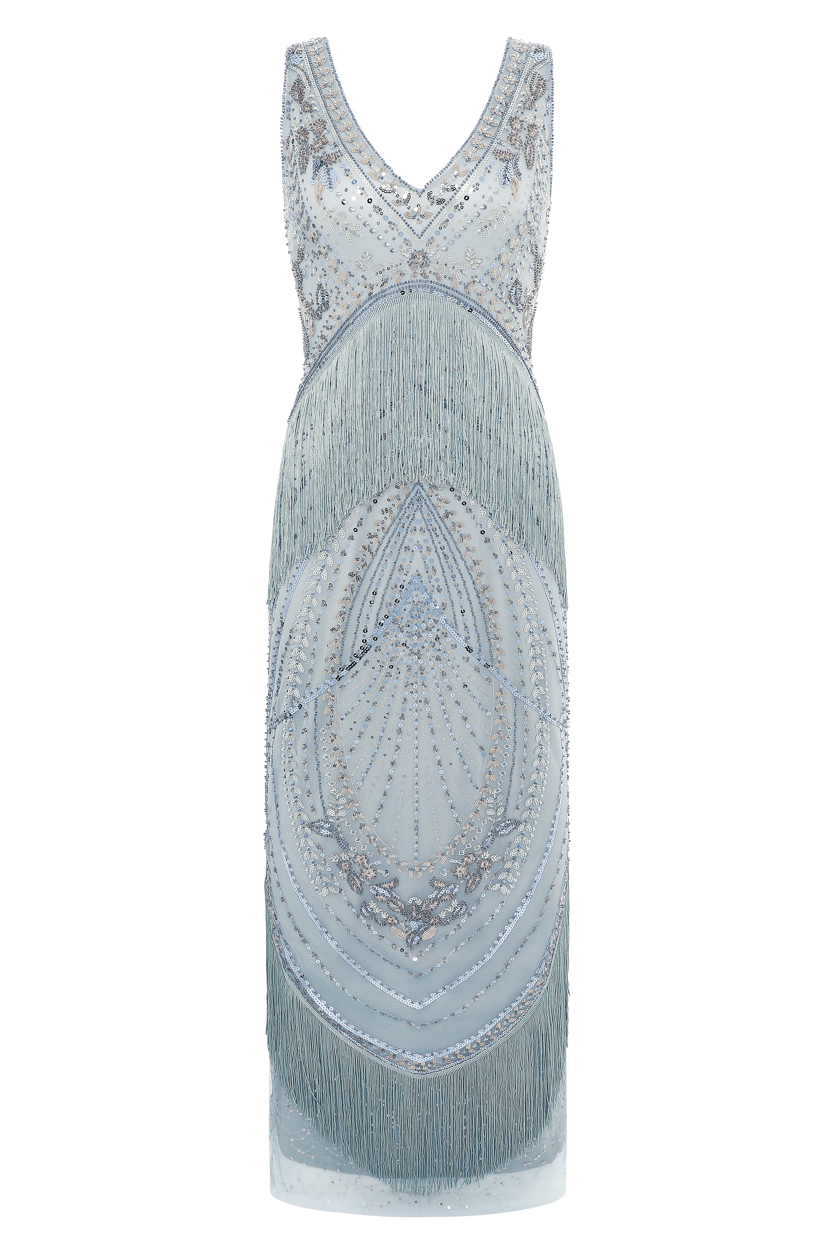 This original Art Deco gown features a striking radiating bead motif designed to elongate the figure, paired with sleek fringe at the waist and hem for graceful movement. A sheer overlay and soft V-neckline complete the look with effortless elegance. Meticulously designed in-house, this gown blends vintage glamour with bold, modern craftsmanship.