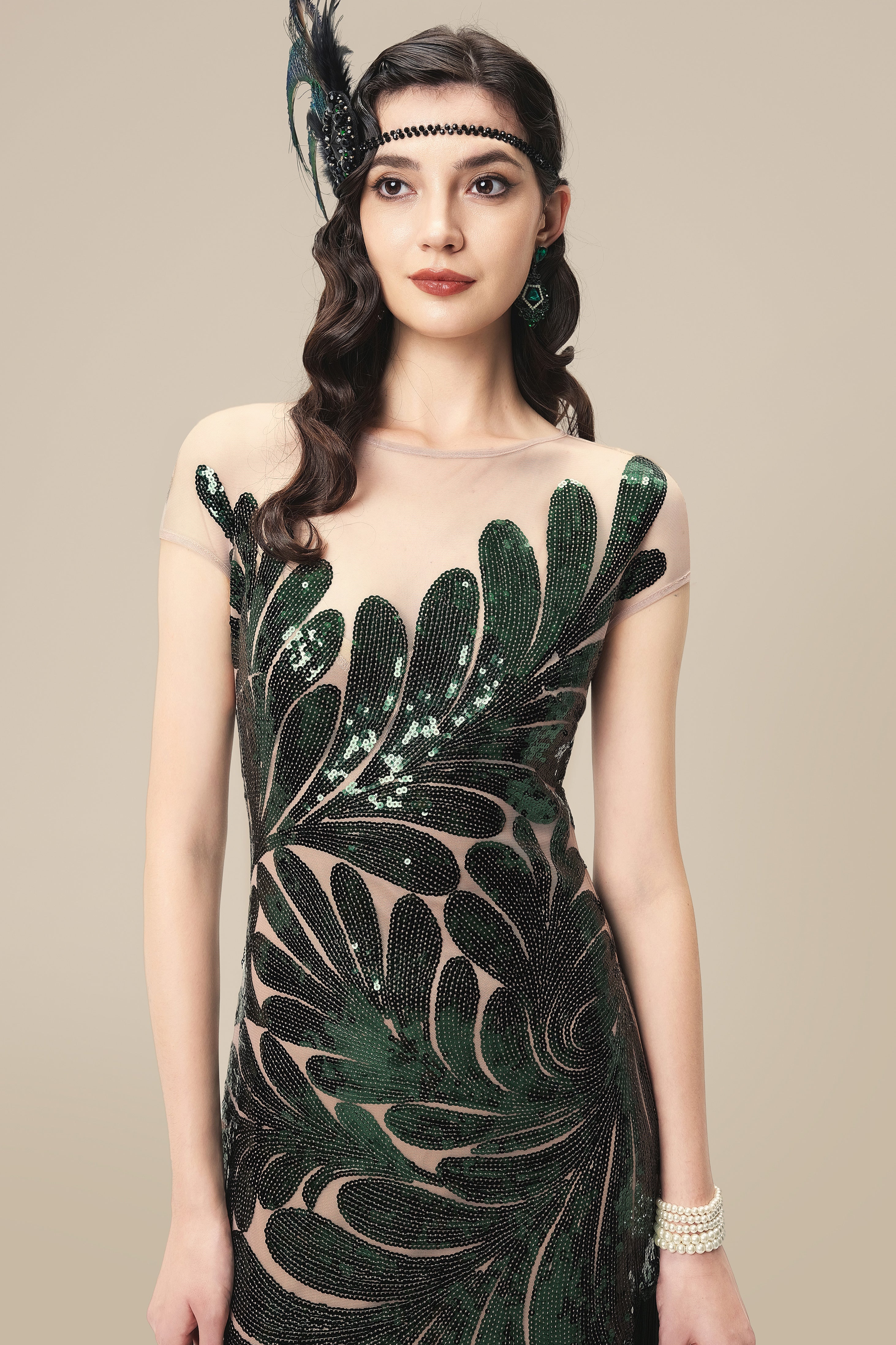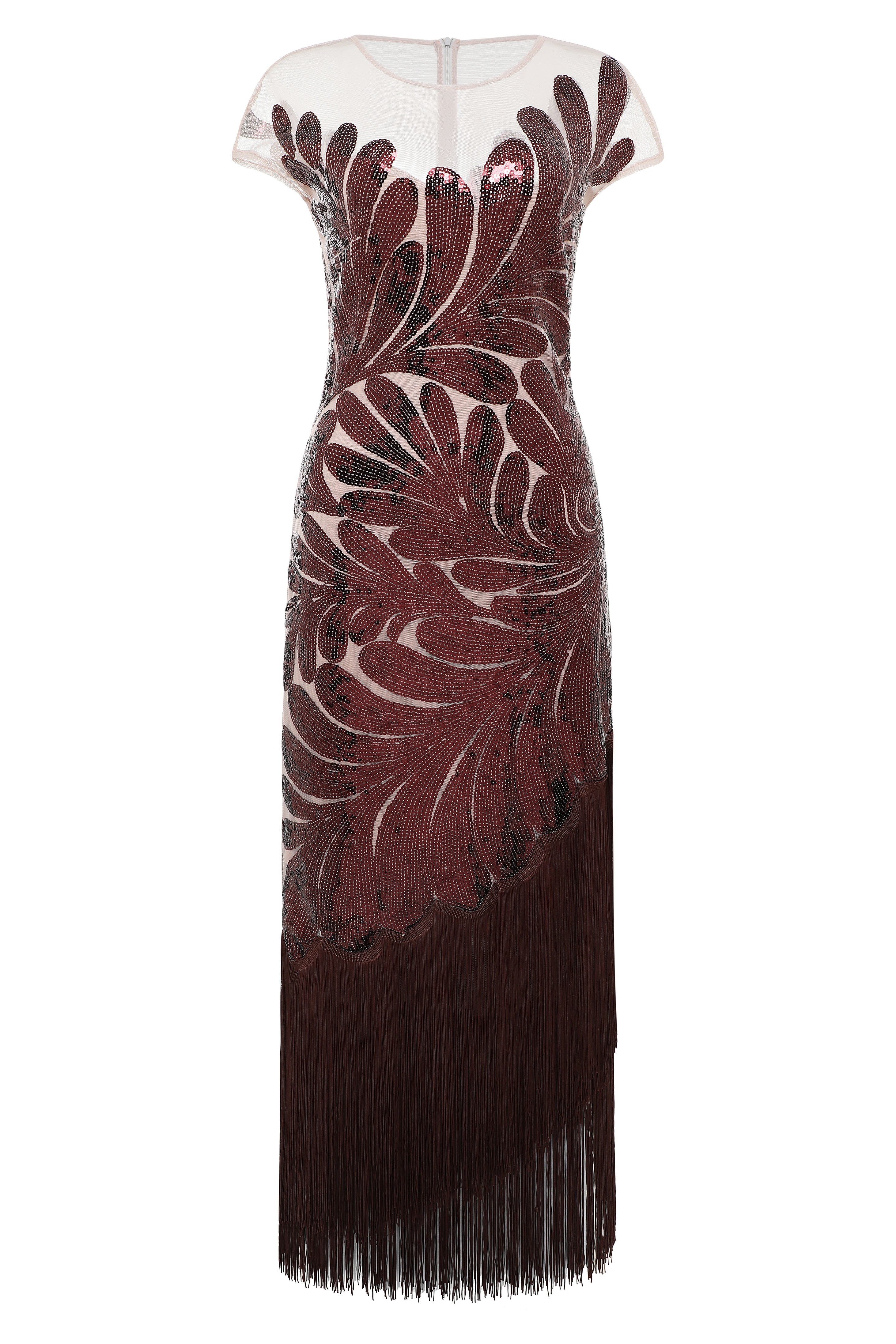Drawing inspiration from the lavish opulence of the Jazz Age, this gown celebrates timeless sophistication with its mesmerizing fern-patterned sequin embellishments. The refined V-neckline and elegant strapless illusion design capture the daring yet polished style of the era, while the flattering, figure-skimming silhouette accentuates your curves with effortless grace. Cascading fringe at the asymmetrical hemline sways with every step, adding dynamic movement and drama, as though you're ready to dance the night away at a Gatsby-esque soirée.