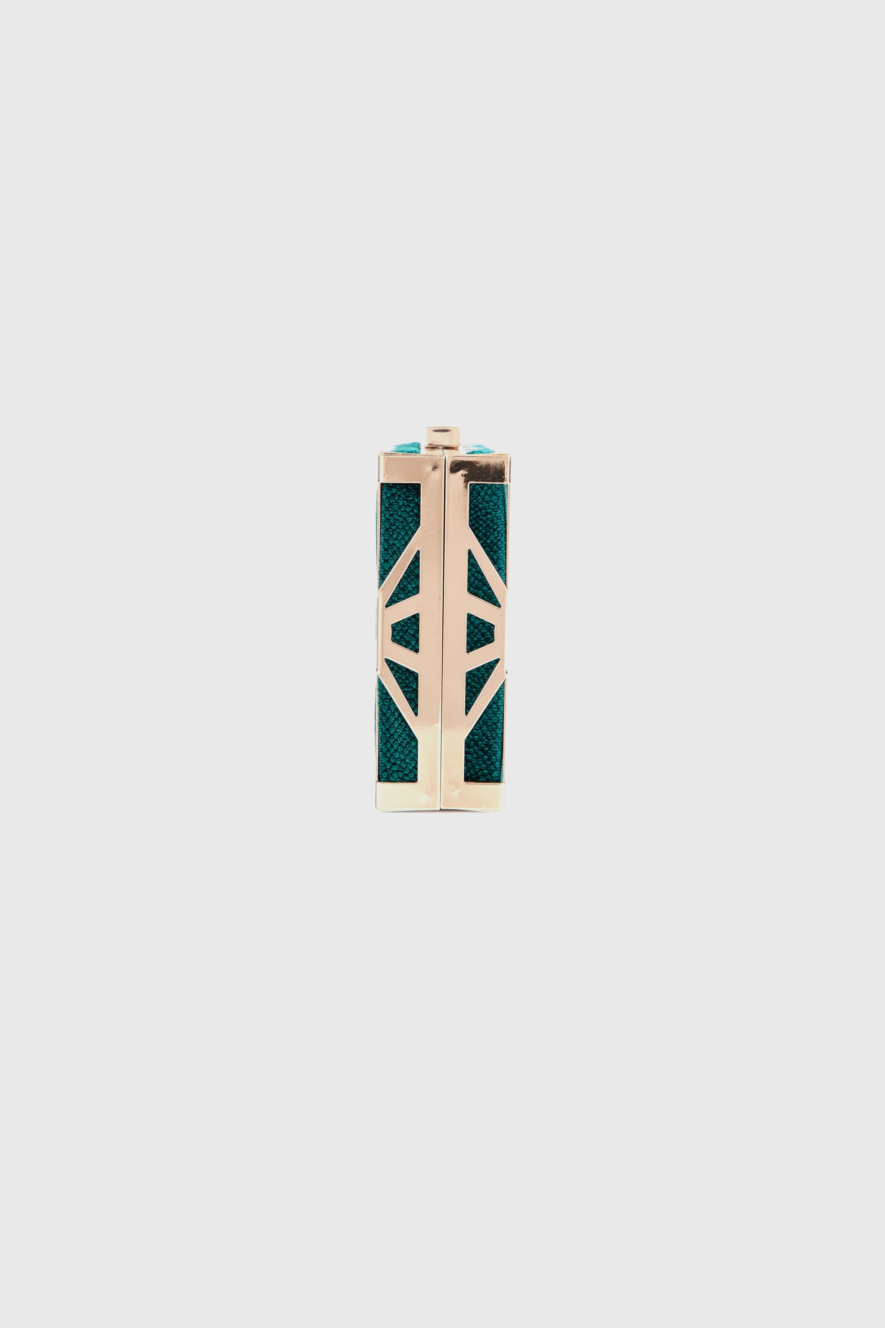 A chic green clutch with bold Art Deco geometry, perfect for glamorous nights.
