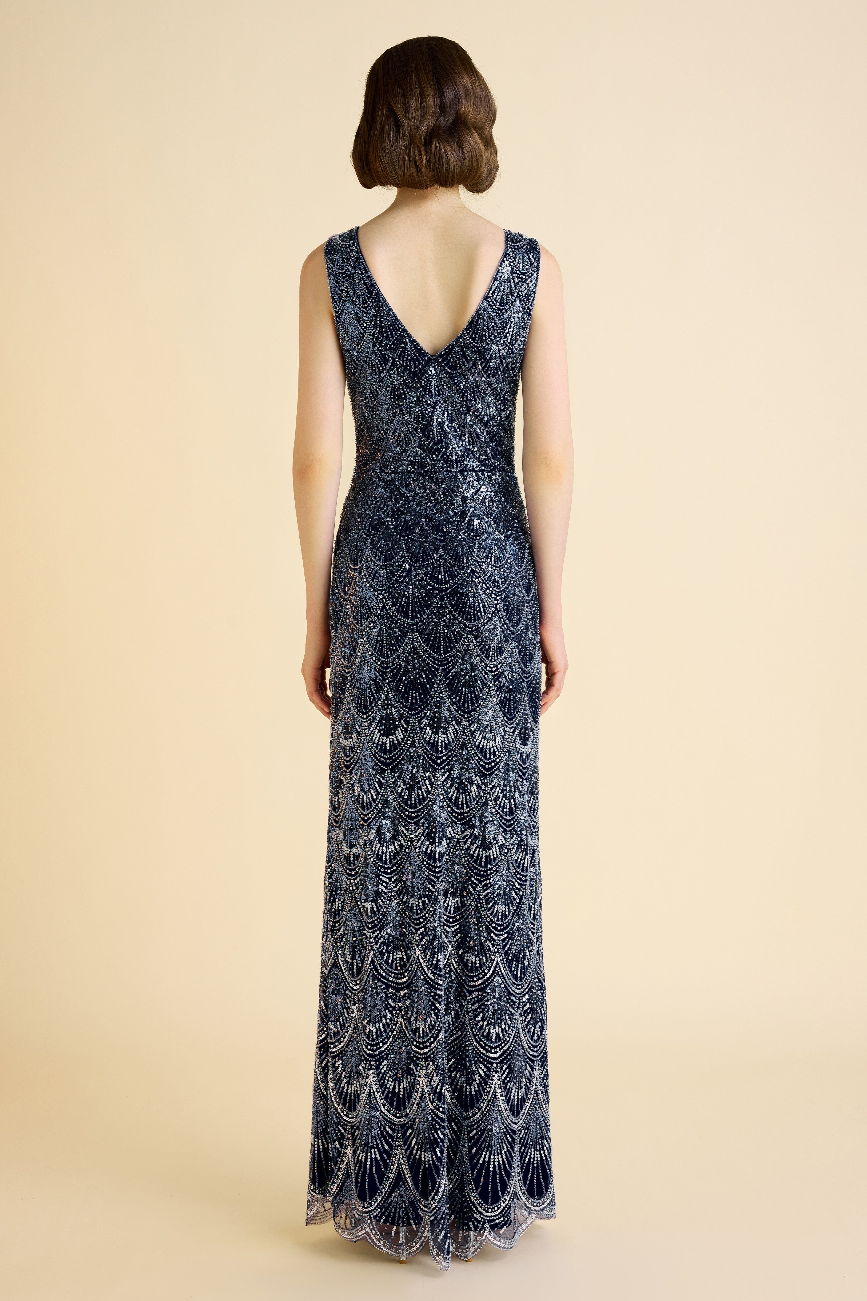 The gown features an exquisite gradient of shimmering beads, artfully arranged in a captivating mermaid motif that gracefully cascades from top to hem. Designed with versatility in mind, it highlights a sleek and sultry silhouette. For an even more elegant and graceful look, it can be paired with a luxurious shawl, enhancing the overall beauty and sophistication.