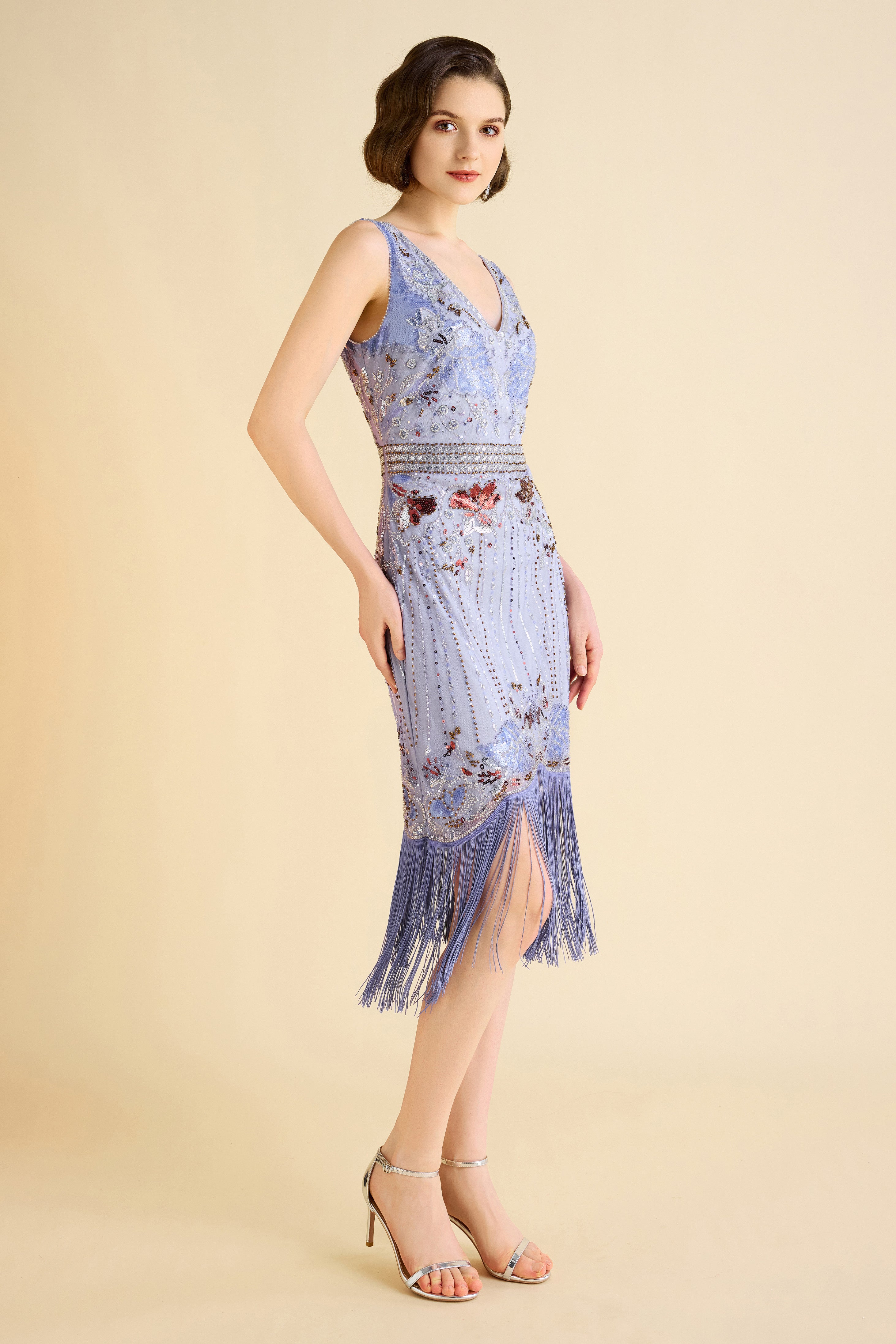 The intricate oil-paint-inspired floral patterns add an artistic flair, elevating the design with a touch of opulence. At the hem, the petal-shaped scalloped edges blend seamlessly into the fringed detailing, evoking the glamour of the Roaring Twenties. The linear bead embroidery on the skirt elongates the body, enhancing your figure and offering a slimming effect. With every step, the delicate fringes sway gracefully, bringing movement and allure to this stunning piece.
