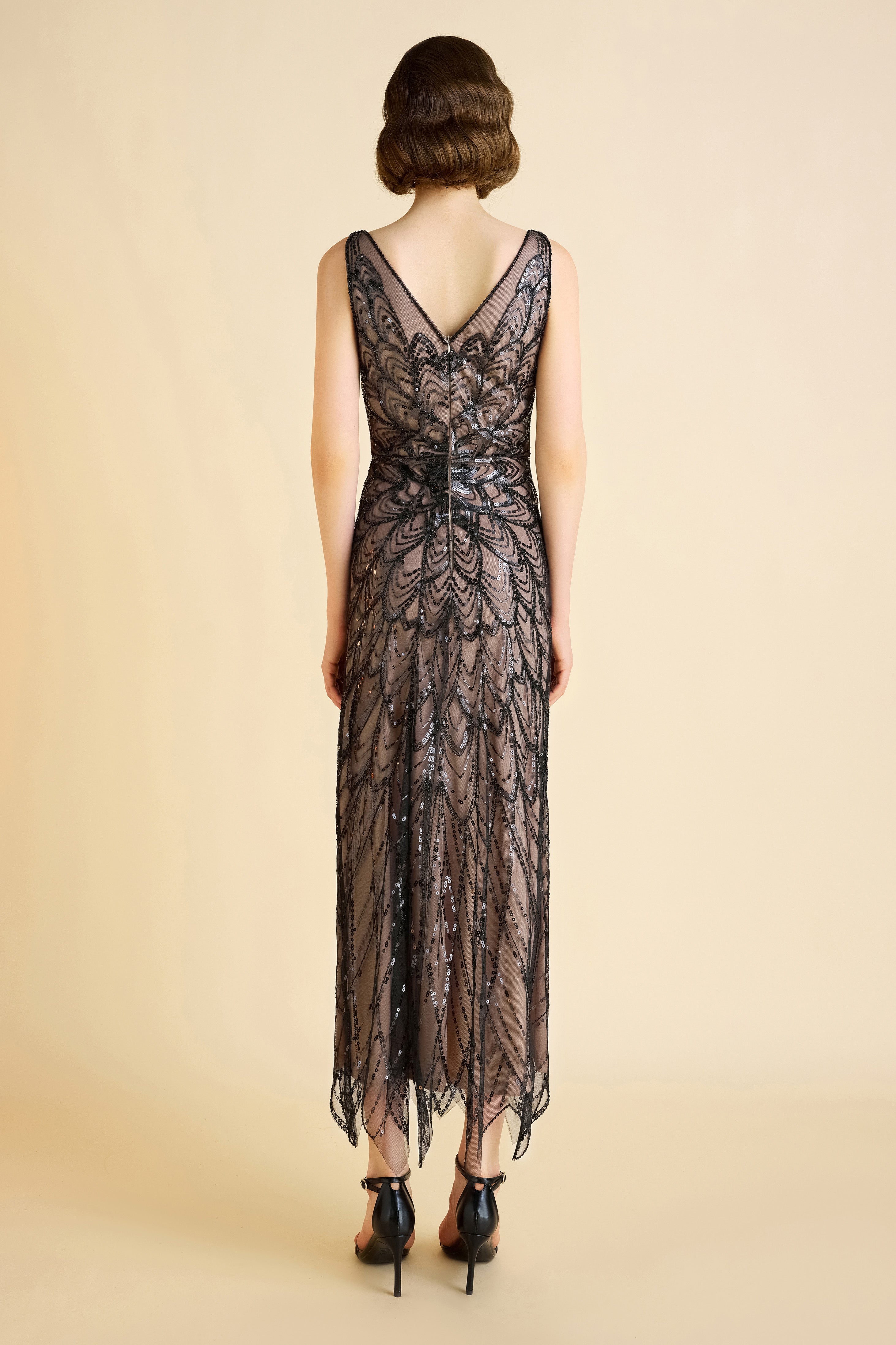 This gown features a radiating waistline design, where the delicate sequin work fans outward from the waist, creating a visually slimming effect that accentuates your natural curves. The symmetrical floral sequin pattern is intricately crafted, offering both elegance and sophistication, while the nude lining contrasts beautifully with the black sequins, creating a striking see-through body effect without compromising modesty.