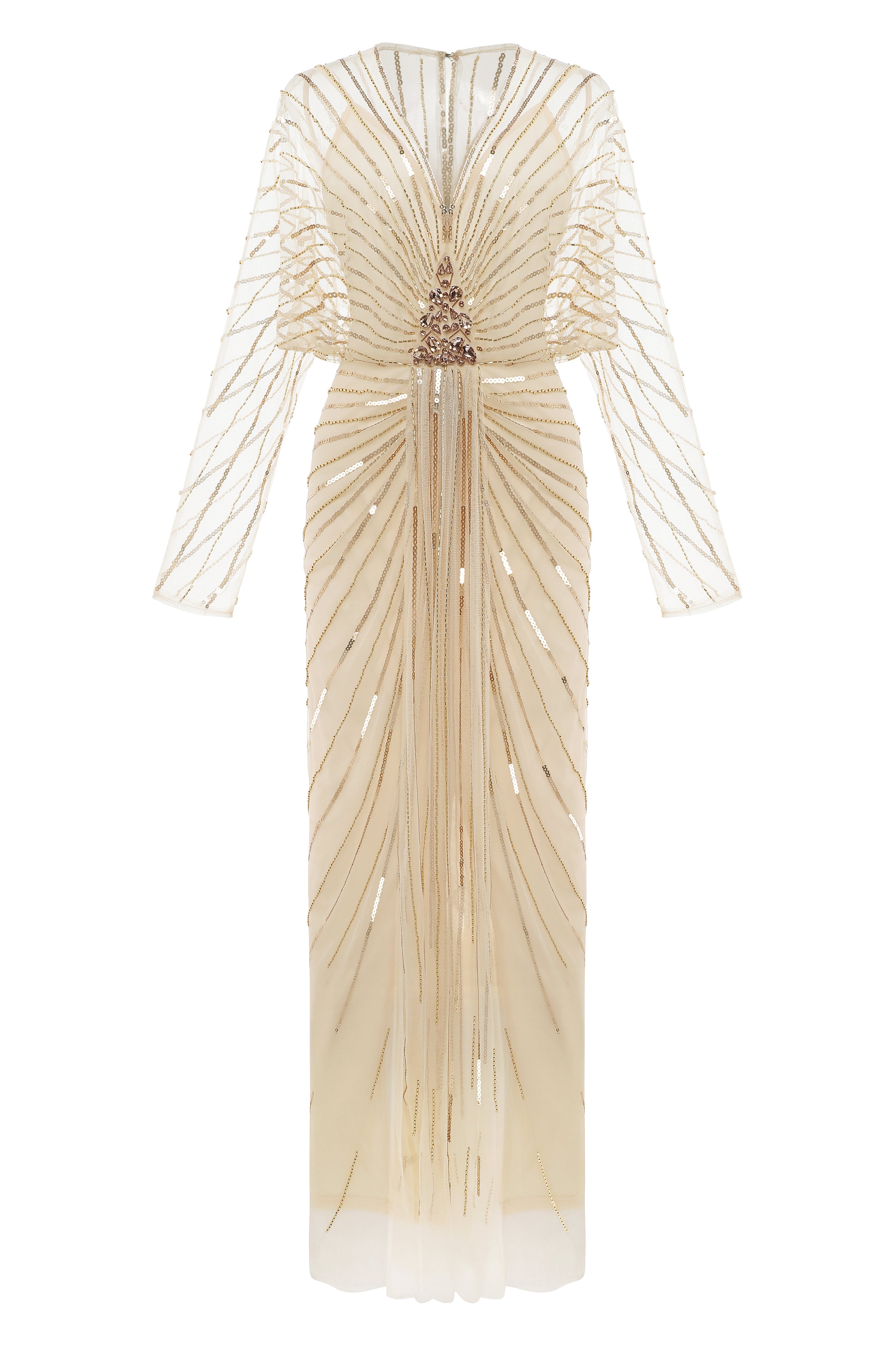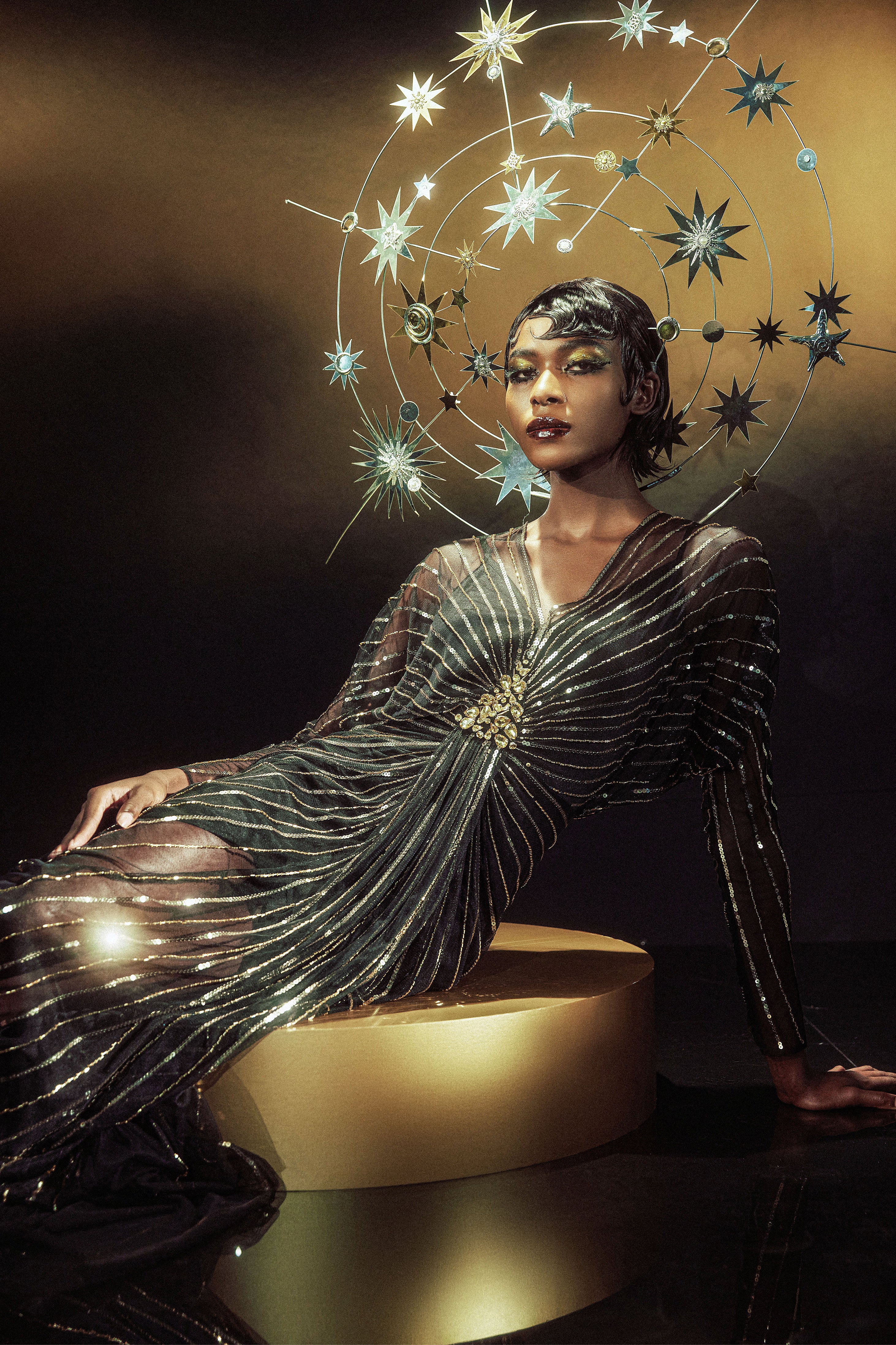 Channeling Josephine Baker's 1930s glamour from 'Zouzou', our designs with sequins and gemstones ensure you're the center of any event. Radiate in this resplendent gown: butterfly sleeves, cinched waist, and dazzling gold-silver threads adorned with waist jewels.