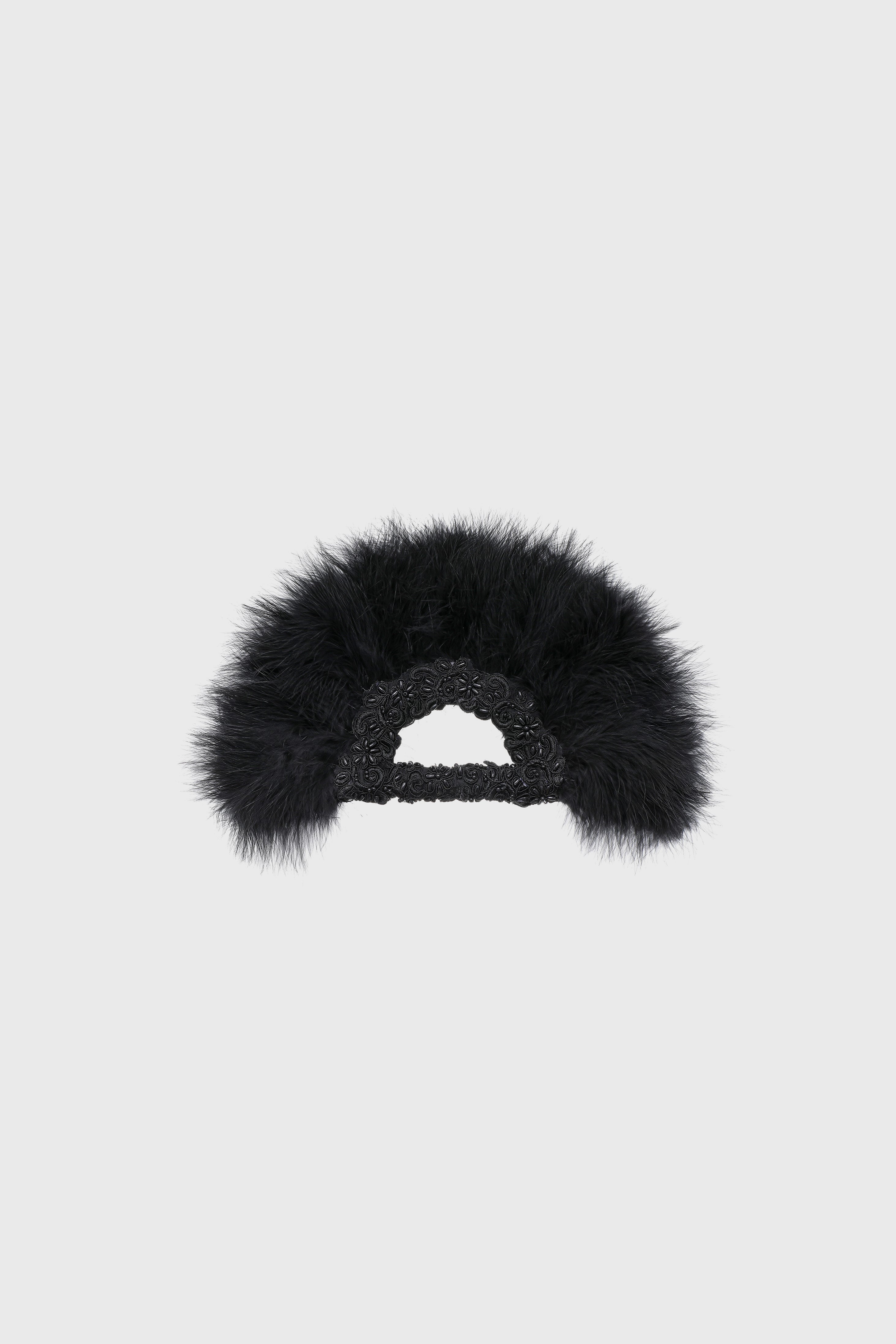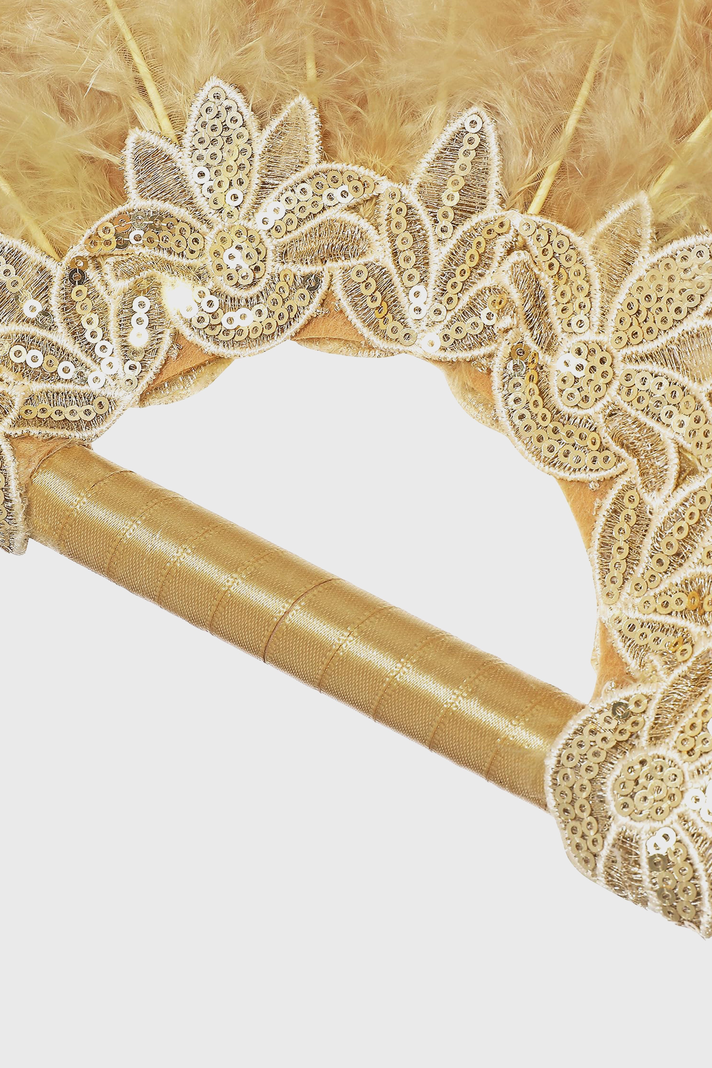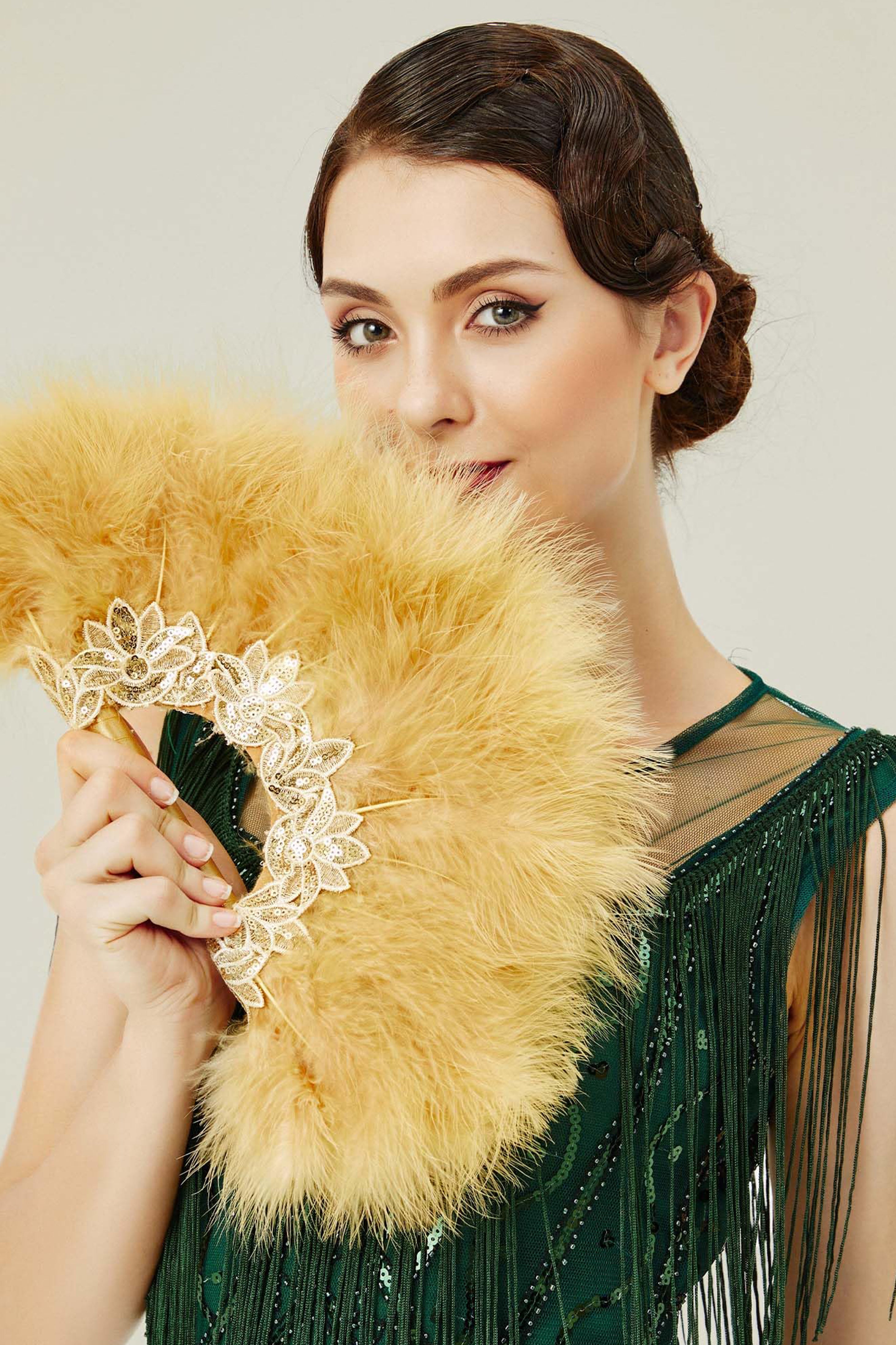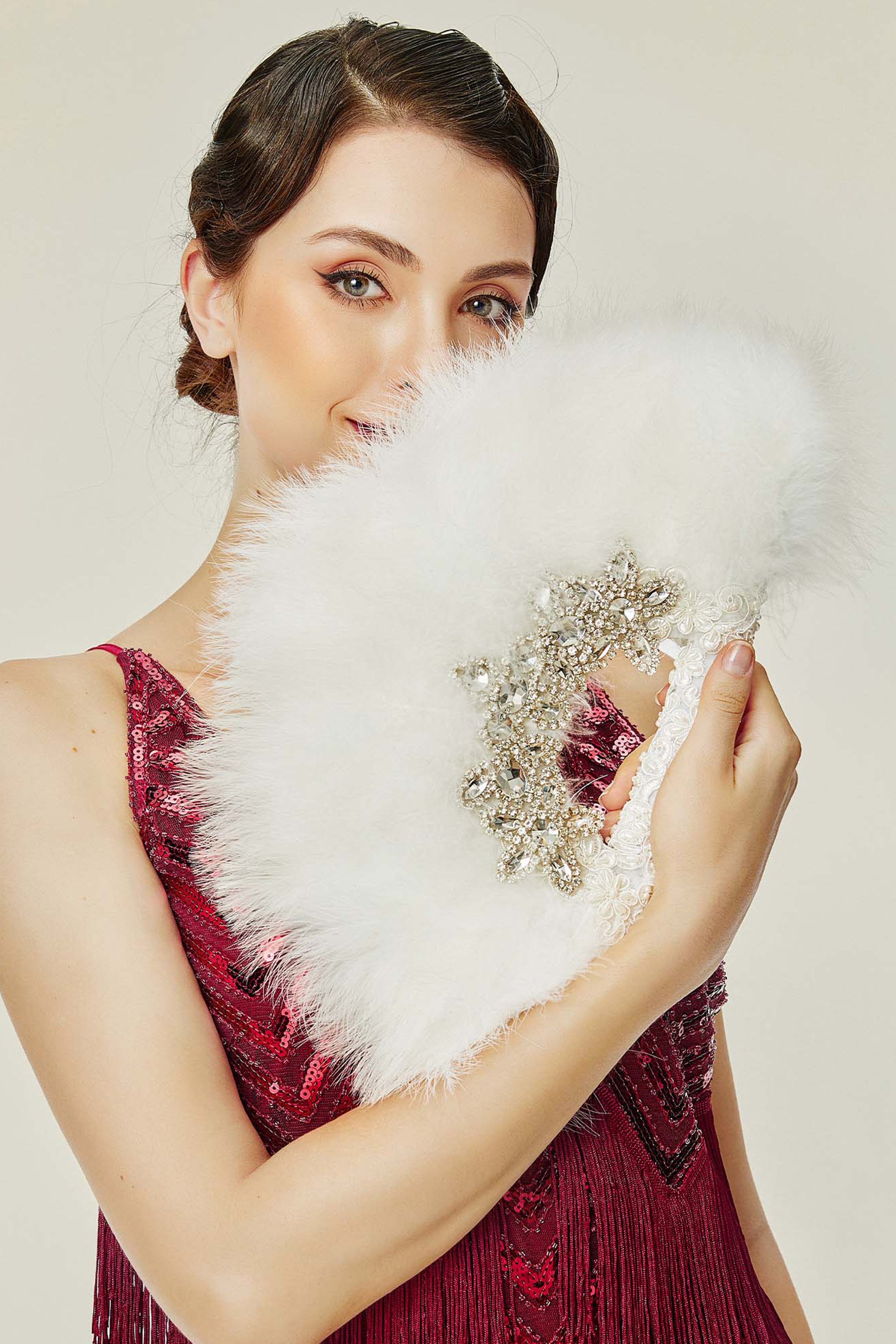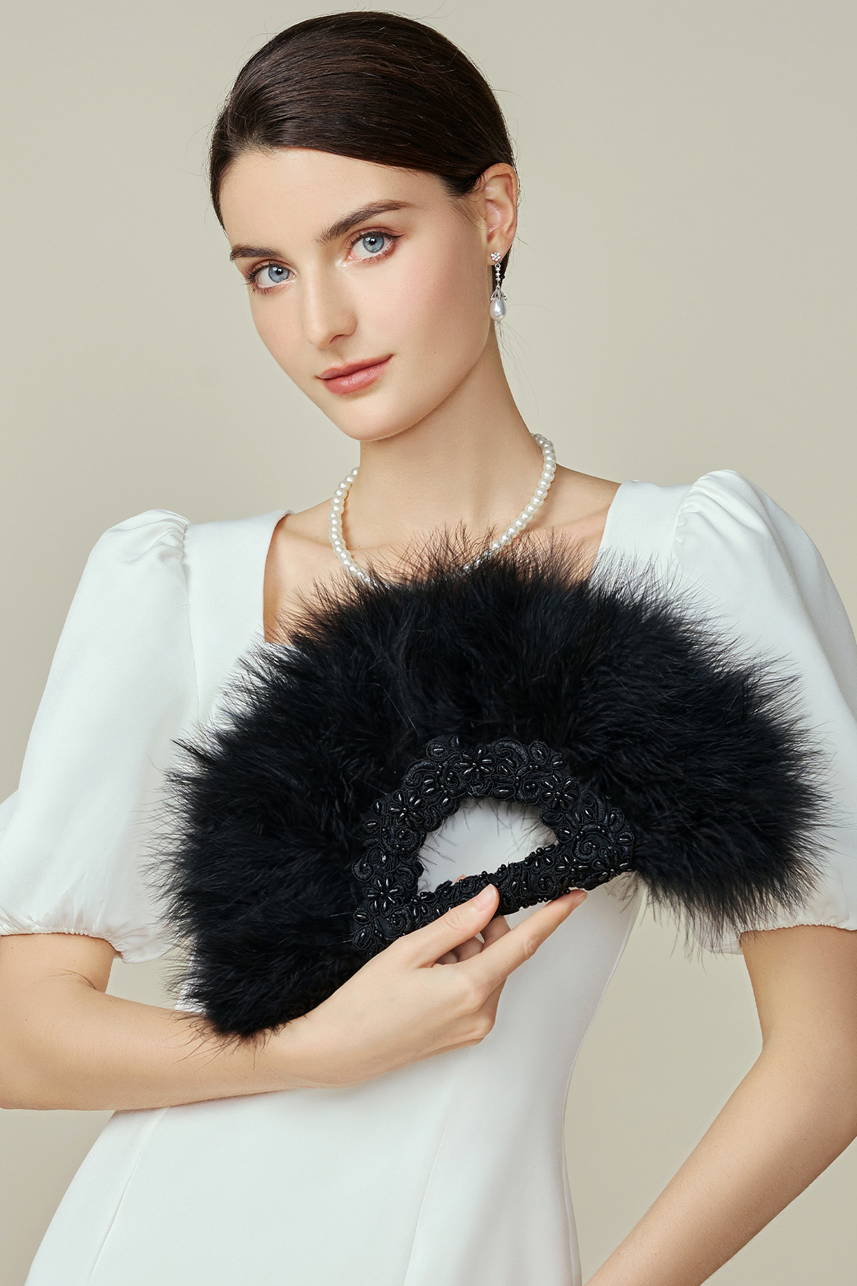 Elevate your Gatsby soirées with this vintage-inspired fan, adorned with plush marabou feathers, lustrous lace fabric, and rhinestone accents for a touch of opulent charm.