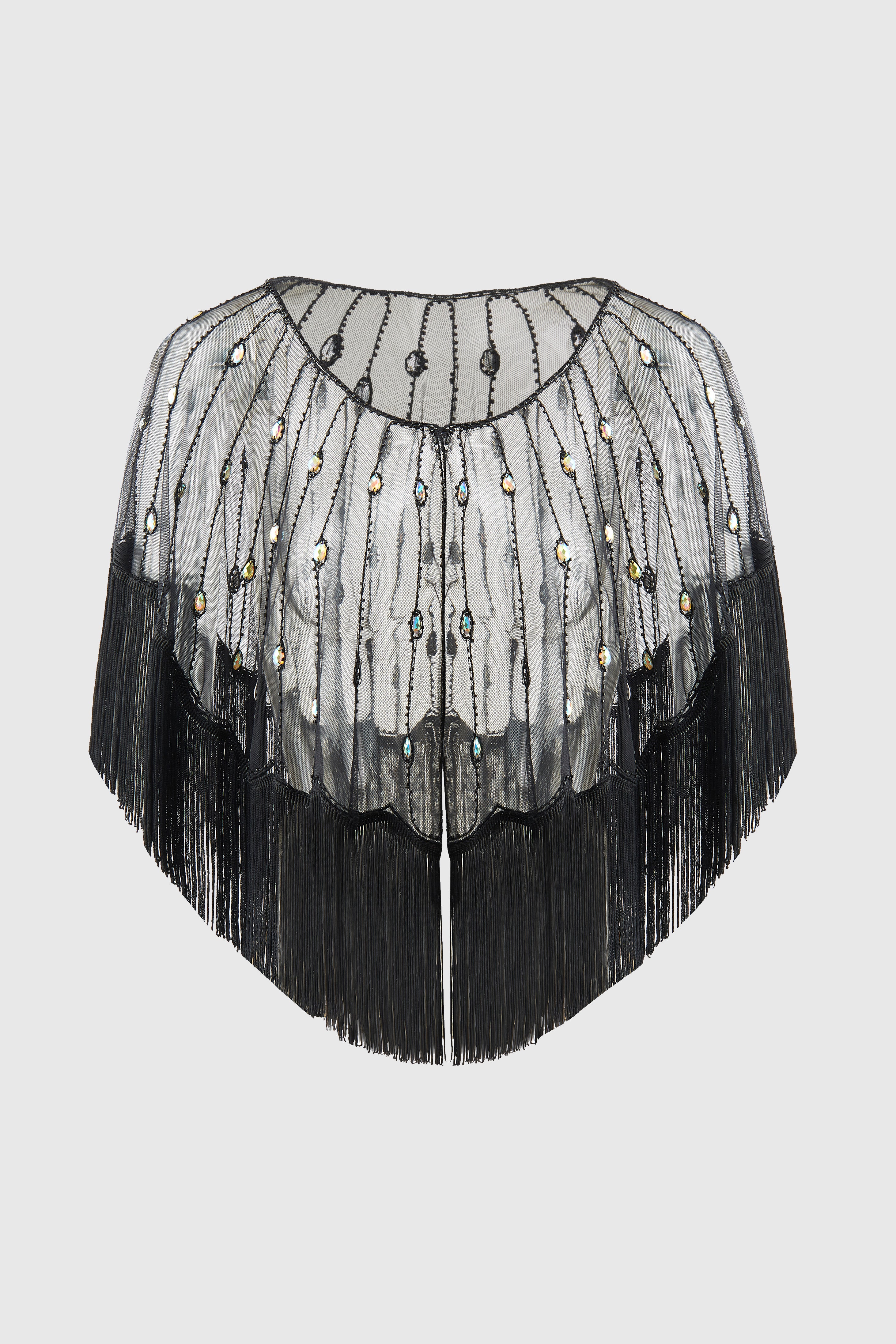 The delicate fringe adds a playful yet refined touch, swaying with elegance. This shawl effortlessly transforms any outfit, perfect for adding a touch of glamour to evening wear or as a statement piece for special occasions.
