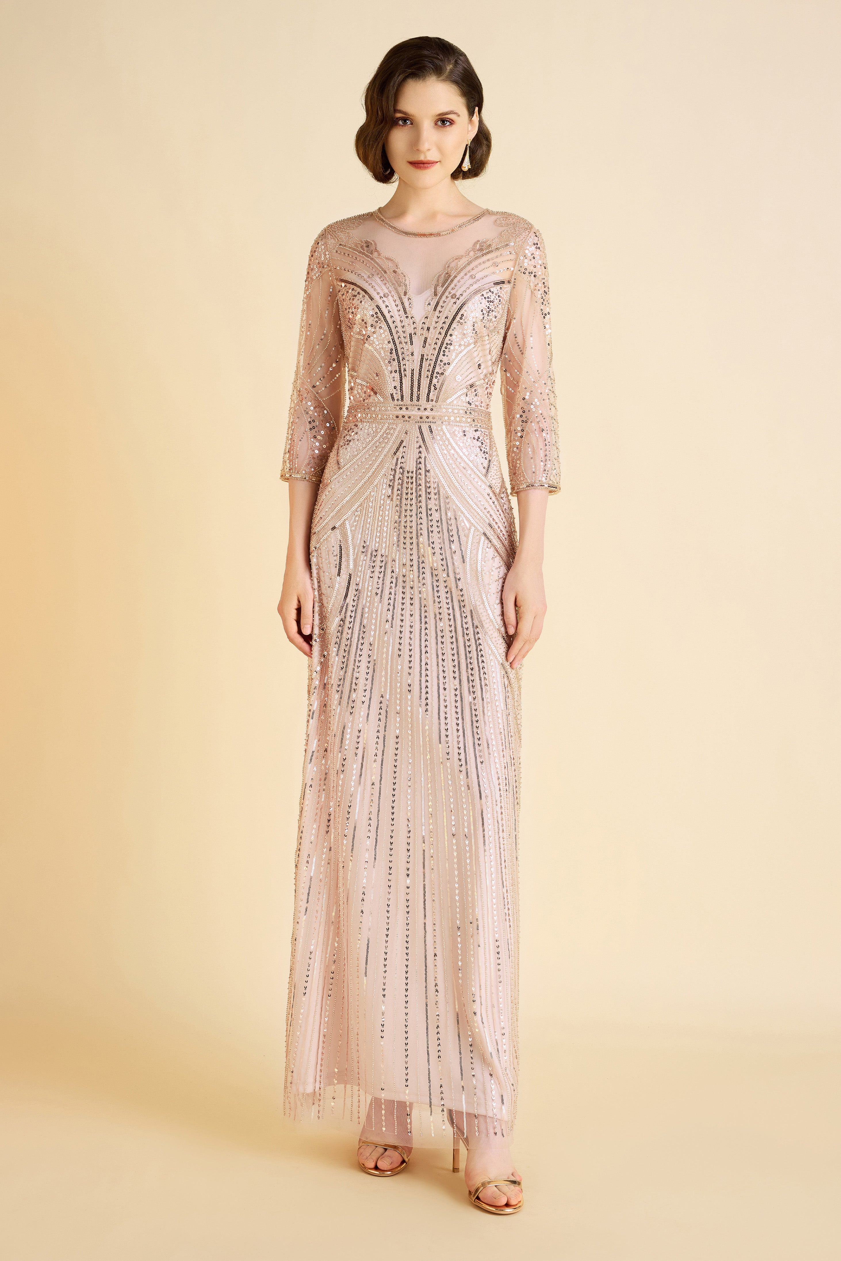 The gown's intricate geometric symmetry, delicately woven with floral accents, creates a mesmerizing visual effect that exudes sophistication. A round neckline paired with a see-through overlay adds just the right amount of allure, while the sheer 3/4 sleeves bring an ethereal charm. Thoughtfully designed with a geometric pattern that contours the hips, this gown offers a flattering silhouette that enhances your natural shape.