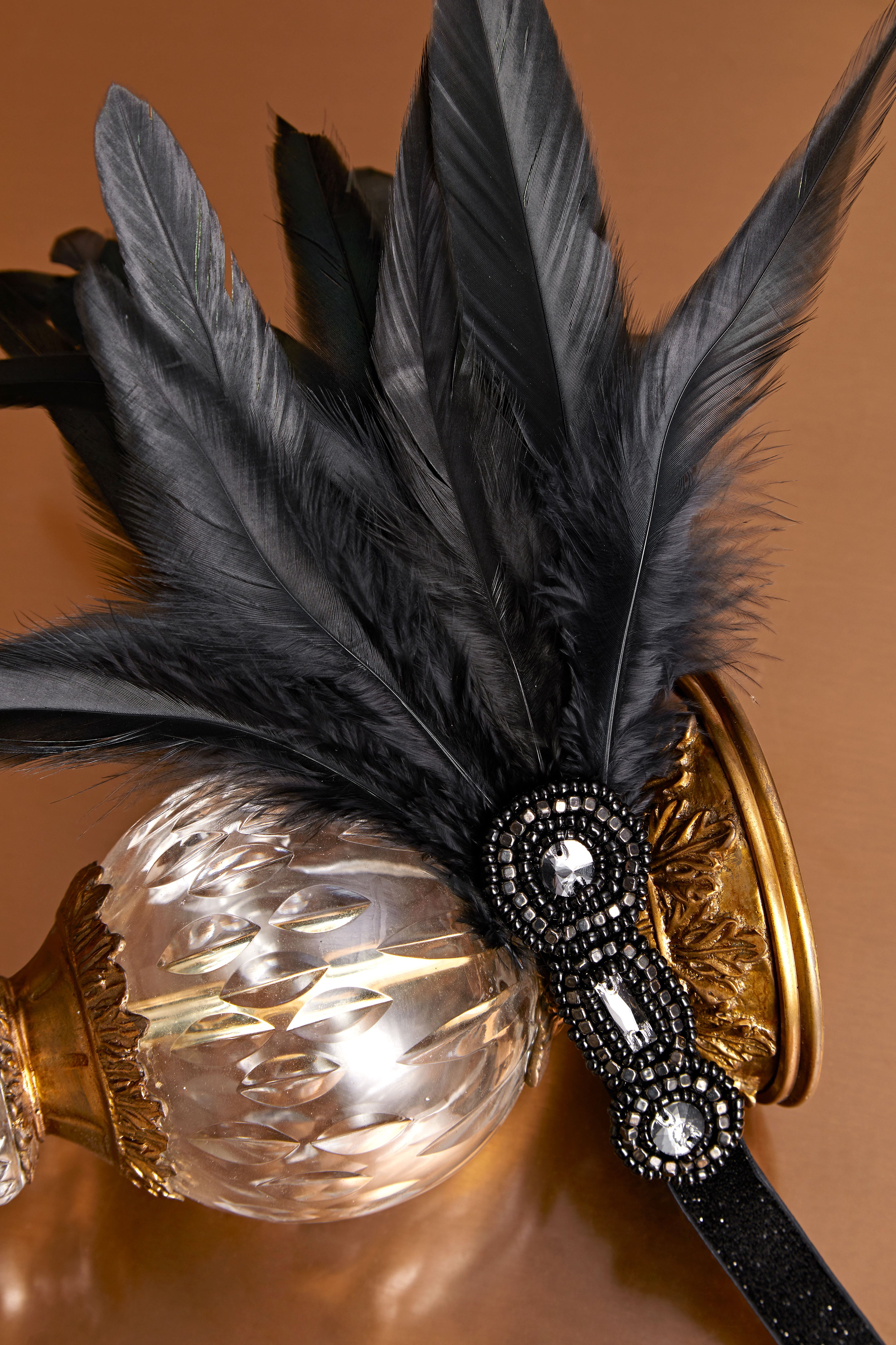 - Beaded crystals and peacock feather