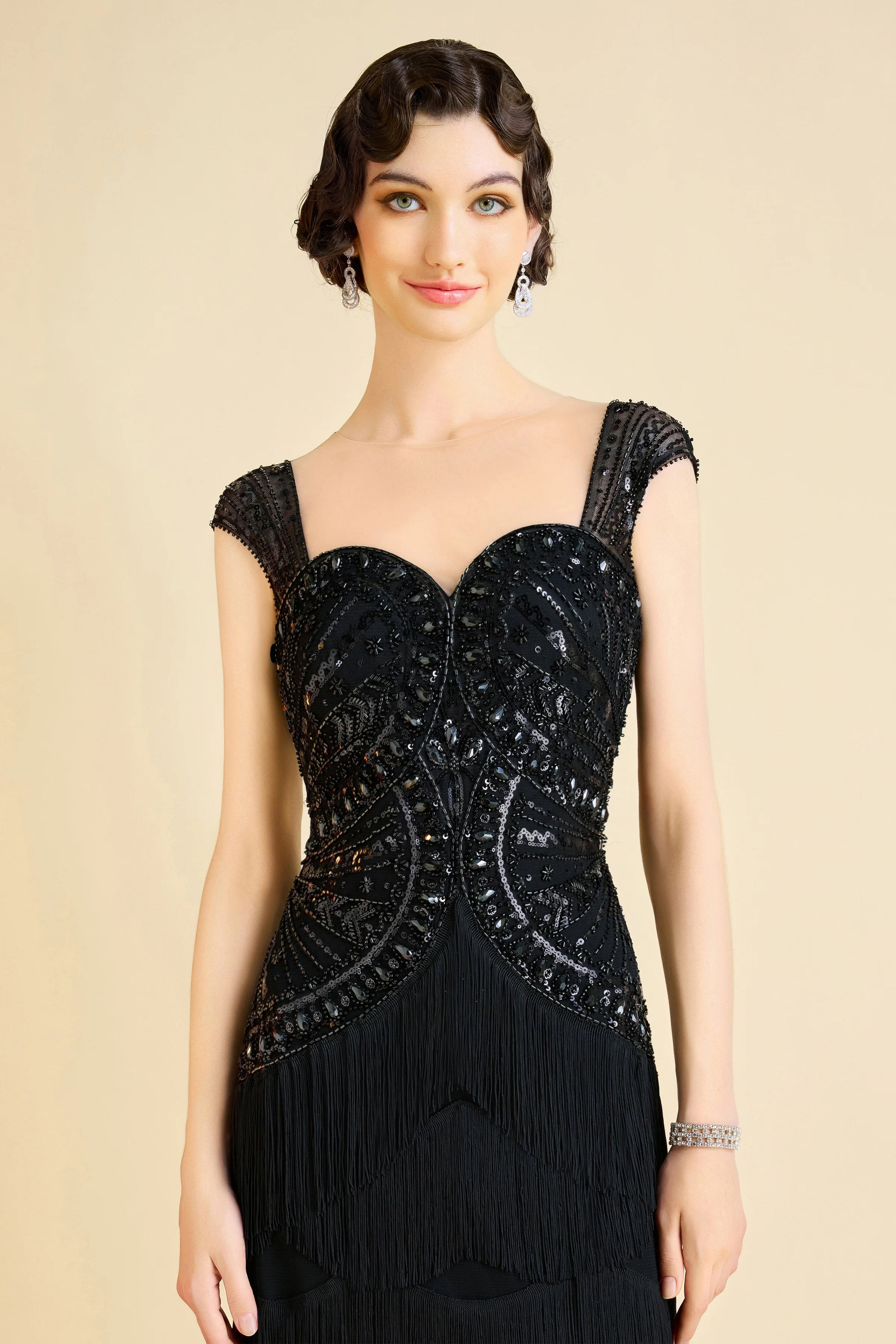 Experience the epitome of sophistication with our exquisite evening gown, a fusion of elegance and craftsmanship. Featuring a refined diamond-shaped collar and graceful cap sleeves, it accentuates a tailored waist for a flattering silhouette. The gown is adorned with intricate geometric embroidery and hand-embellished with sparkling gemstones, exuding luxury at every turn. The unique fishtail fringe dress, reminiscent of shimmering scales, creates a mesmerizing effect with every step.