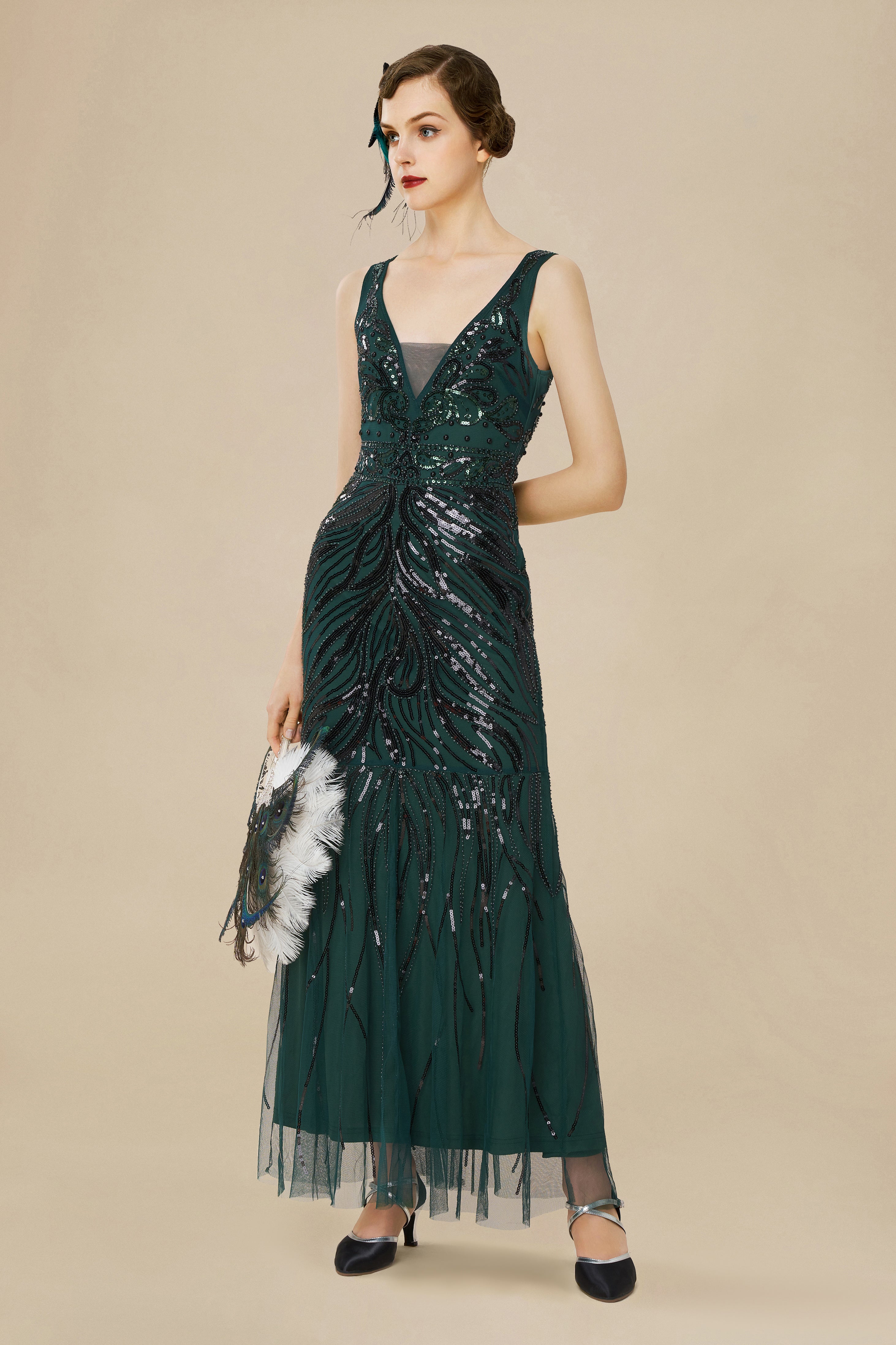 The eyecatching bold v-neck and tulle coverage design create a unique style for your vintage look. Elegant floor-length dress adorned with shimmering sequins and beading.