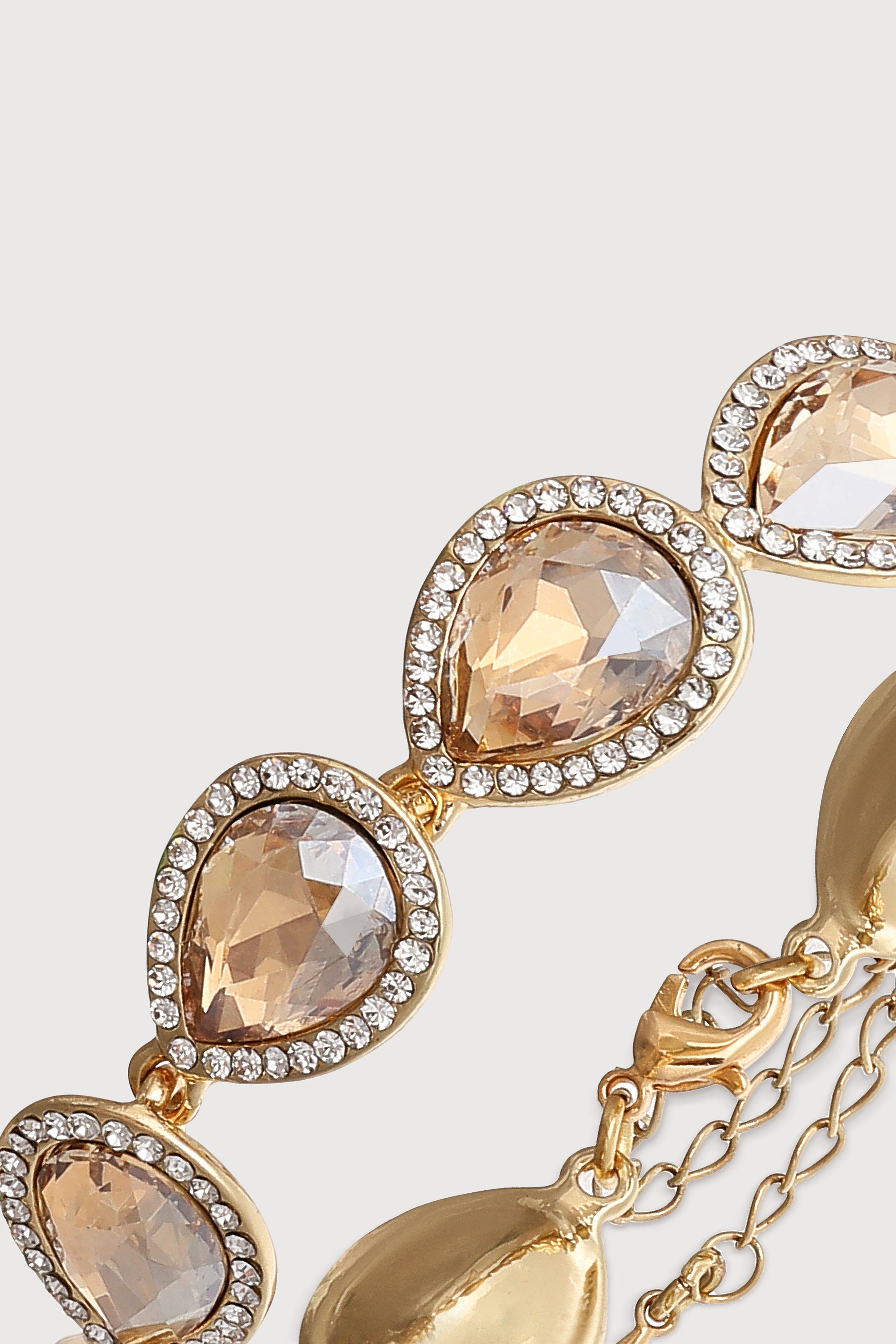 This stunning gold-tone bracelet features elegant teardrop-shaped crystals, each framed by shimmering rhinestones. With its adjustable chain closure and lightweight design, it offers both comfort and sophistication.