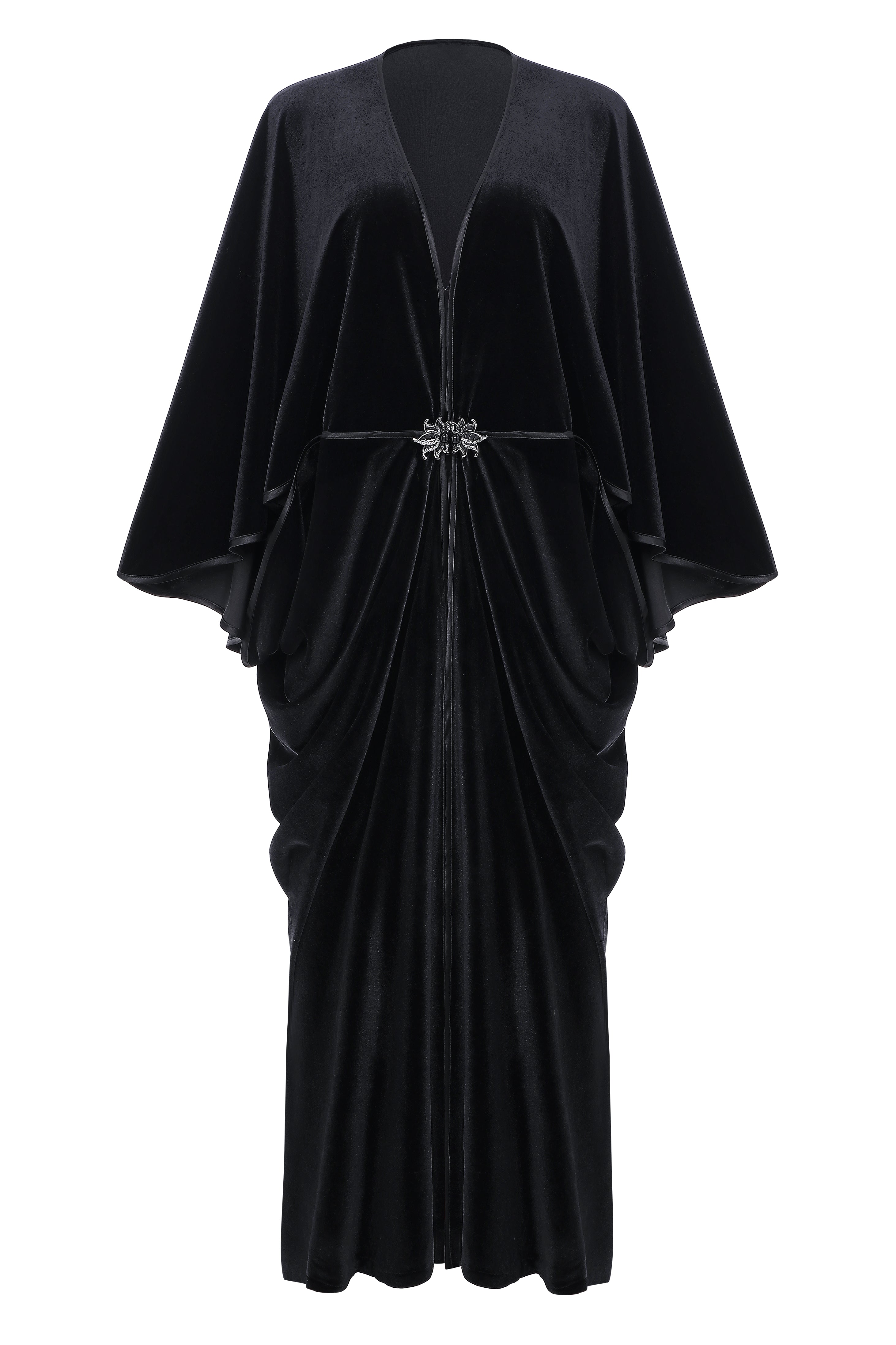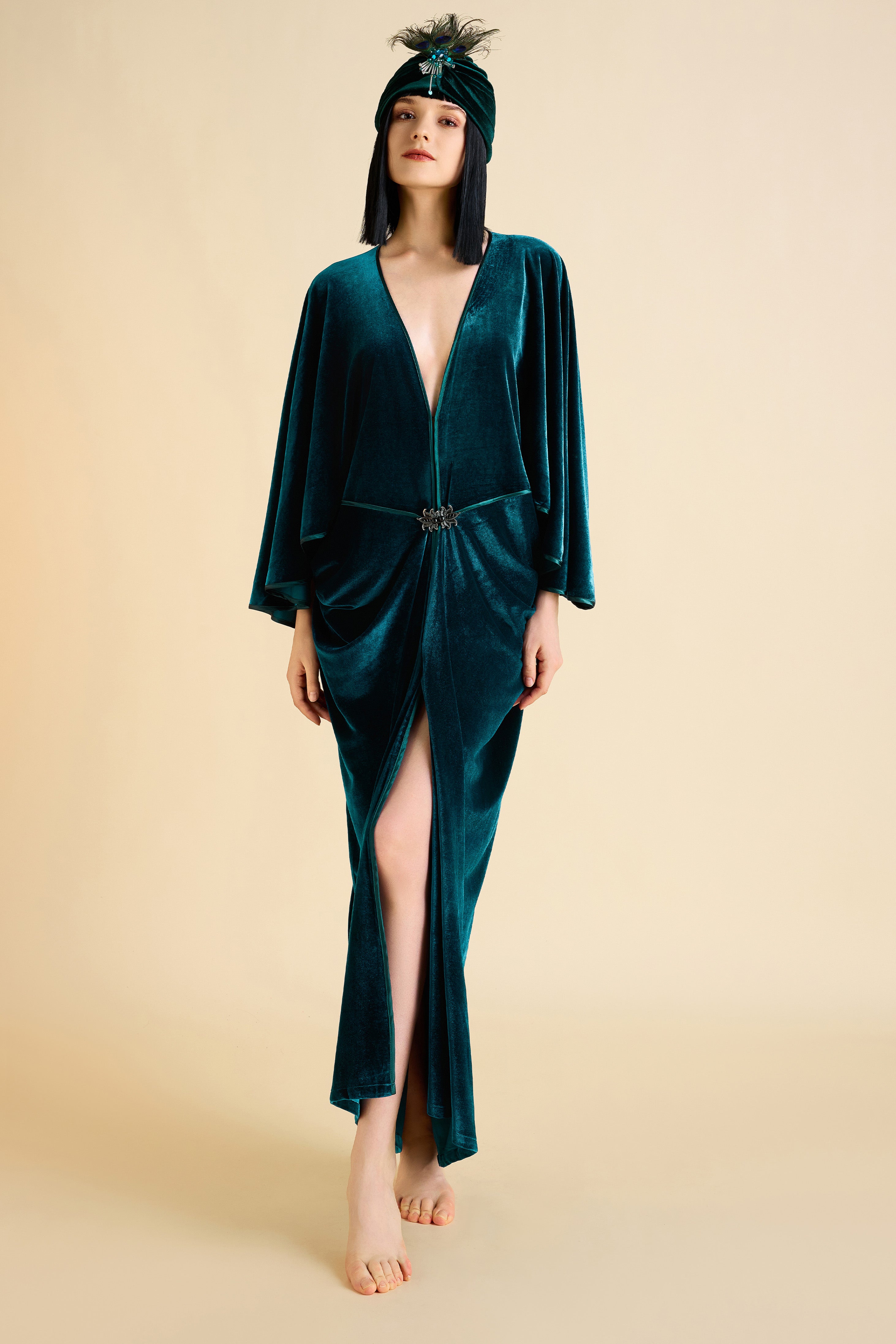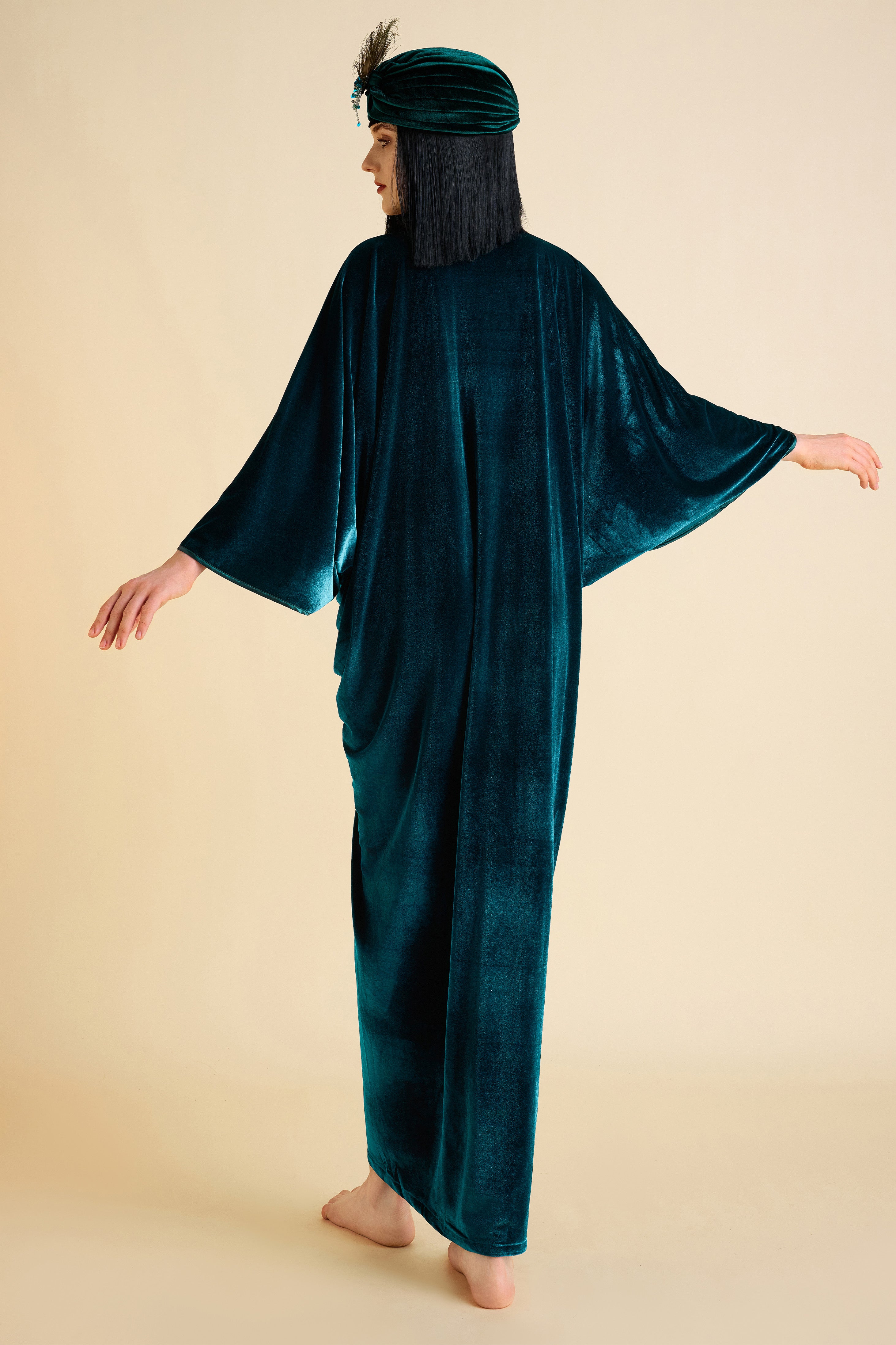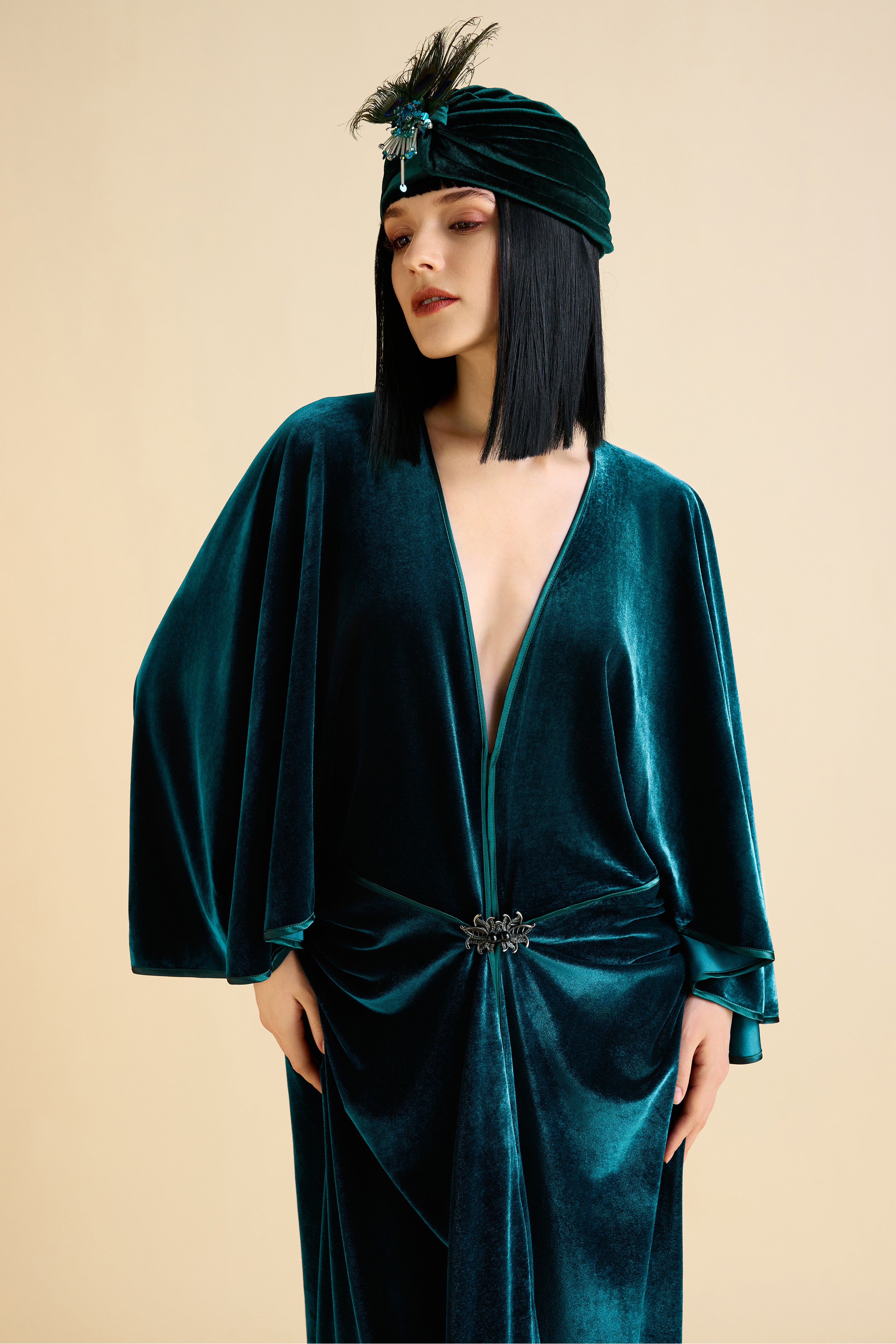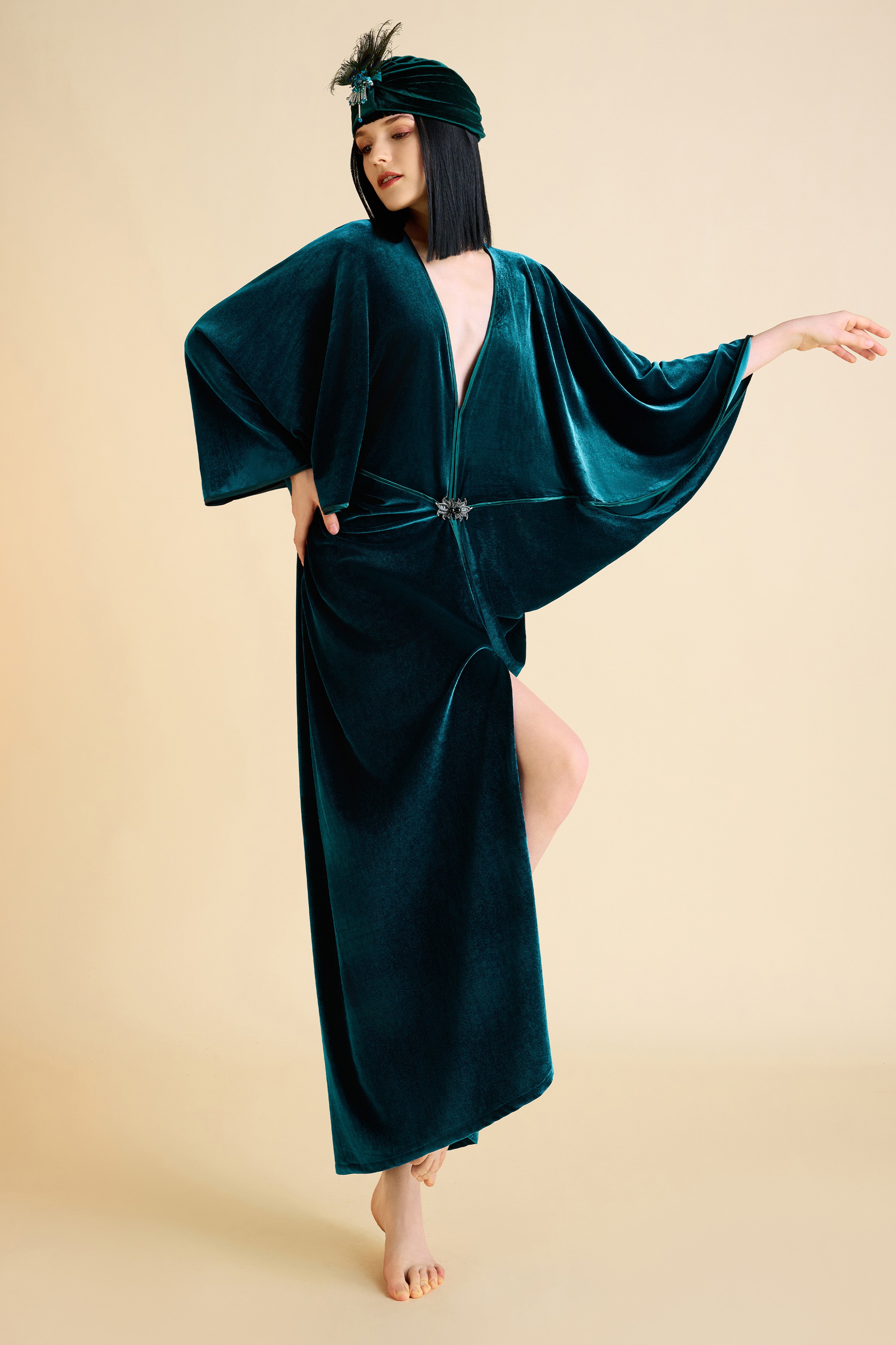 This captivating dress features luxurious batwing sleeves that create a striking silhouette, reminiscent of the iconic 1920s fashion. The strategically placed slit adds a hint of allure and movement, perfect for showcasing a daring yet graceful style. Crafted from premium, soft-touch fabric, this robe dress drapes beautifully on the body, offering both comfort and a flattering fit.