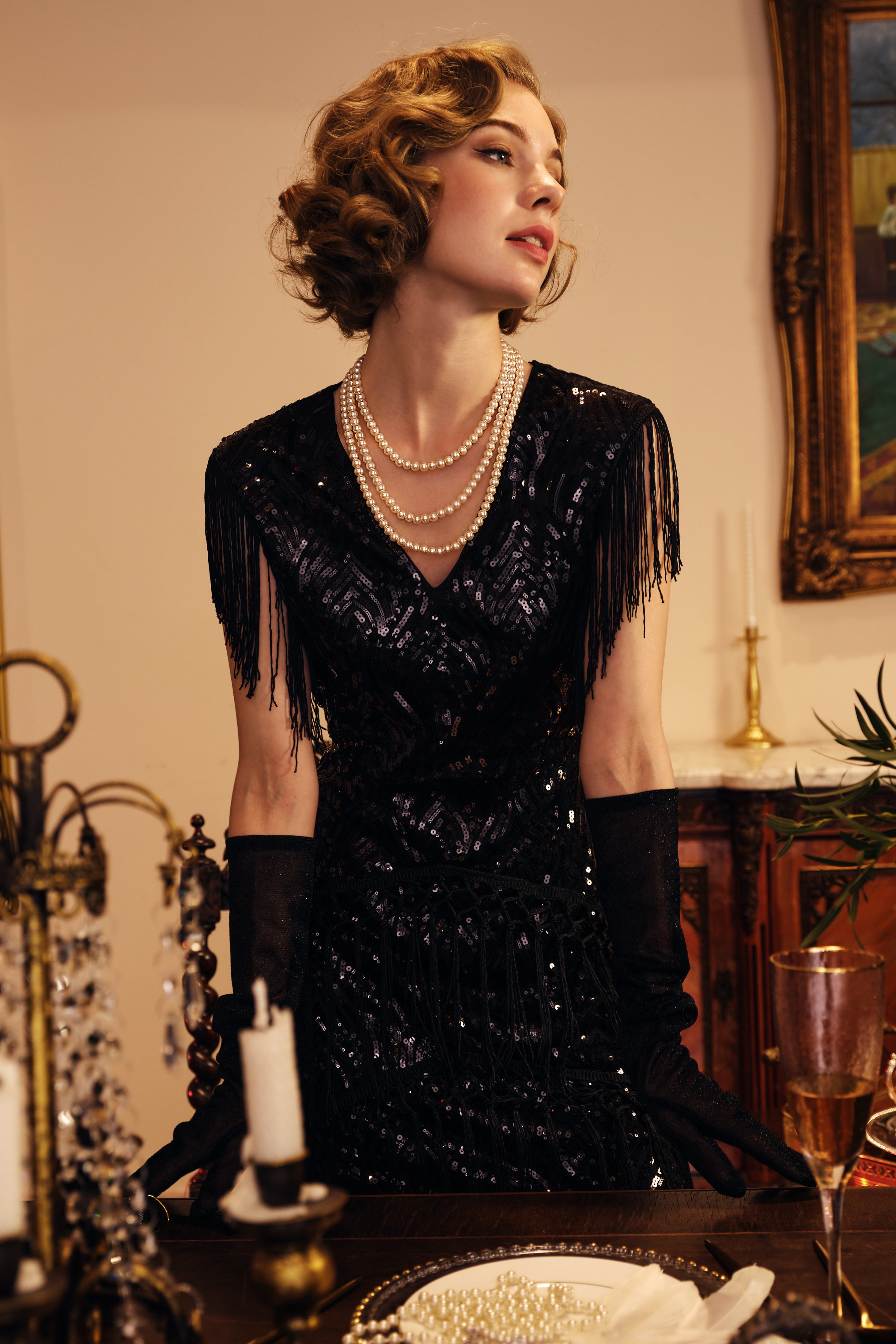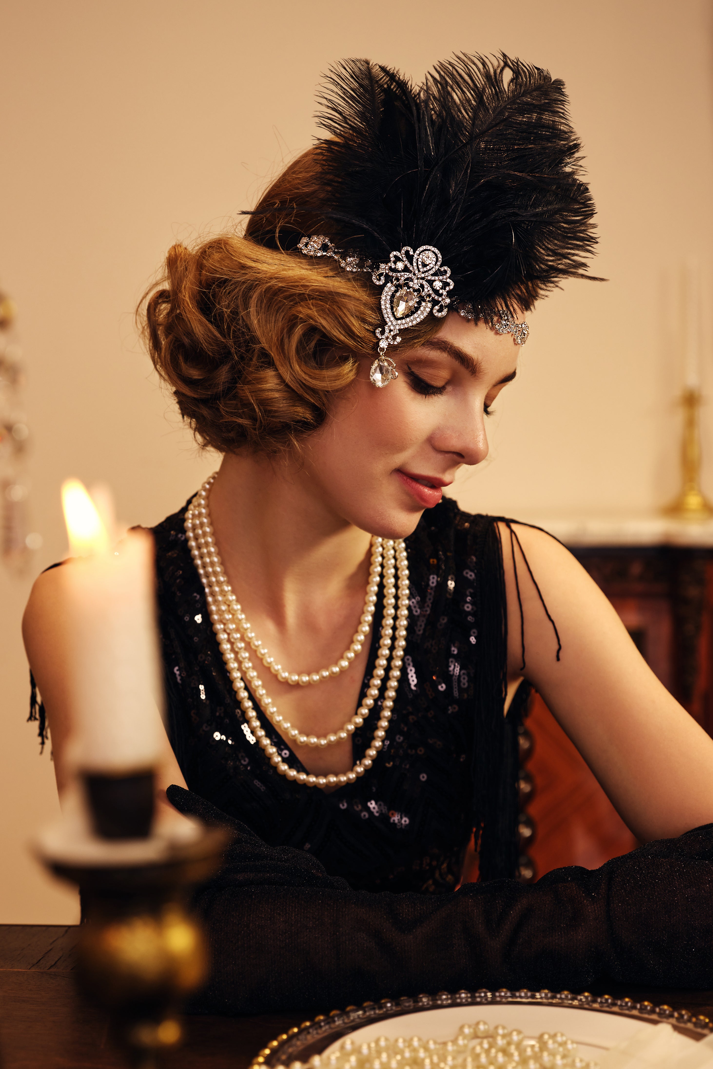 This sumptuous piece of jewelry features a retro-elegant yet slightly modern style that complements the lavish garments, reminiscent of the roaring 1920s.