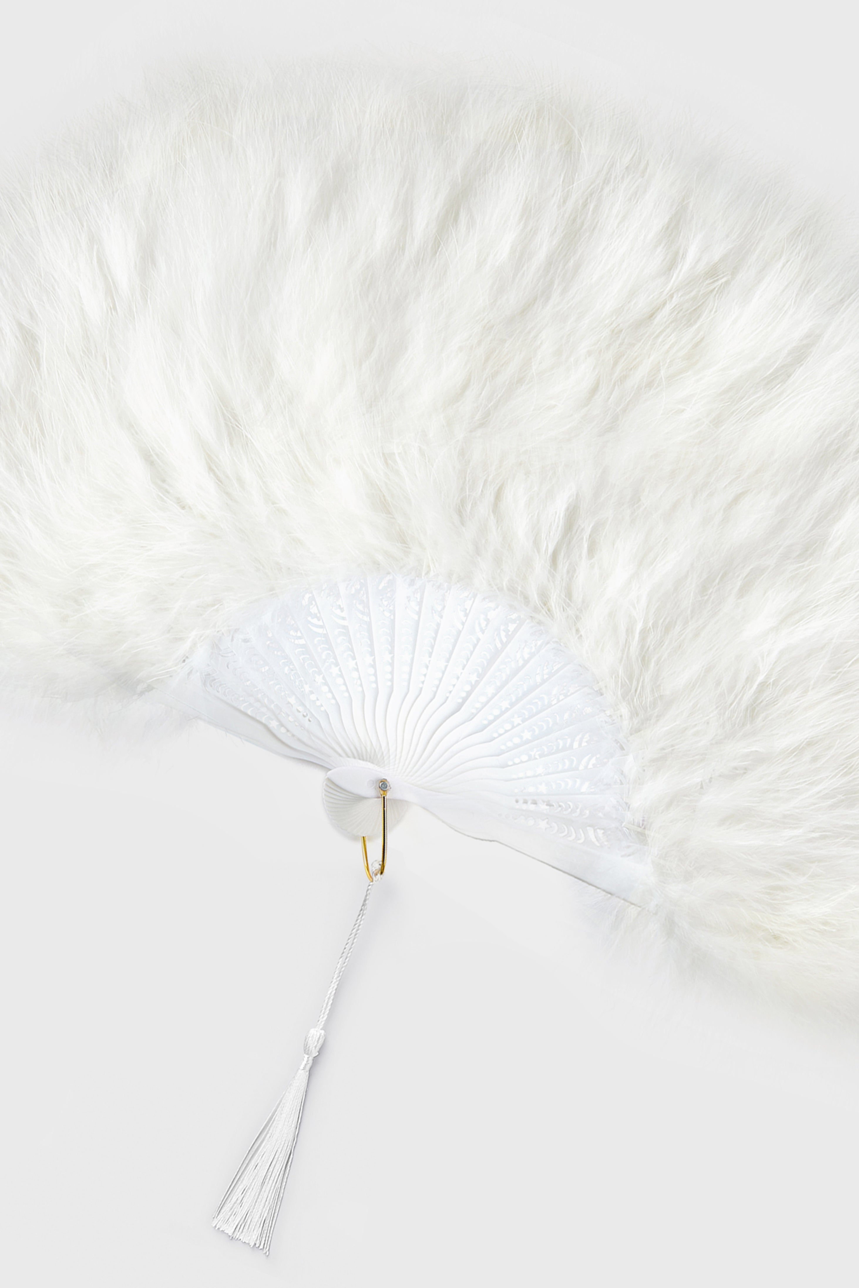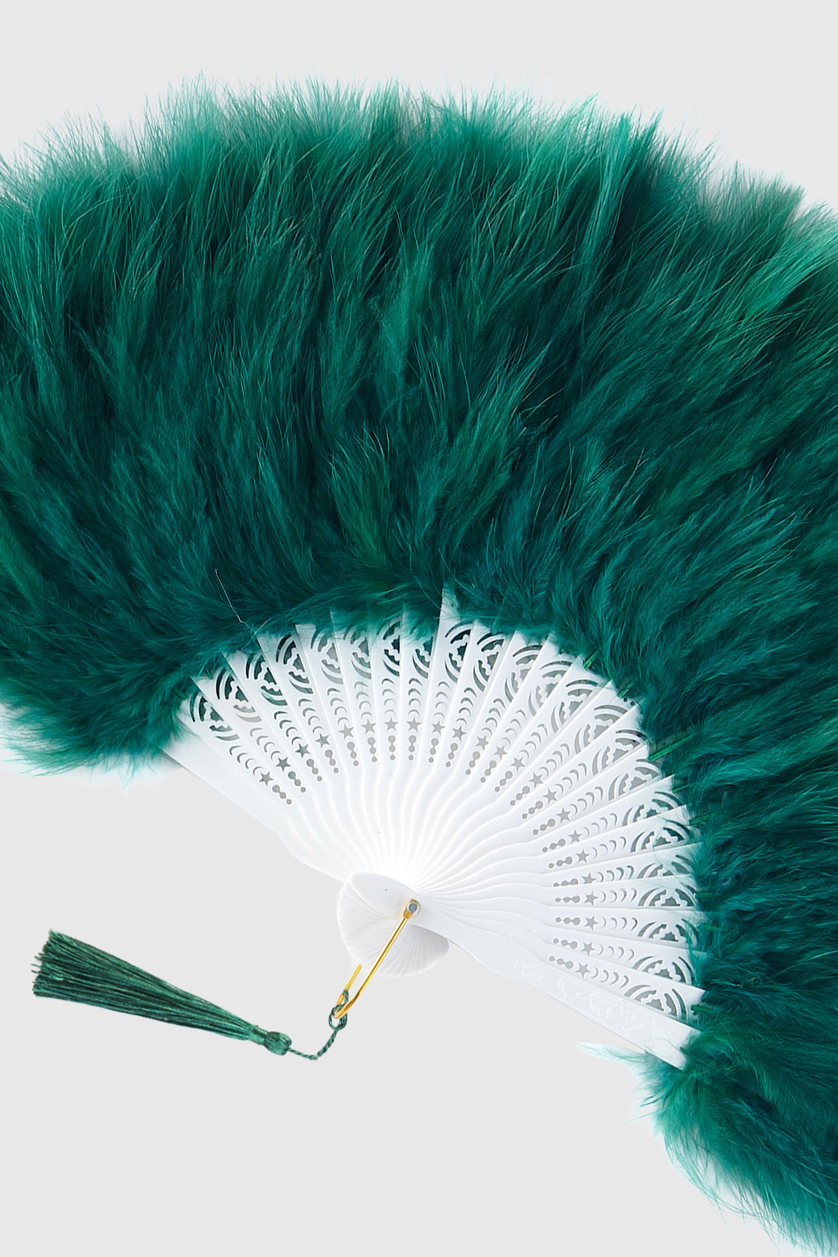 A retro-elegant dramatic feather bouquet fan with fluffy soft feathers. Hold it and be the showstopper of the party.