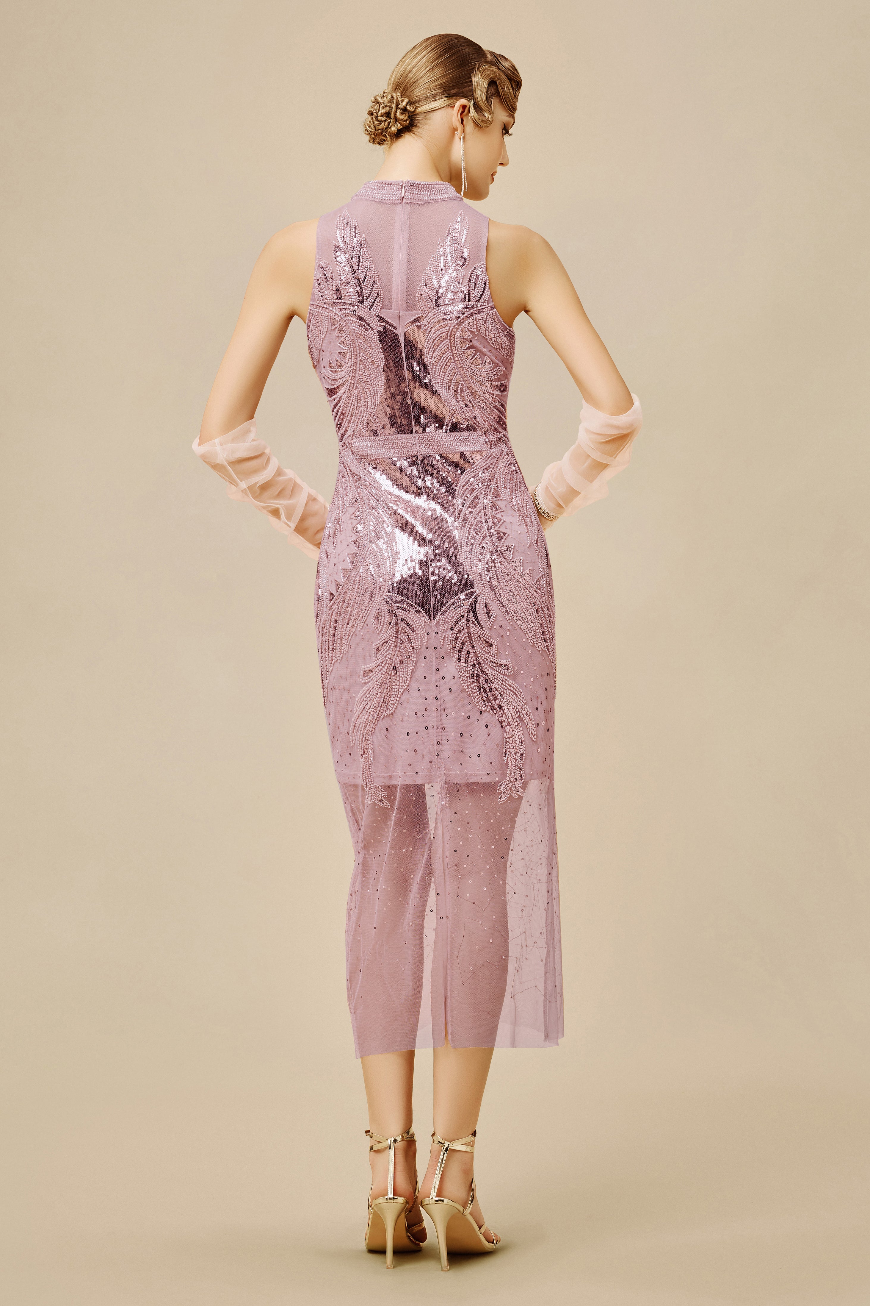 Evoking the Roaring Twenties' spirit, our collection, inspired by Josephine's 'La Revue Nègre', blends tradition with modern elegance through embroidered feather motifs. Elevate your style with this exquisite evening gown featuring delicate feather pattern and intricate beading.