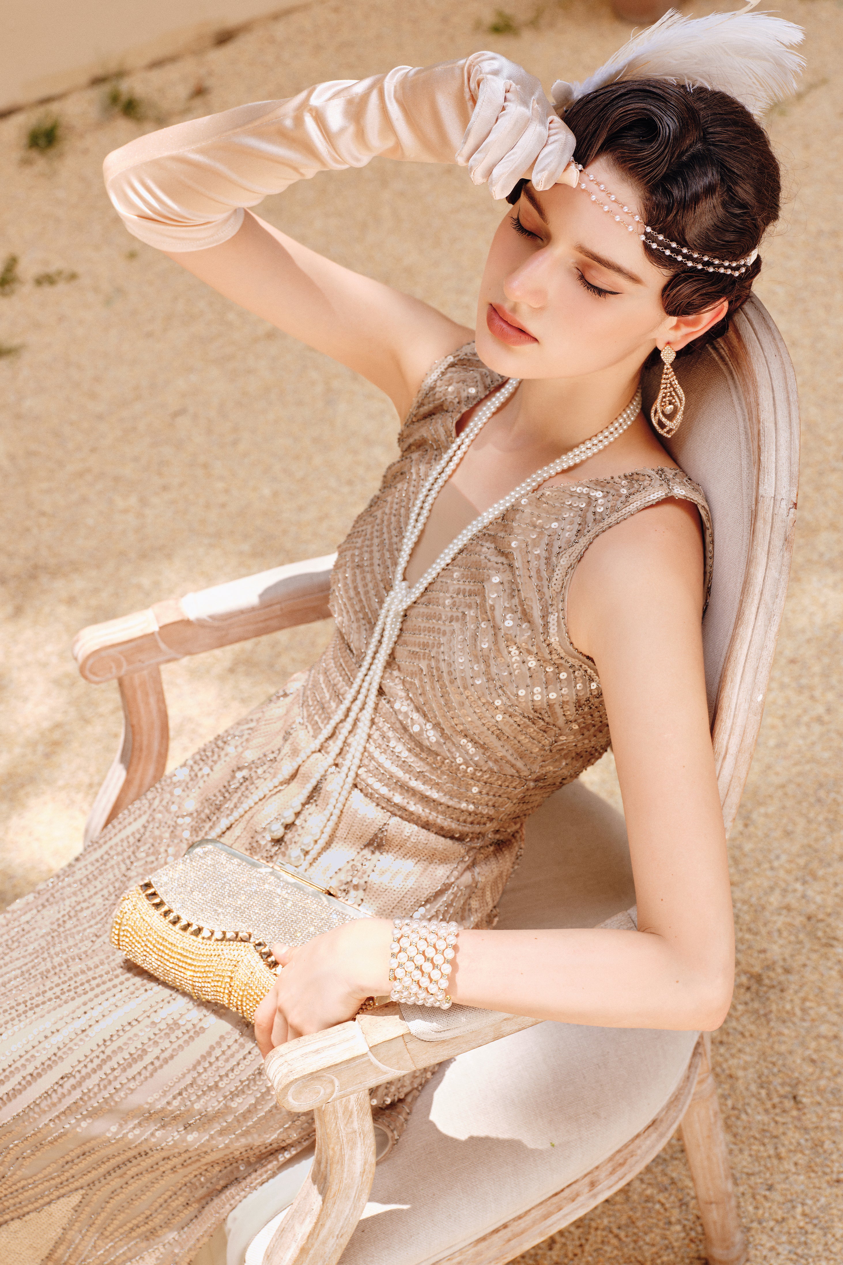 The elbow length satin gloves, which perfectly create an elegant and sophisticated Gatsby style, suit for all kinds of fancy flapper outfits.