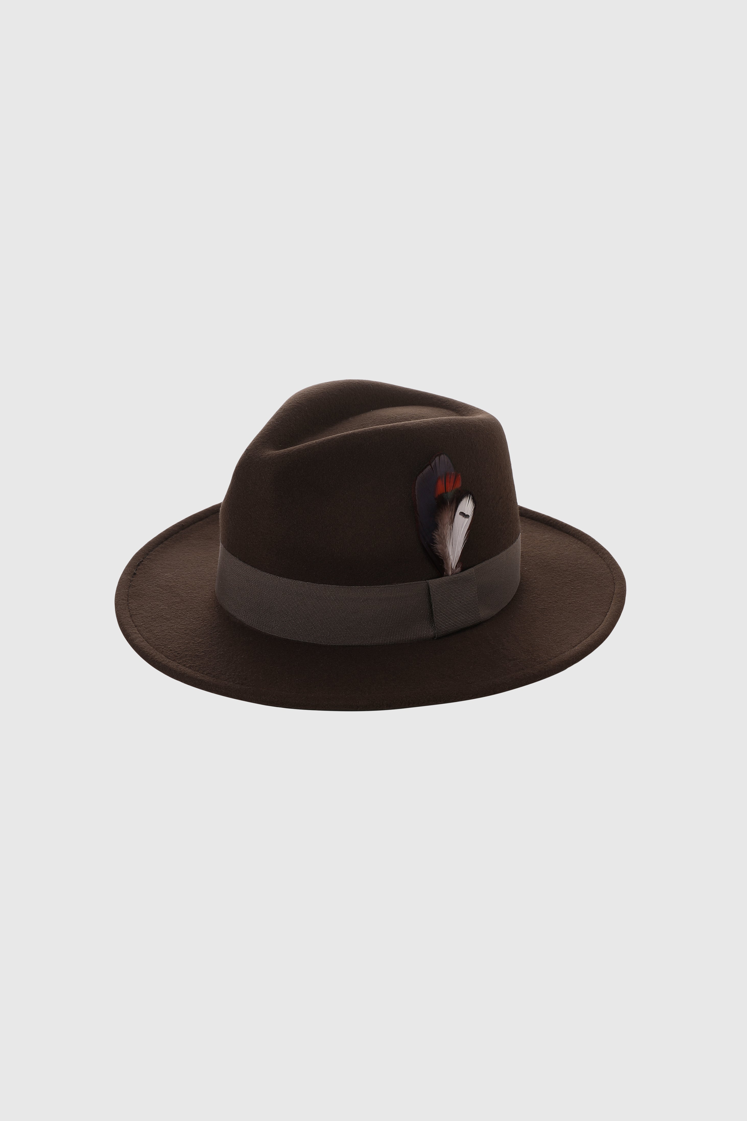 This hat features a structured silhouette crafted from a soft polyester-cotton blend, accented with a smooth grosgrain band and removable layered feathers for a refined, distinctive look.