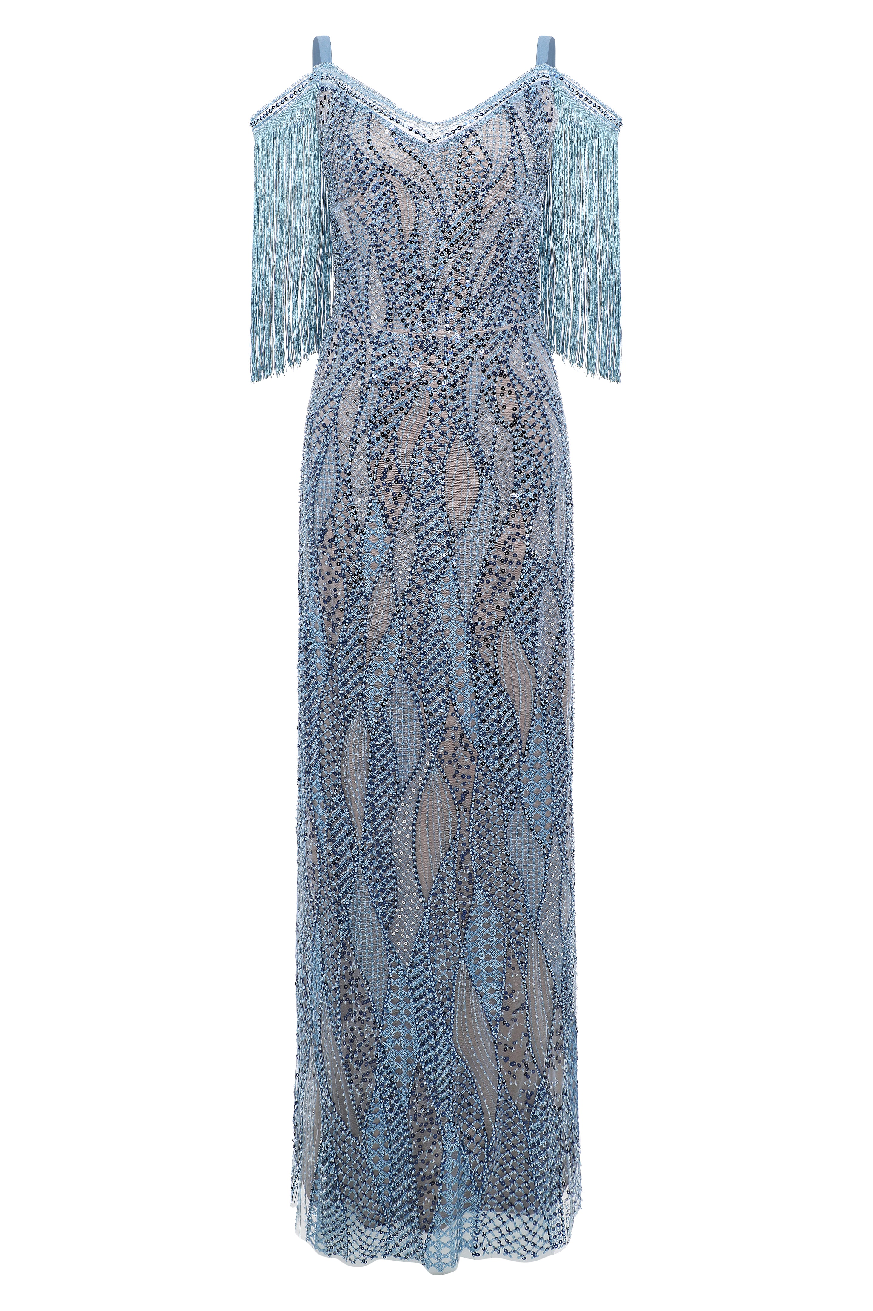 This original design reimagines Art Deco elegance through sculptural beaded wave patterns that contour and elongate the figure. Draped fringe sleeves frame the shoulders with architectural precision, while a plunging V-shaped back reveals a bold yet refined line. With its dynamic geometry and deliberate symmetry, this gown is a wearable statement of timeless form and movement.