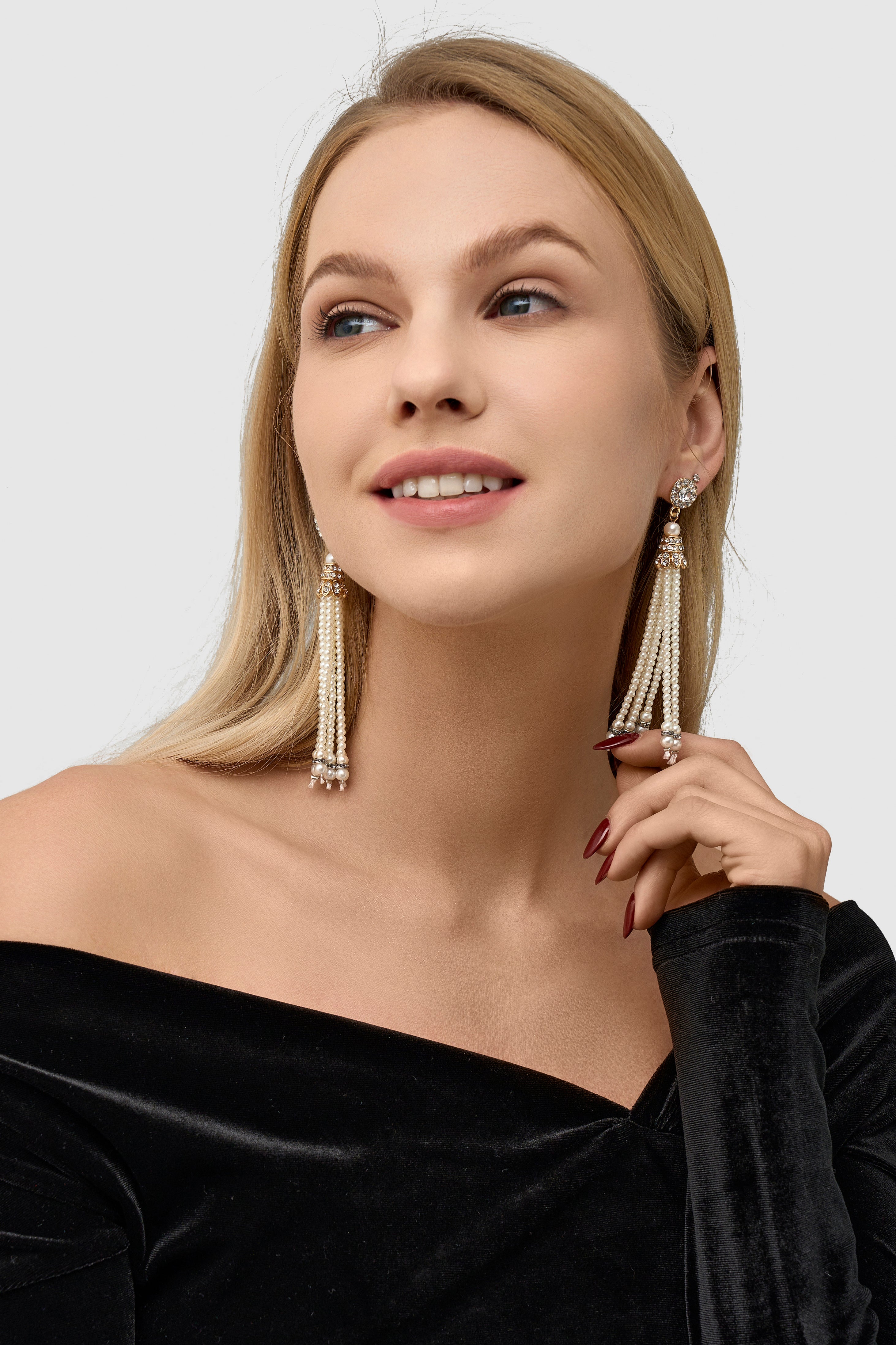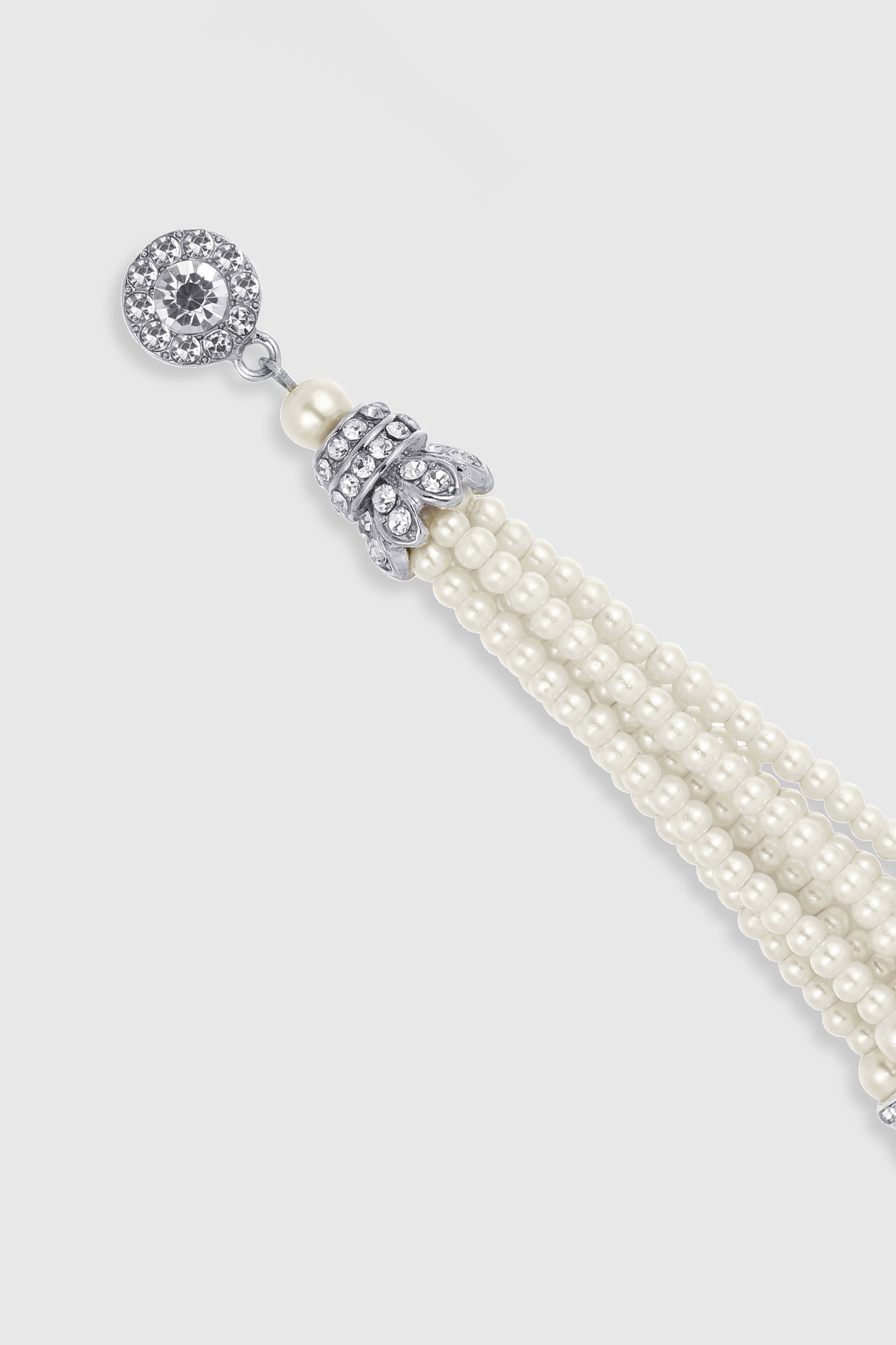 This sumptuous piece of jewelry features a retro-elegant yet slightly modern style that complements the lavish garments, reminiscent of the roaring 1920s.