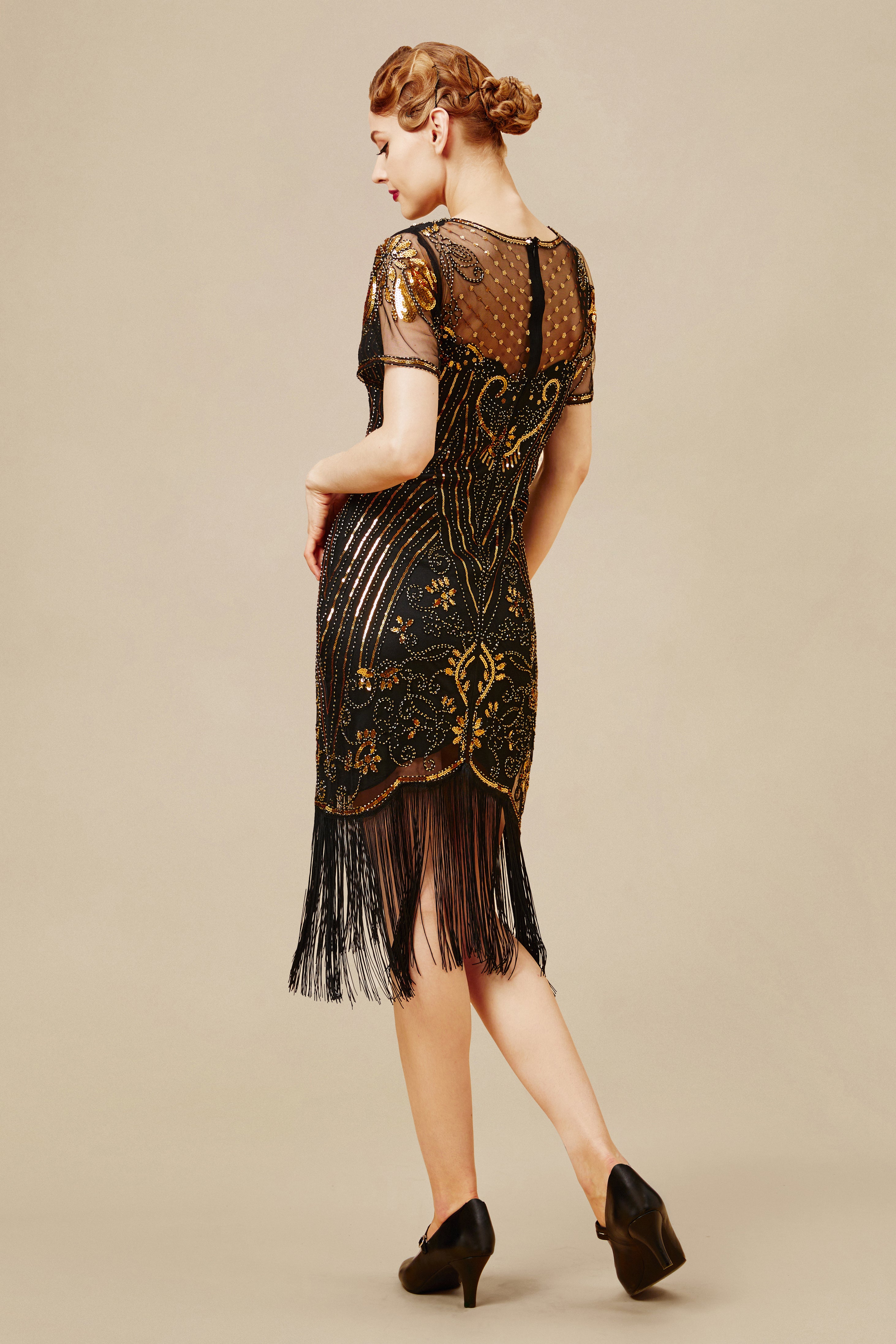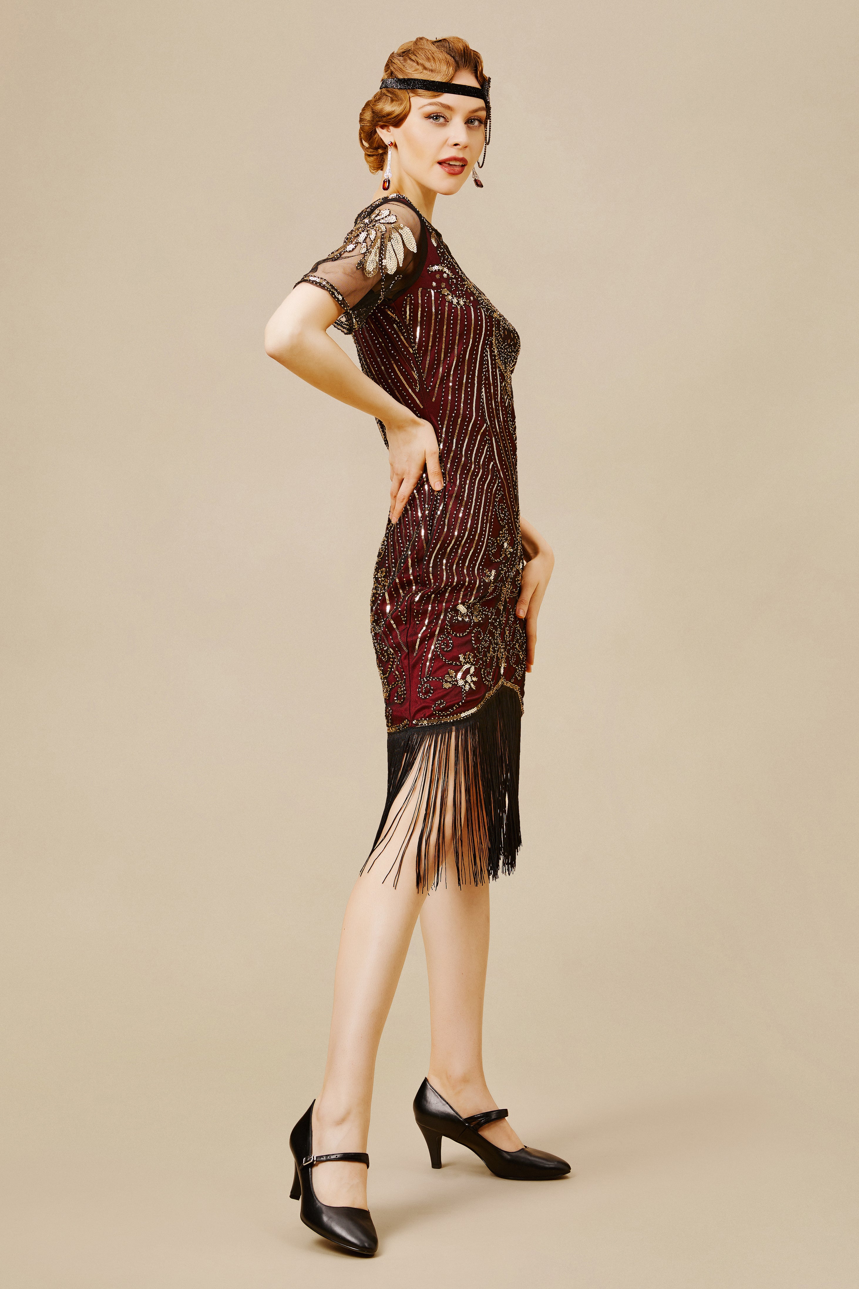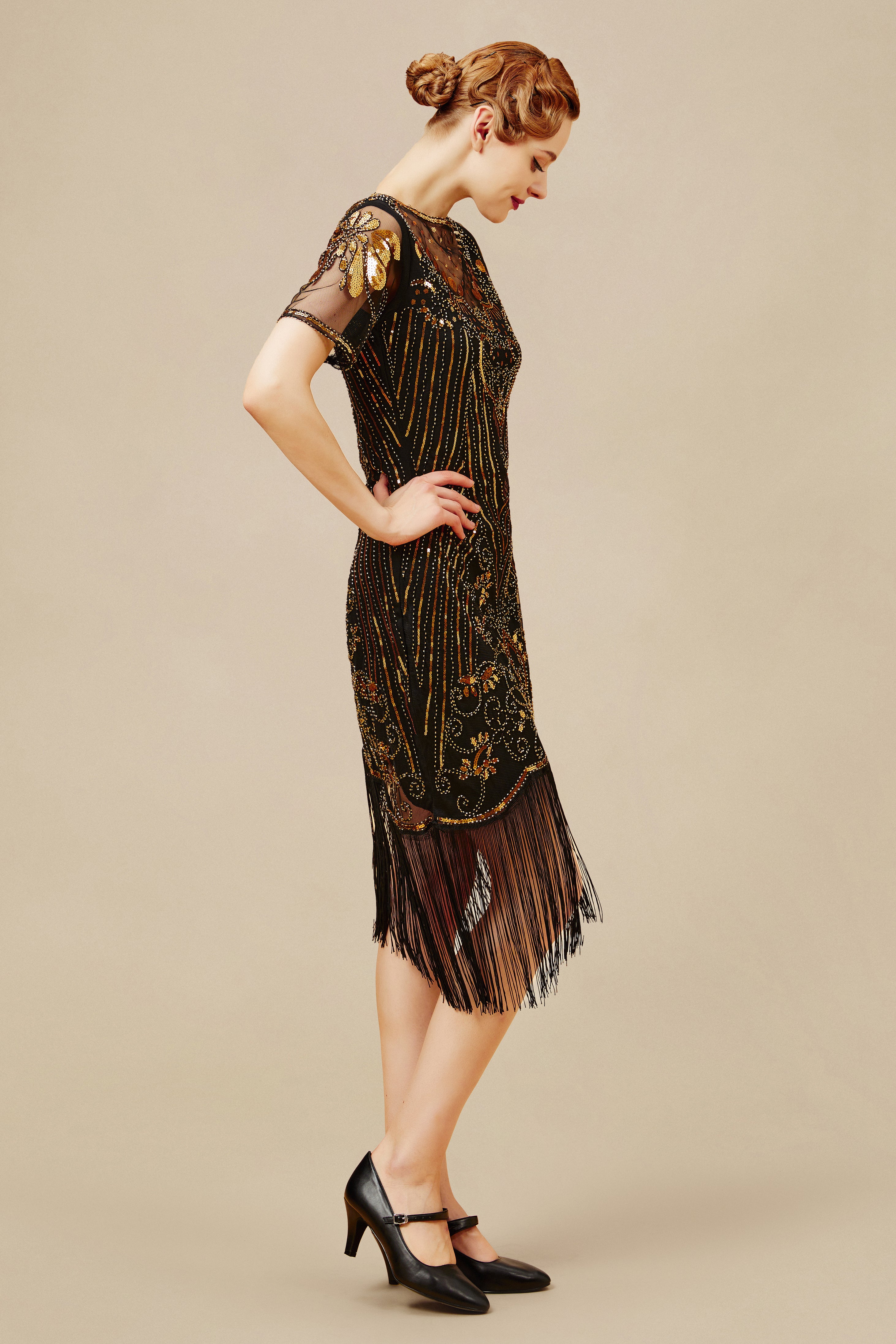 This fringed dress is classic vintage look for a modern woman. The eyecatching design features art deco print and unique vintage style which bring you back to the roaring twenties.