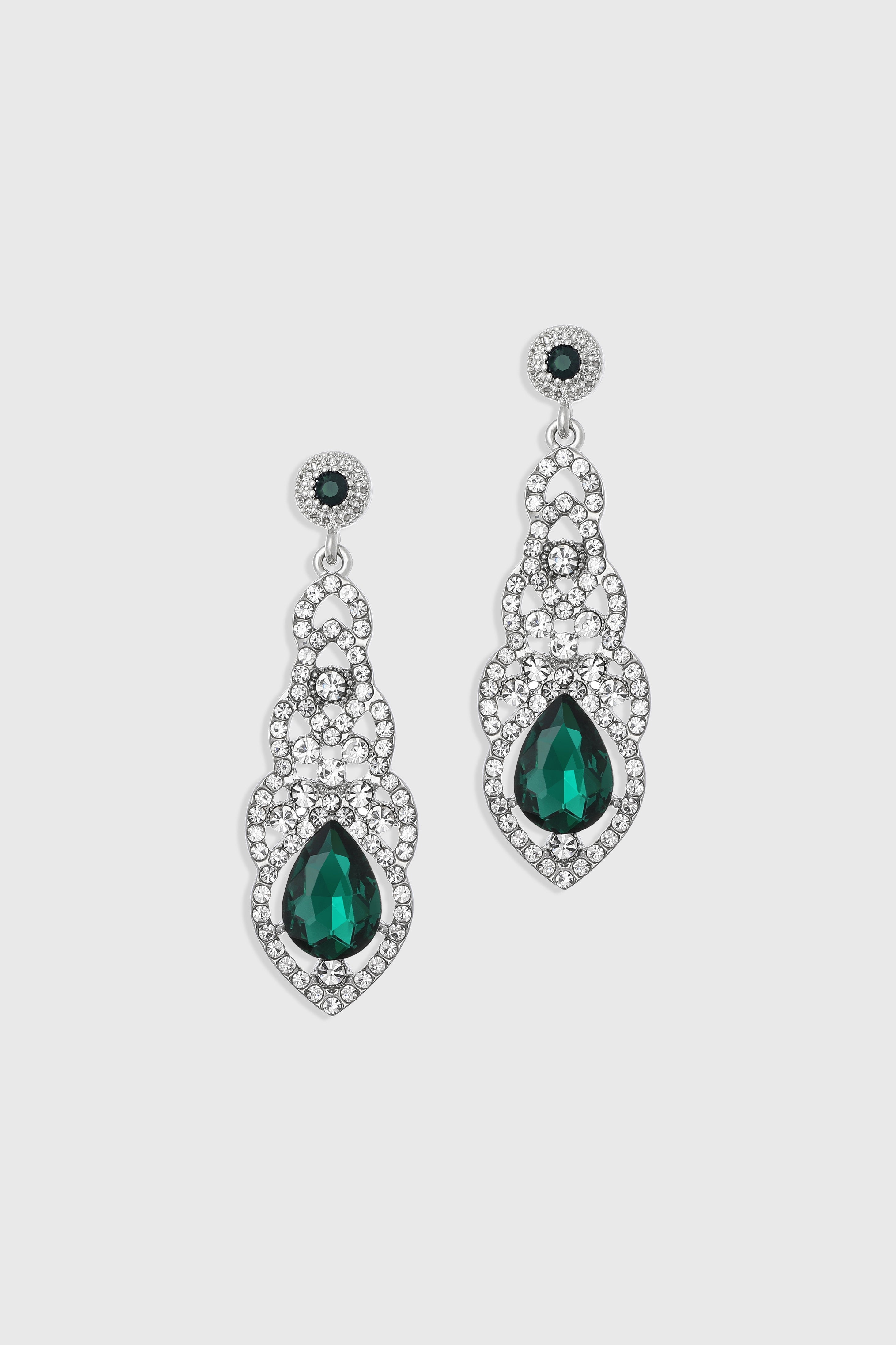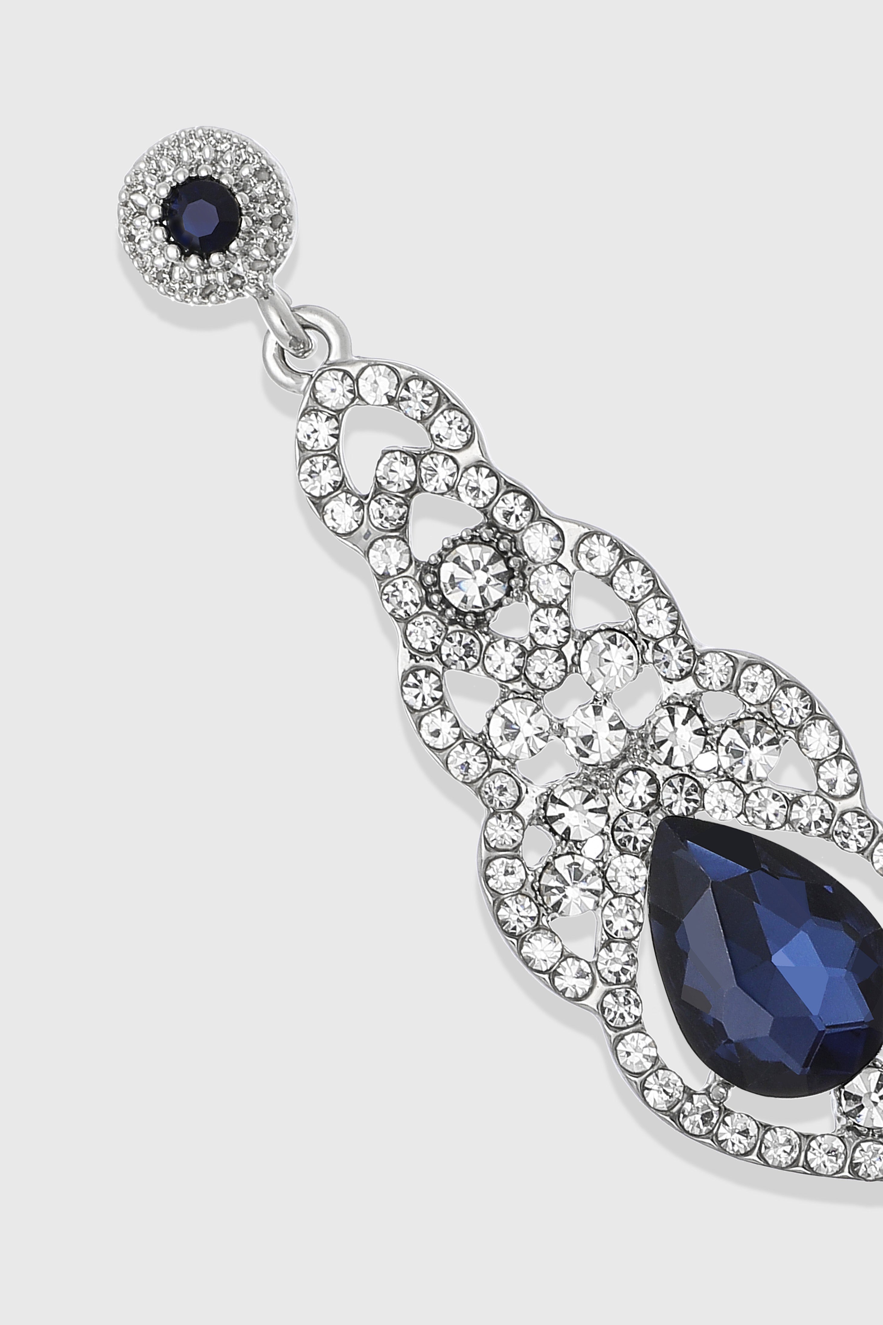The delicate filigree pattern, adorned with shimmering pavé-set rhinestones, creates a captivating contrast against the gold-tone metal. The long-drop silhouette gracefully elongates the neck, ensuring you’ll make a memorable impression wherever you go.