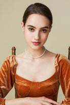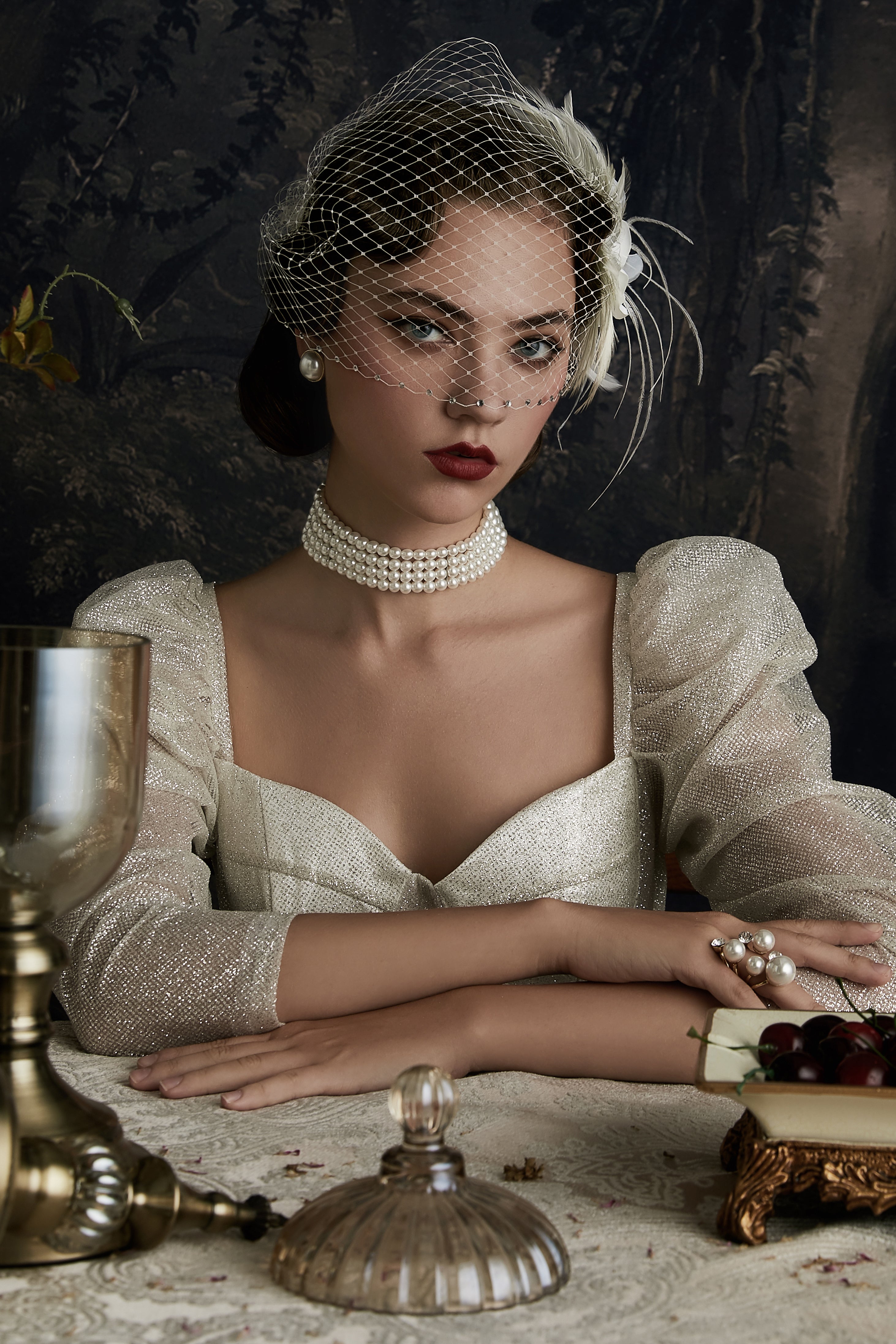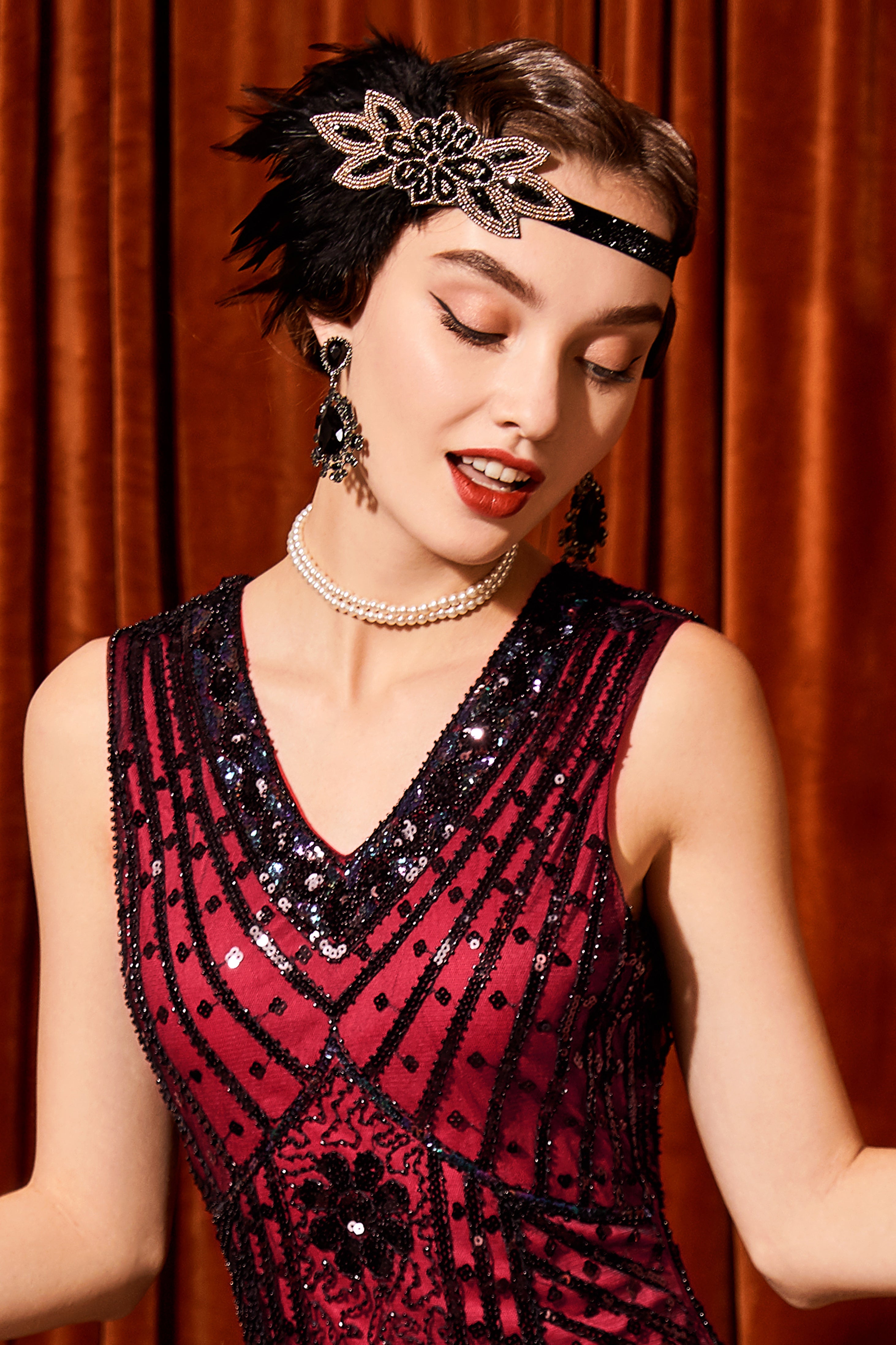 This sumptuous piece of jewelry features a retro-elegant yet slightly modern style that complements the lavish garments, reminiscent of the roaring 1920s.