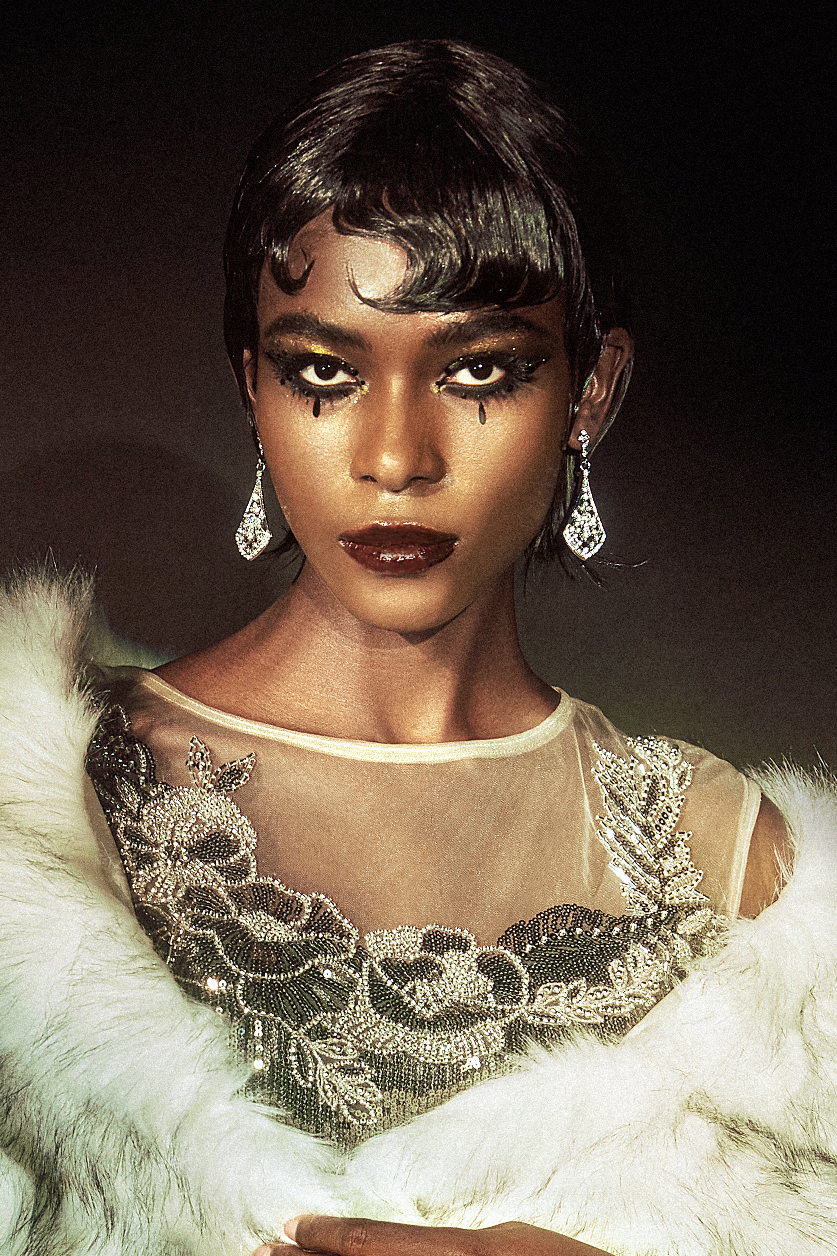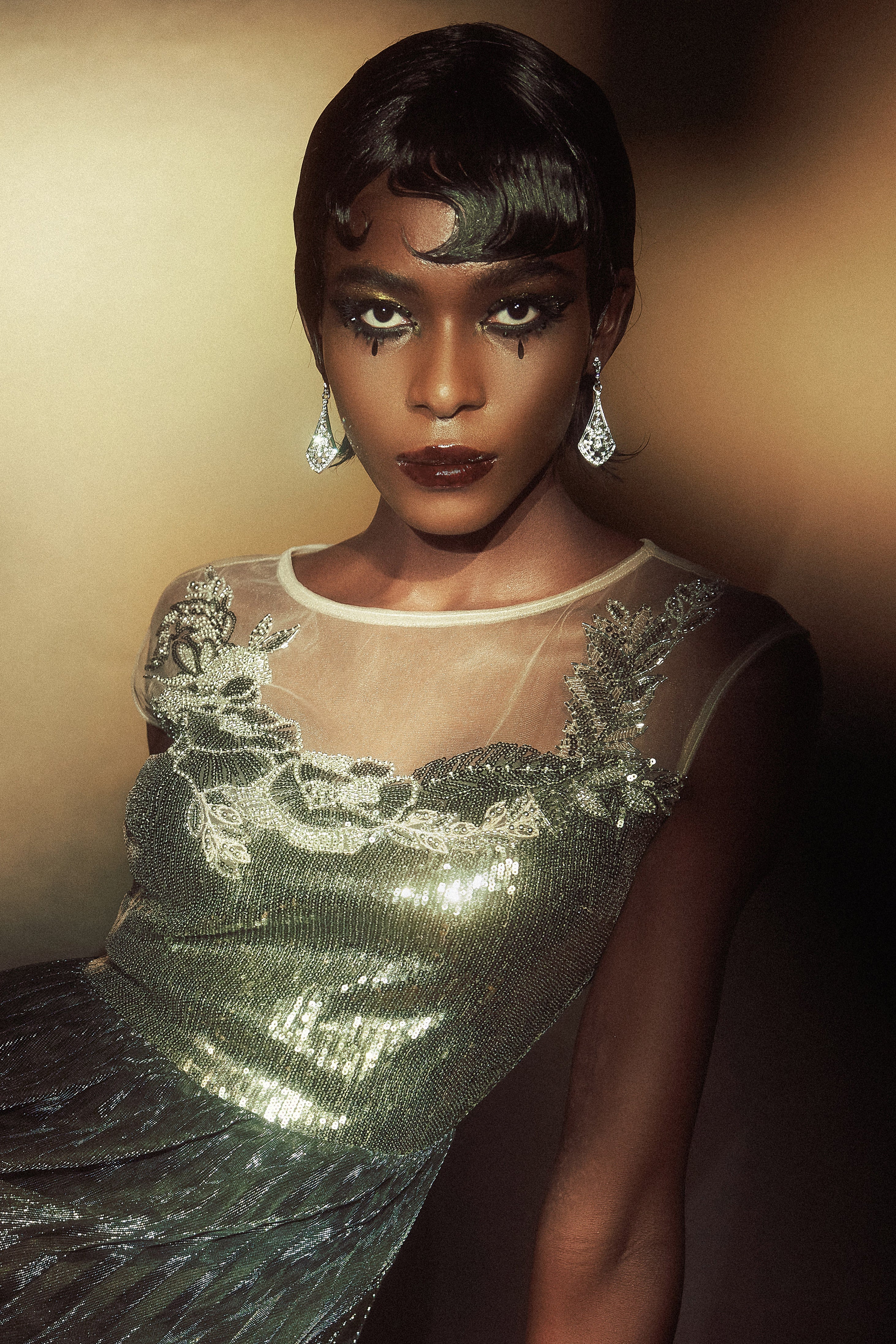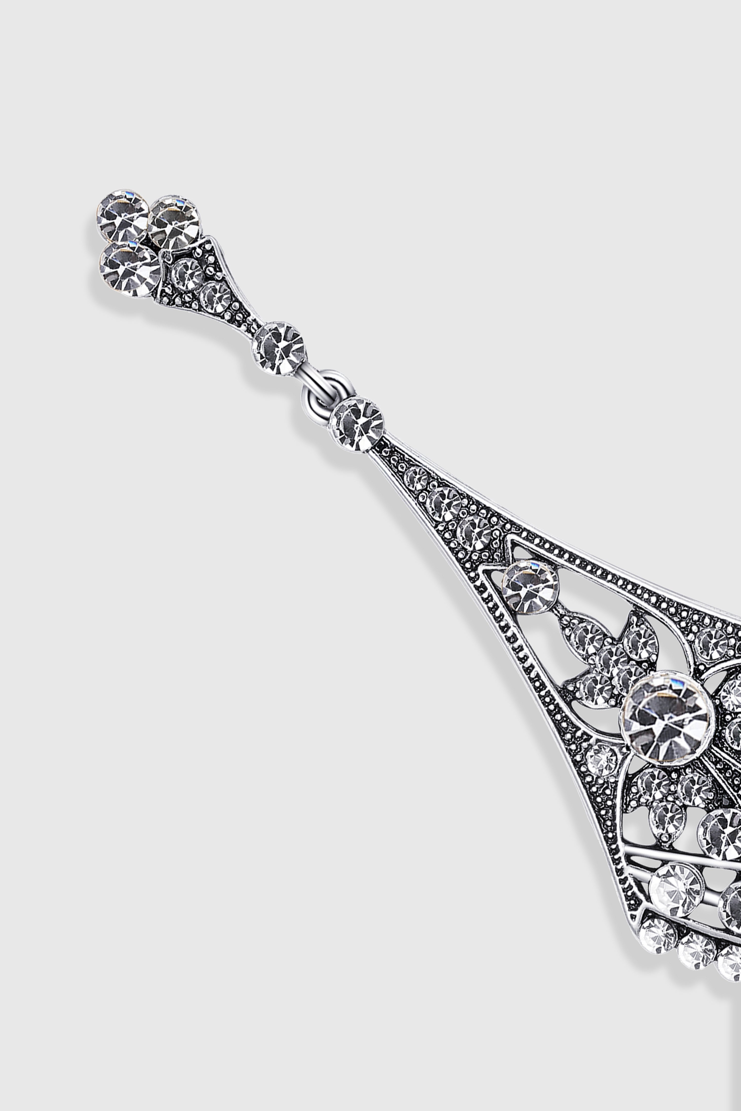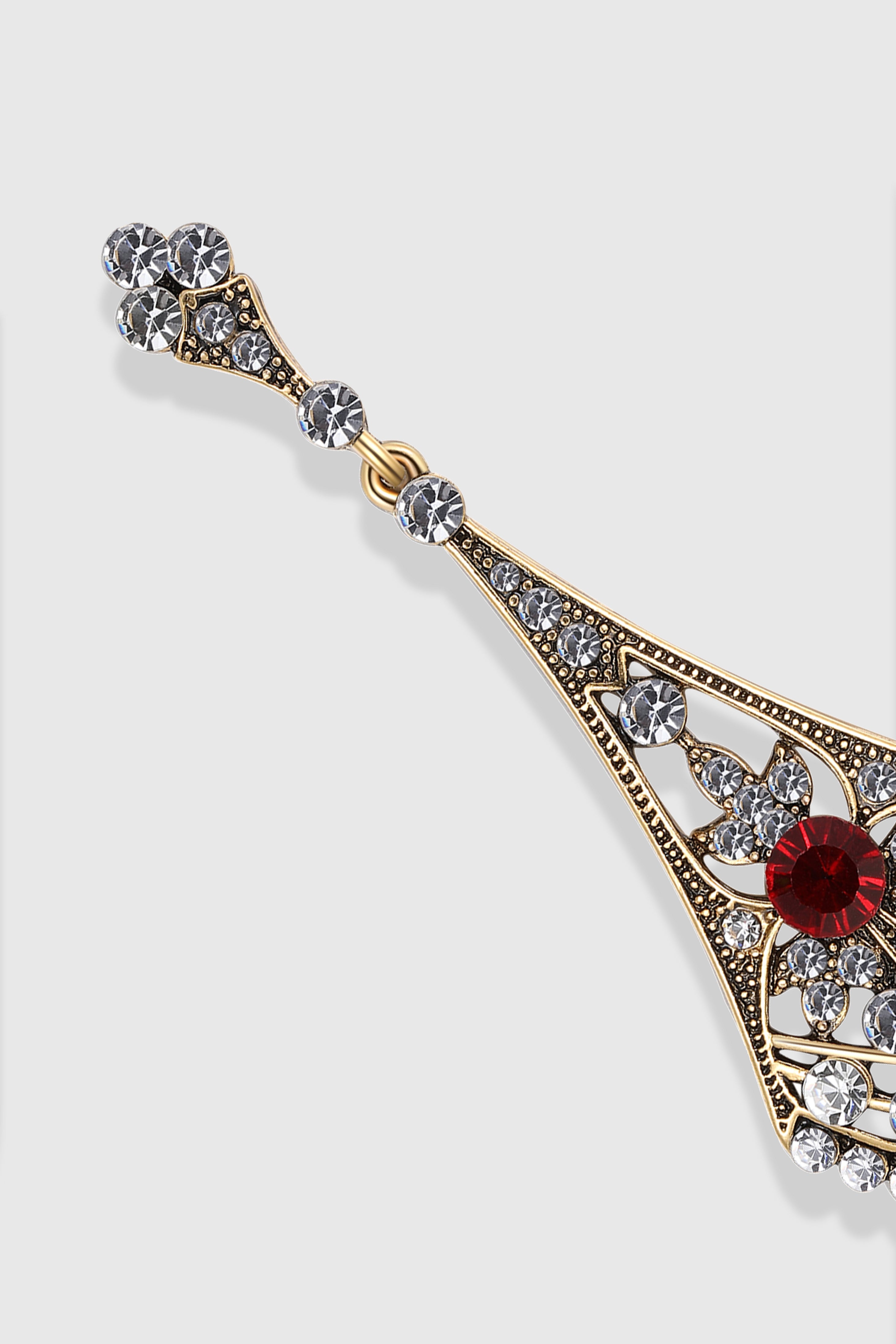 This sumptuous piece of jewelry features a retro-elegant yet slightly modern style that complements the lavish garments, reminiscent of the roaring 1920s.