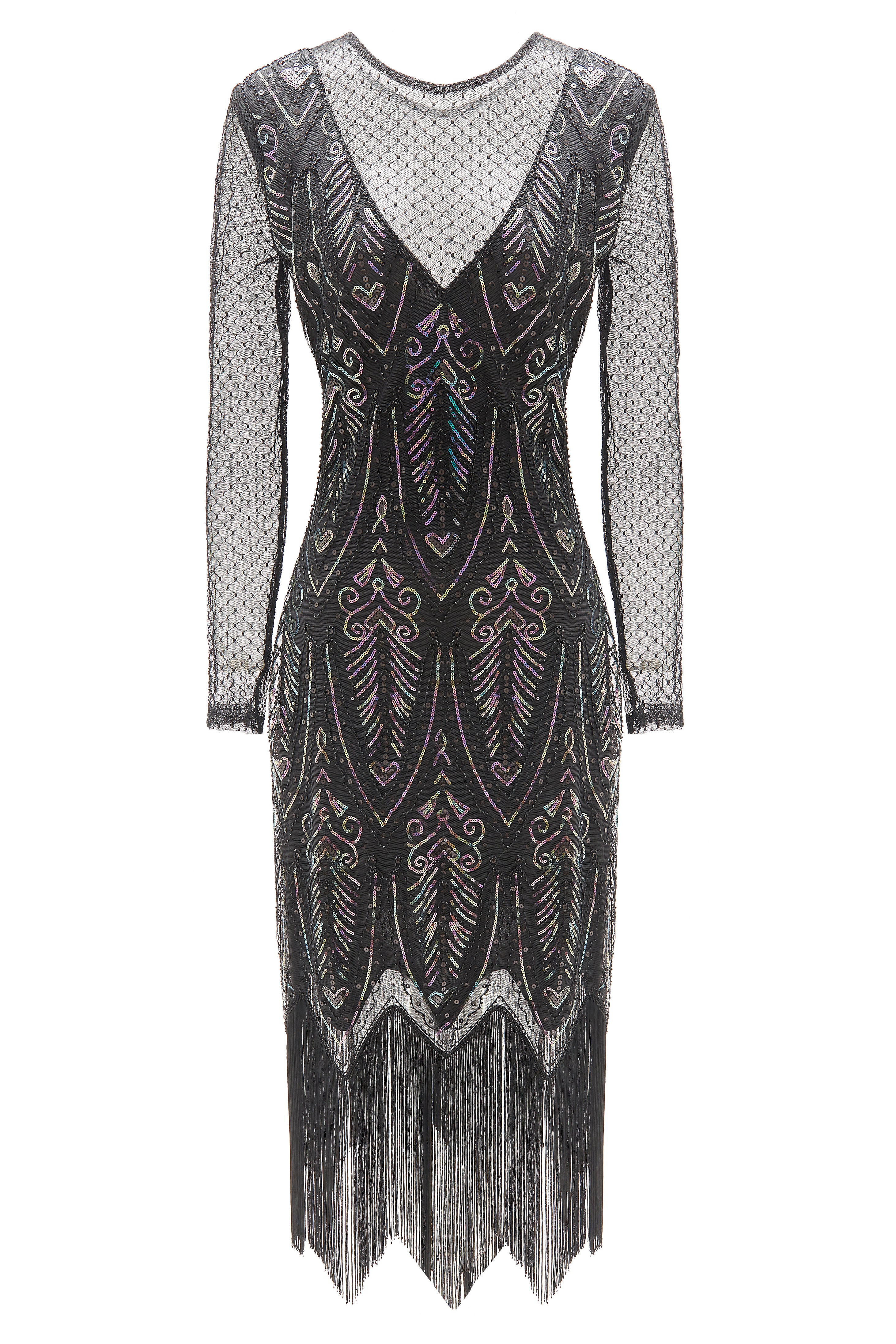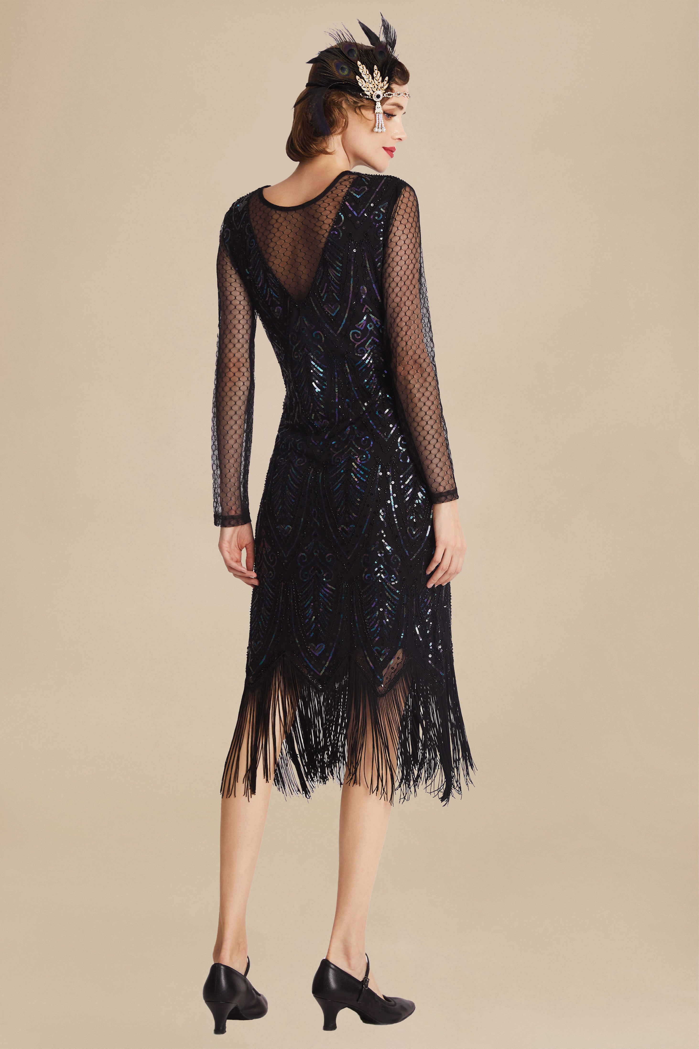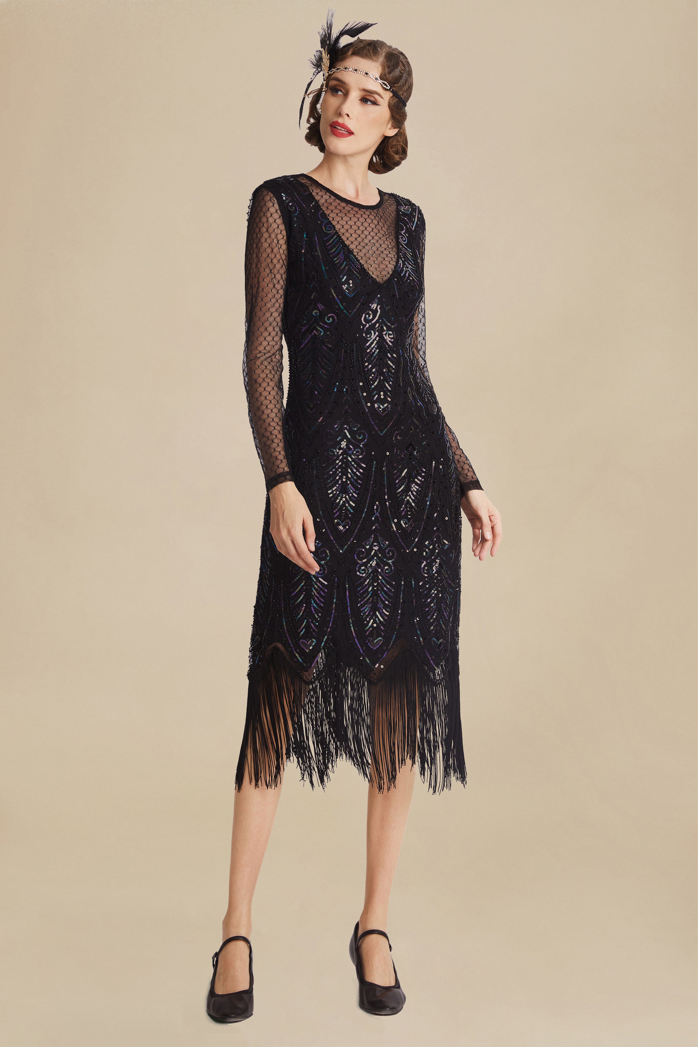 Step into the spotlight with this exquisite 1920s-inspired flapper dress. The sheer mesh neckline and sleeves offer a hint of allure, while the intricate sequin detailing creates a dazzling geometric pattern that shimmers with every move. The dress is finished with long fringes that sway gracefully, adding movement and vintage charm.