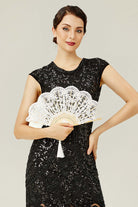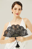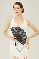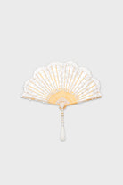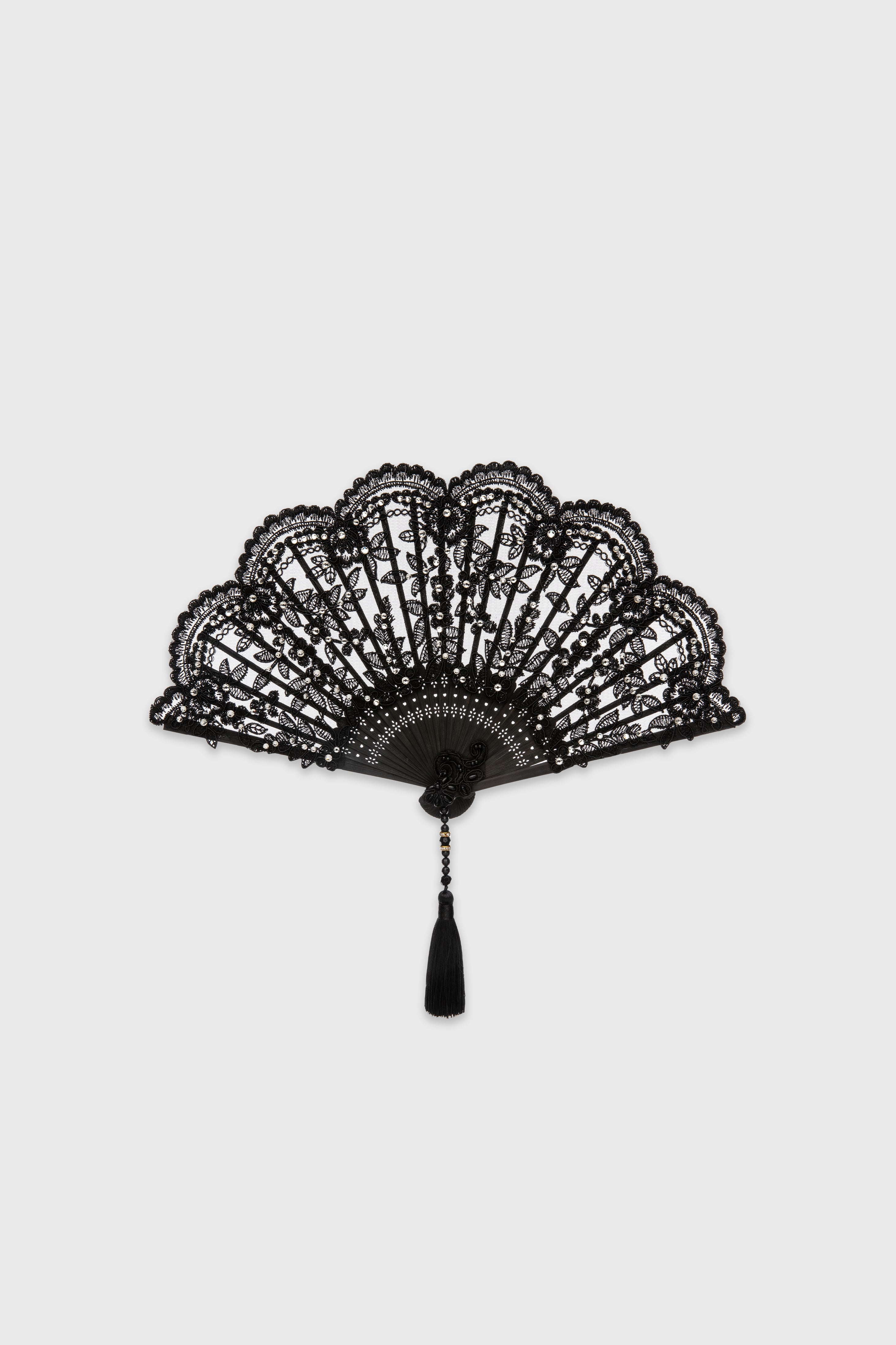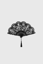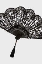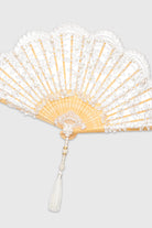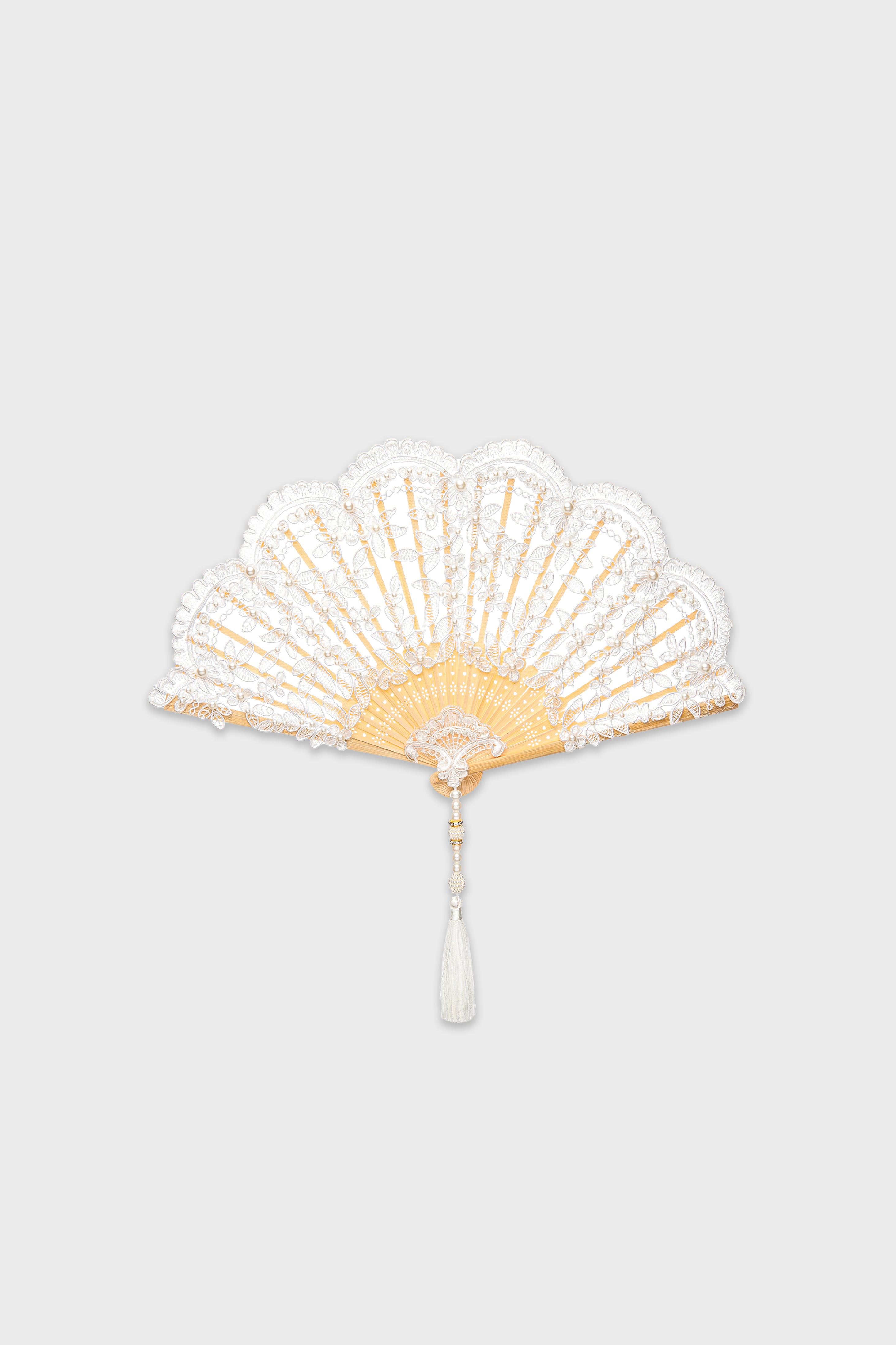Beautifully crafted with delicate lacework and scalloped edges, this fan brings sophistication and charm. The intricate design is paired with a decorative tassel for added refinement.