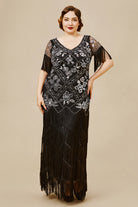 The eyecatching bold v-neck and tulle coverage design create a unique style for your vintage look. Elegant floor-length dress adorned with shimmering sequins and beading.