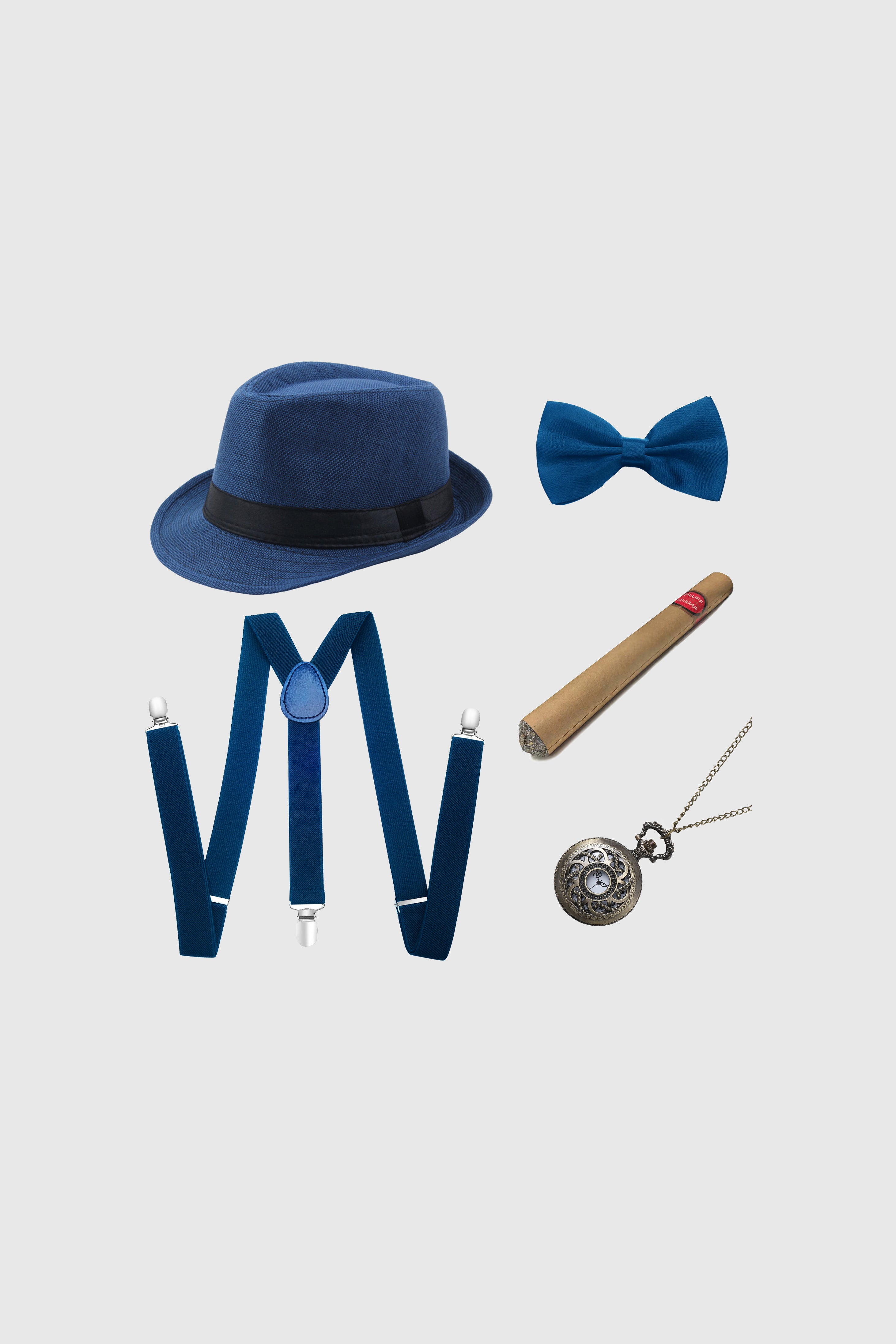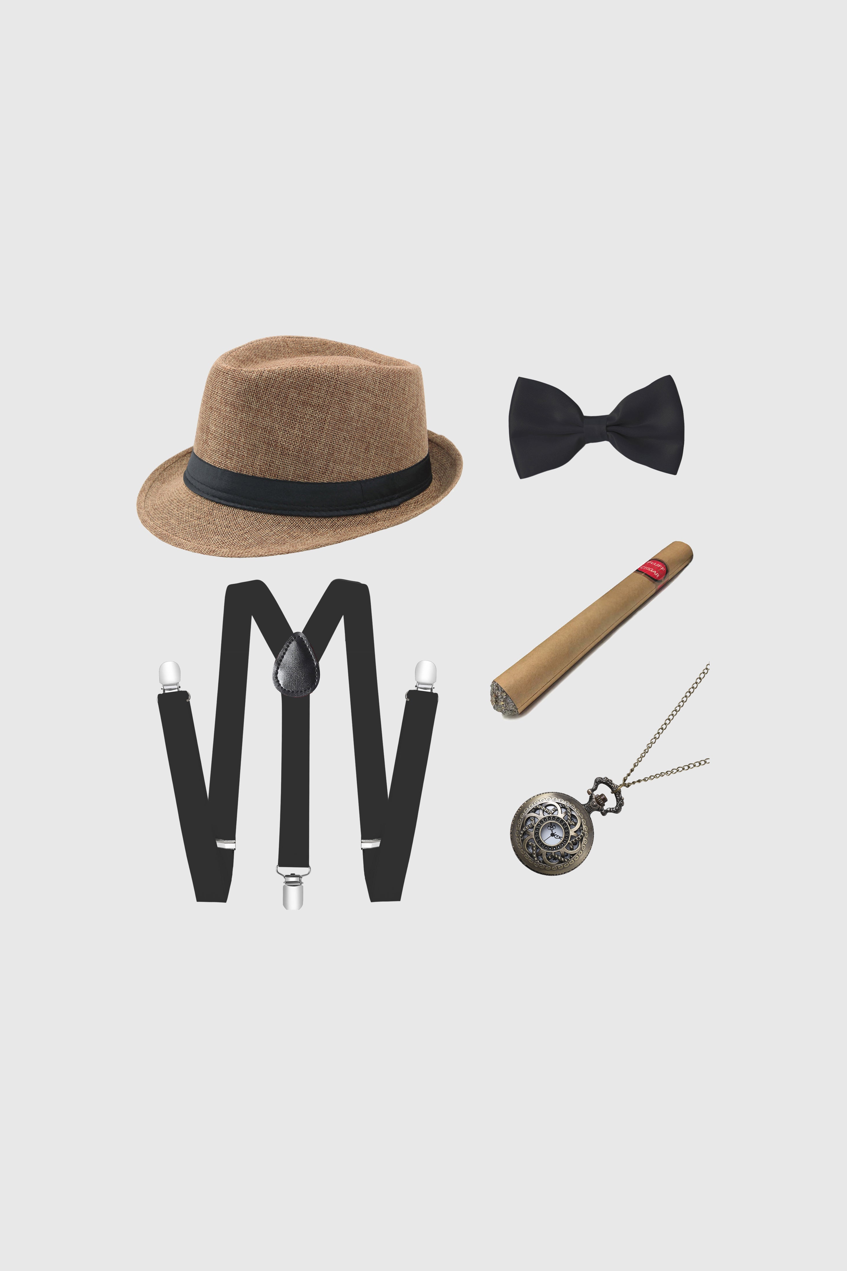 - Includes 1 x Hat, 1 x Suspenders, 1 x Pre-Tied Bow Tie, 1 x Plastic Cigar, 1 x Pocket Watch
