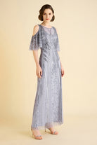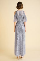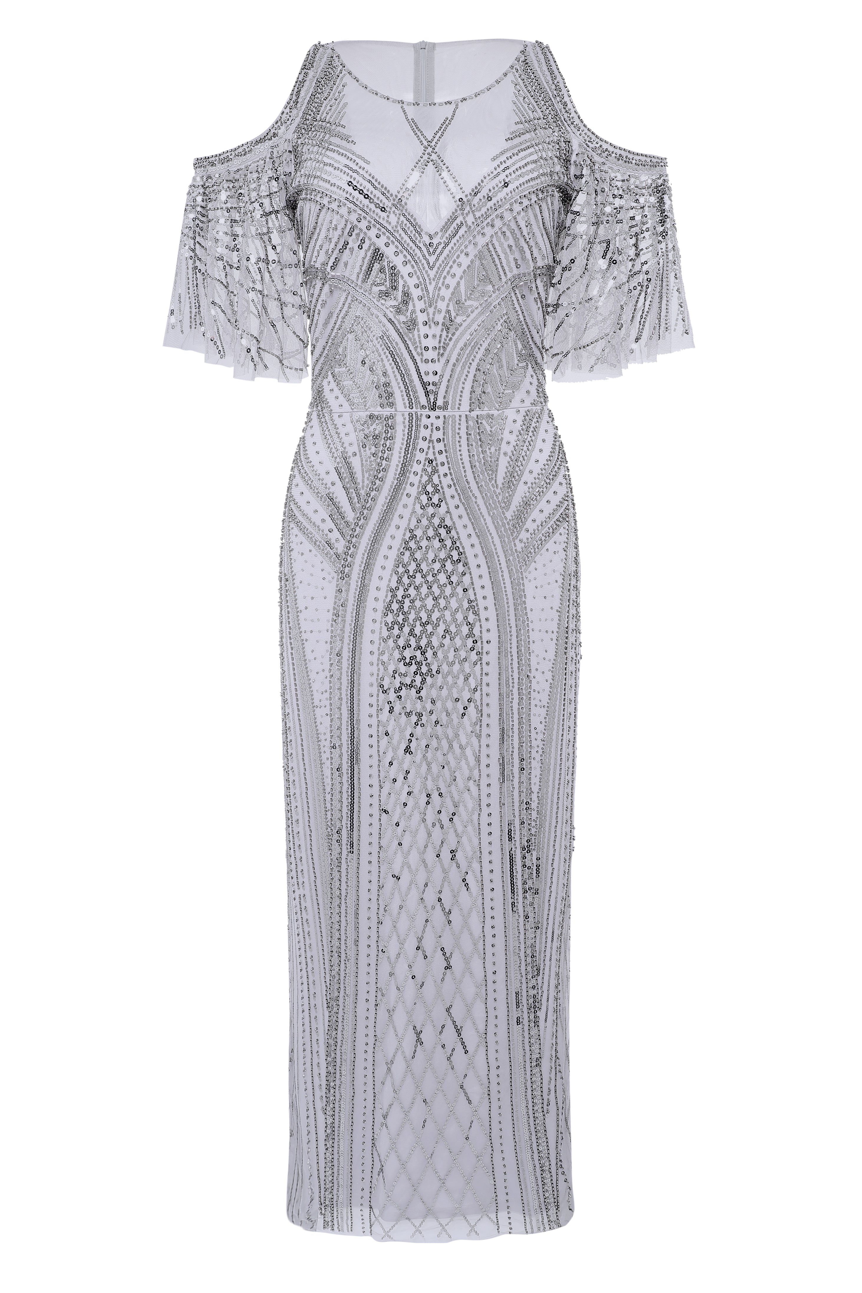 The dress is adorned with slimming curved linear patterns and intricate geometric beadwork, creating a dazzling effect that enhances your silhouette. The see-through neckline exudes sophistication and subtle allure, while cold-shoulder flutter sleeves add a touch of romantic elegance. The flowing A-line silhouette flatters every figure, and the intricate beadwork on soft tulle shimmers with every movement.