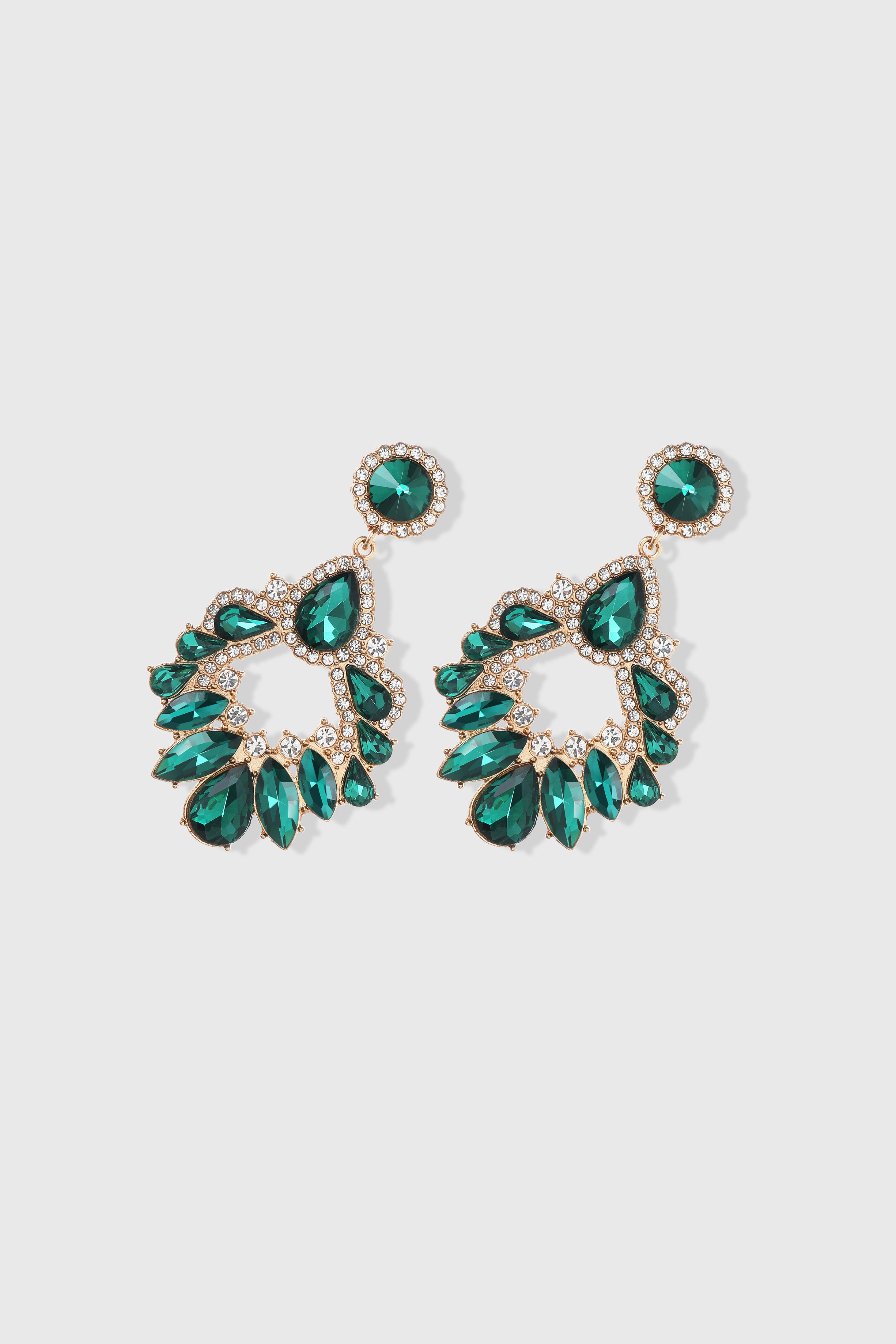 The teardrop and round-cut crystals are beautifully framed by a delicate halo of clear rhinestones, adding an extra touch of sparkle. Set in a luxurious gold-tone metal, these earrings offer a perfect balance of elegance and glamour.